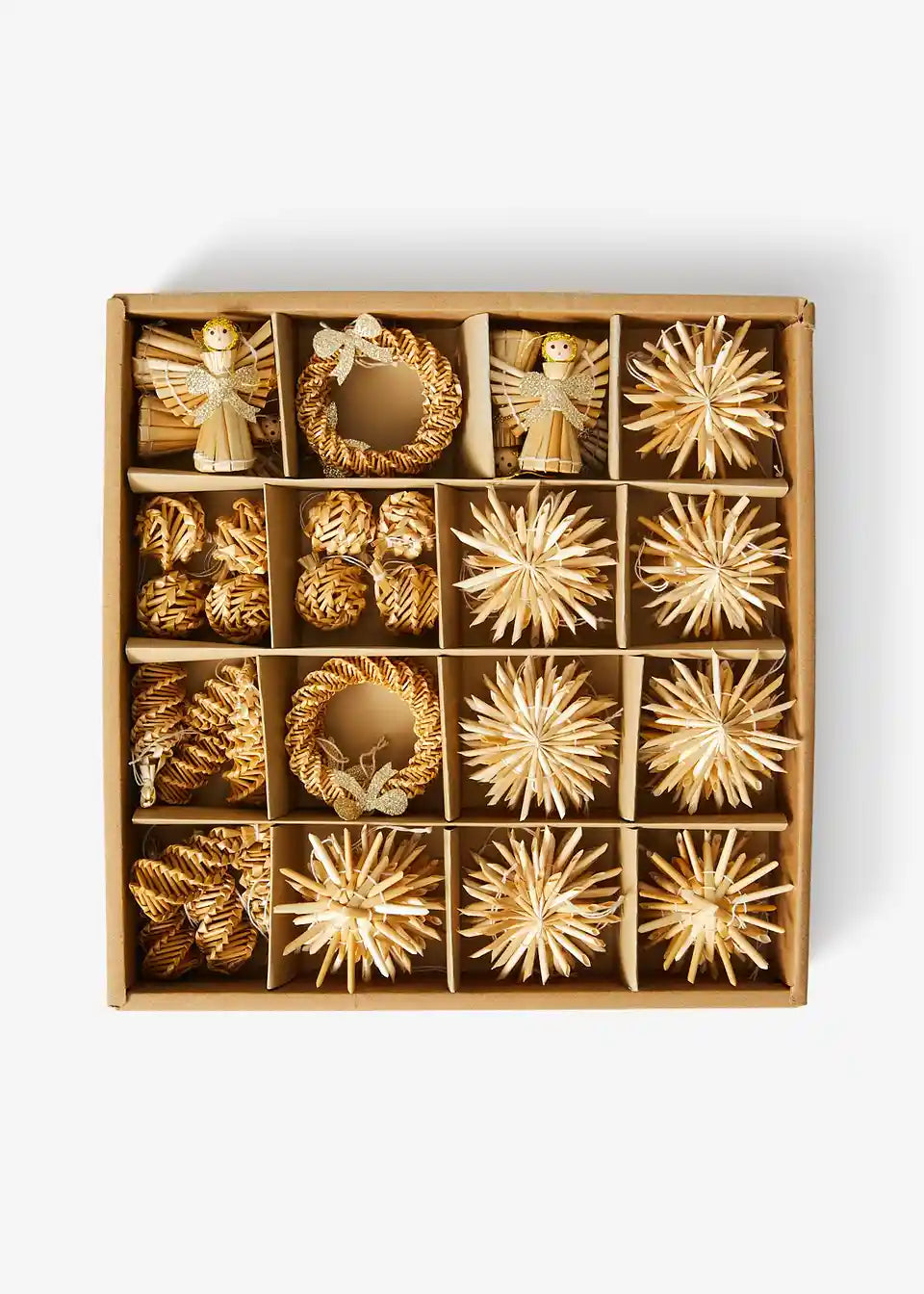 Hol Dir den Sternenhimmel ins Haus! Unser 56er Set aus Strohsternen und weihnachtlichen Figuren in verschiedenen Formen, kommt mit praktischem Band zum Aufhängen. Perfekt, um Deinen Weihnachtsbaum festlich zu schmücken.