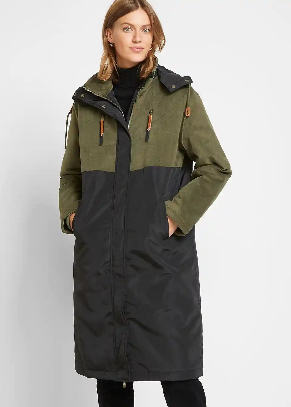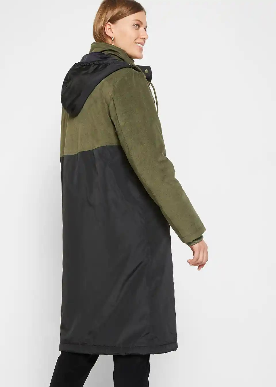 Long-Parka mit Kapuze und Materialmix, gerade geschnitten