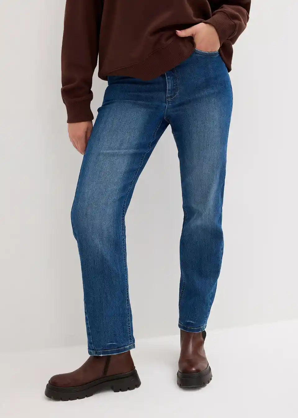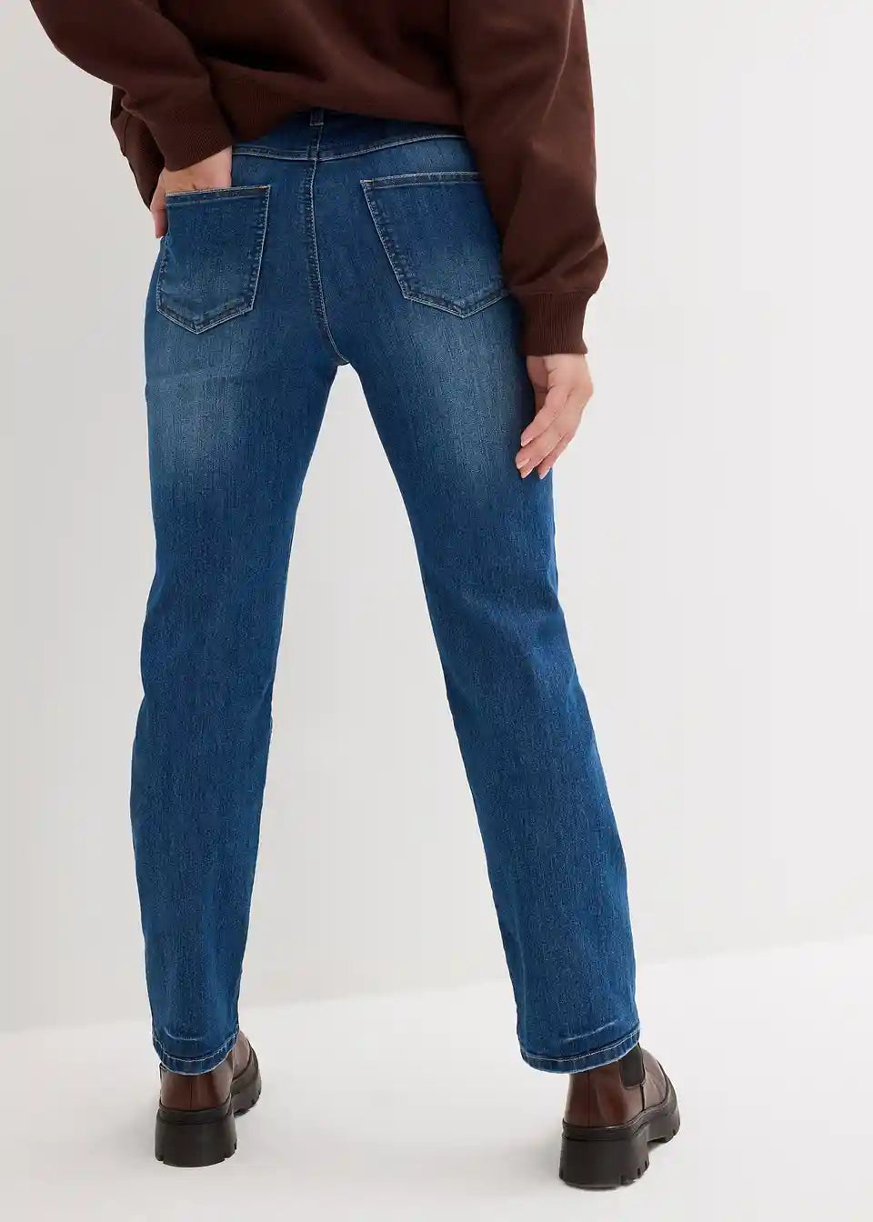 Gerade geschnittener Jeans bietet der Figur einen Schlankeffekt durch vorverlegte Seitennähte
