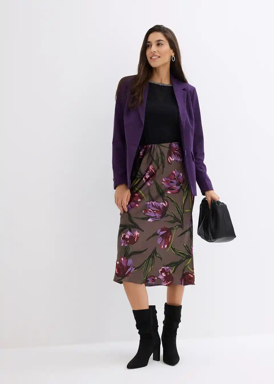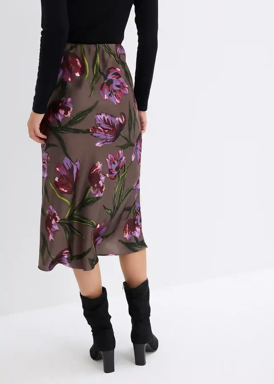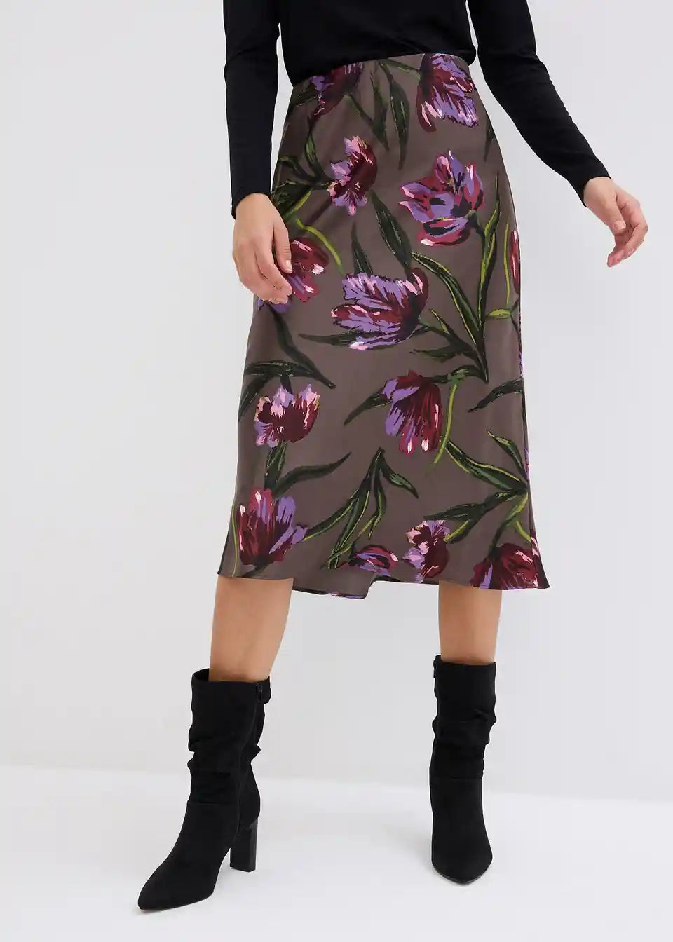 Schön glänzend, am obenrum etwas körpernäher, dann schön schwingend. Die Grundfarbe ist für mich nicht grau, eher dunkel (grau)braun. Bequemes breites Gummiband. Ein tannengrünes oder bordeaux rotes Oberteil passt gut dazu. Im Winter mit Stiefeln. Klasse.