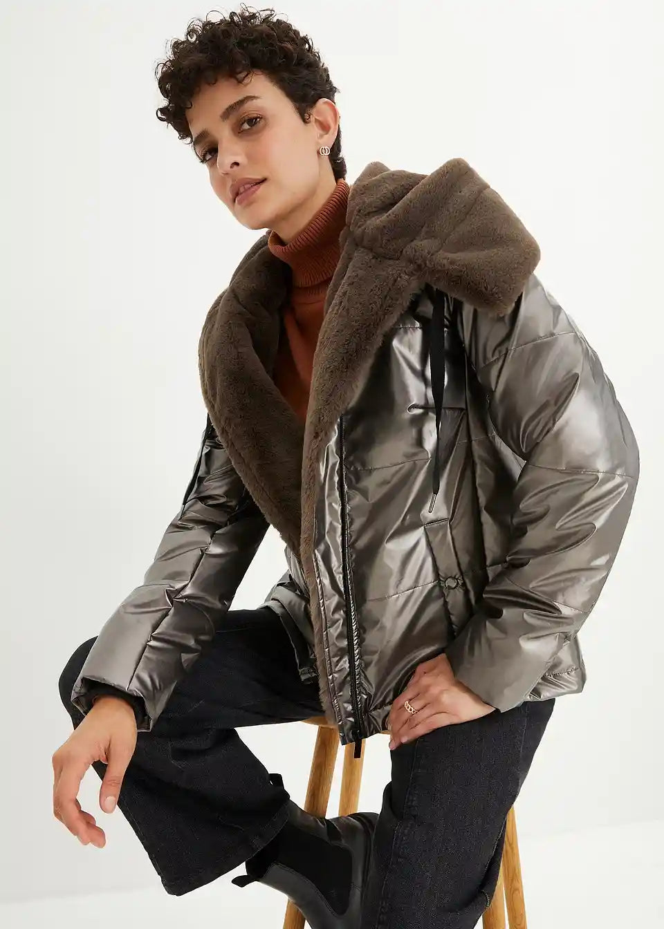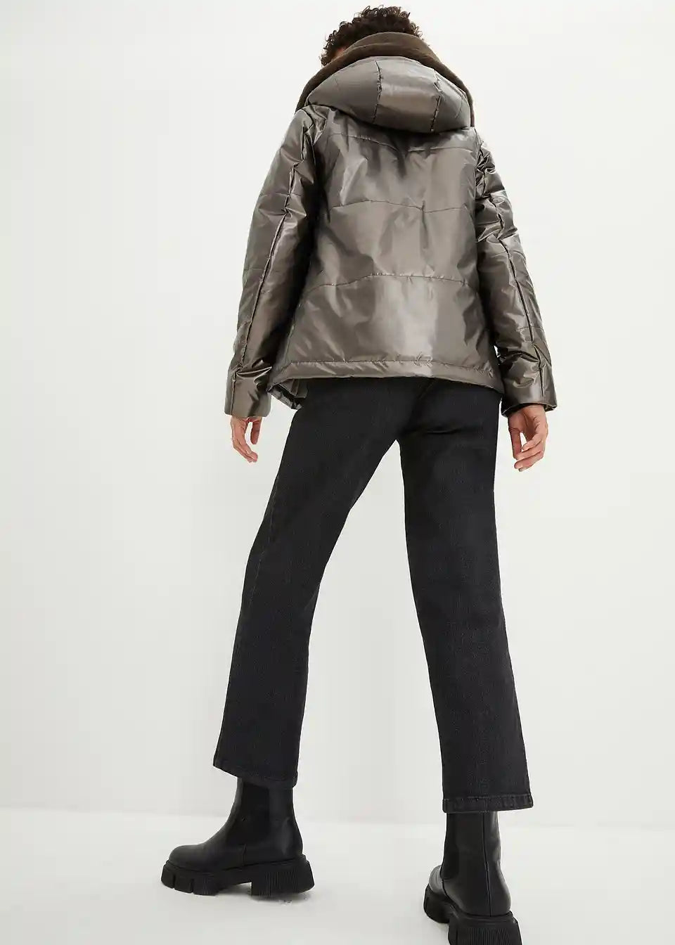Moderne Steppjacke aus glänzendem Material und Fellimitat-Kapuze