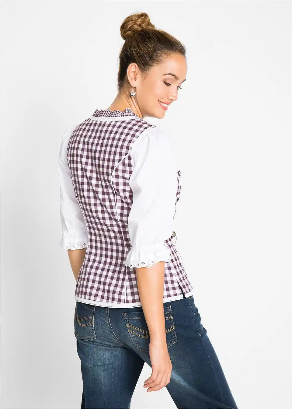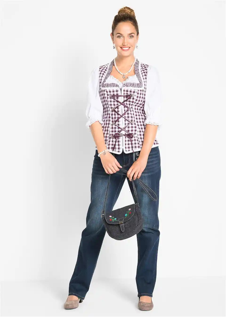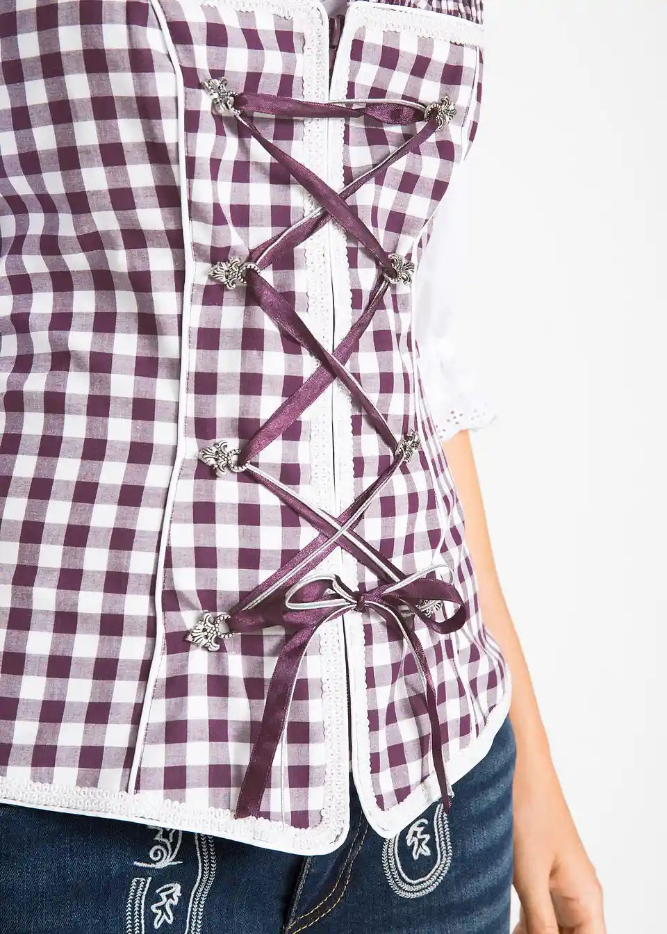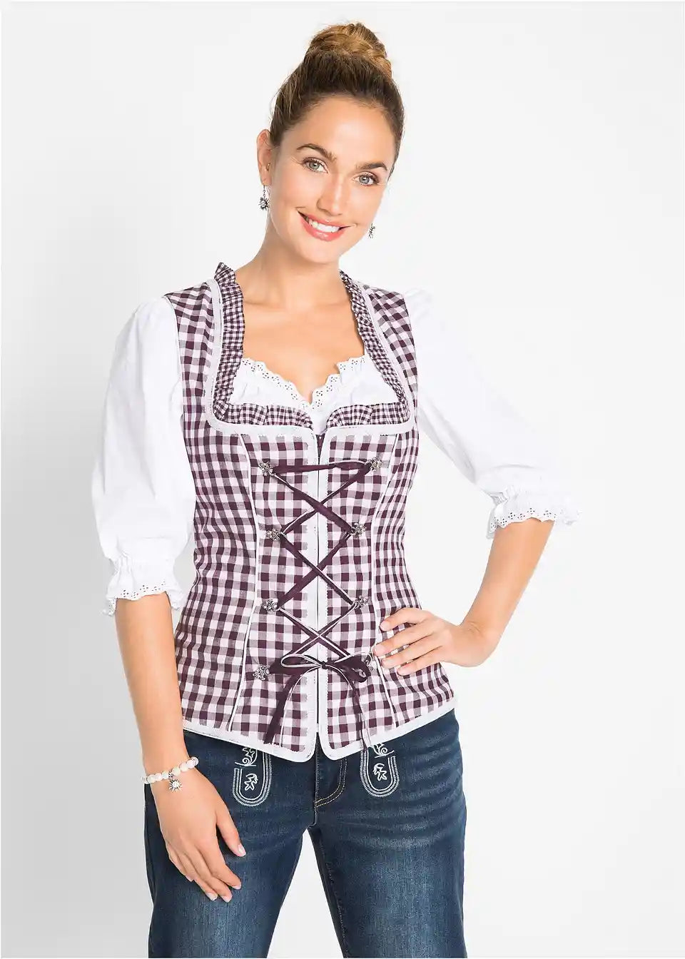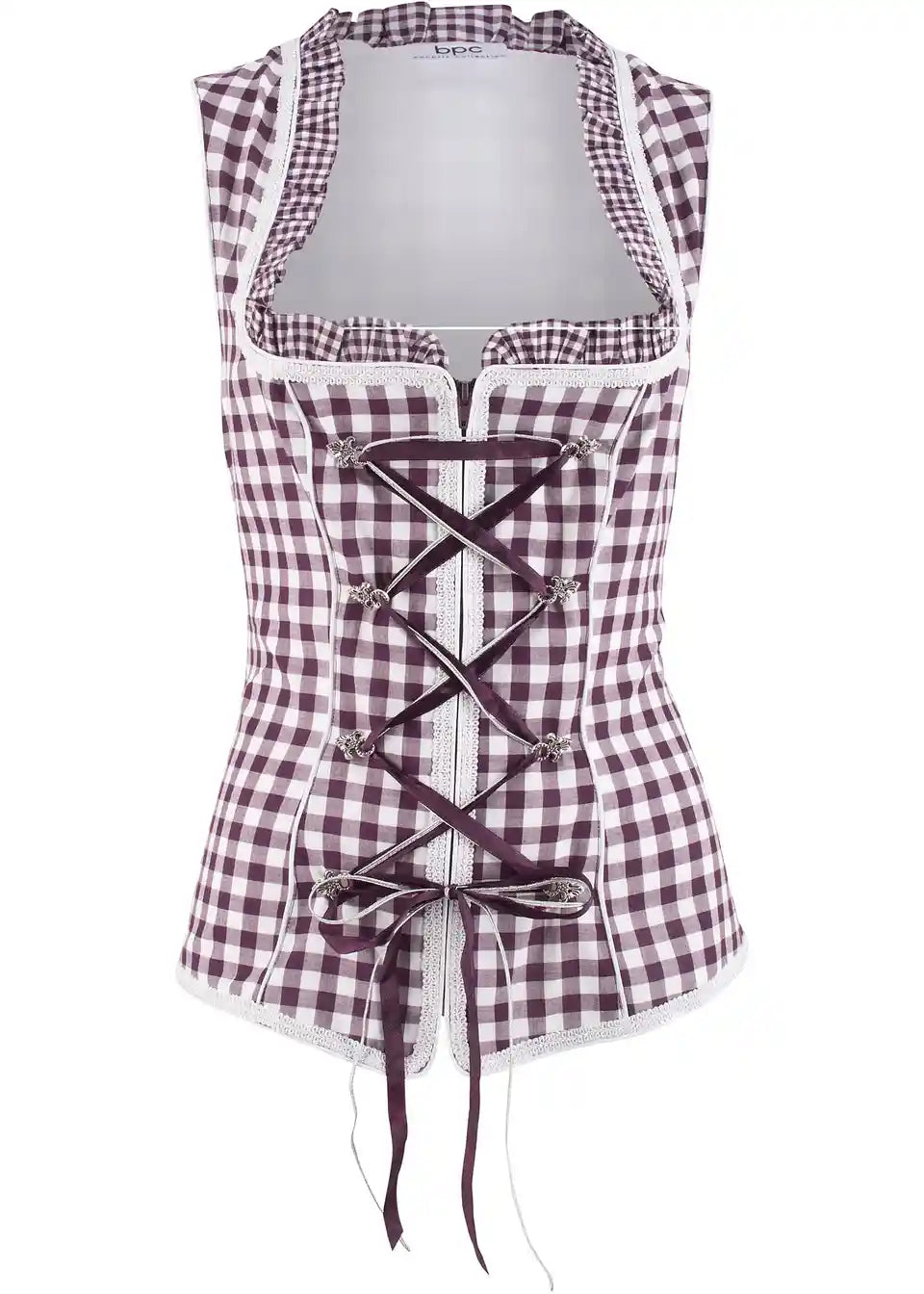 Diese Trachten Korsage von bpc ist ein klassischer Begleiter zur Dirndlbluse. Sie zeichnet sich durch ein hübsches Karomuster und eine verspielte Paspelierung aus. Eine feine Rüschenkante ziert den herzförmigen Ausschnitt des ärmellosen Modells.Vorne lässt sich das Mieder mit einem Reißverschluss schließen und mit einer Schnürung individuell binden. Dekorative Ösen sorgen für den echten Wiesn-Charakter.