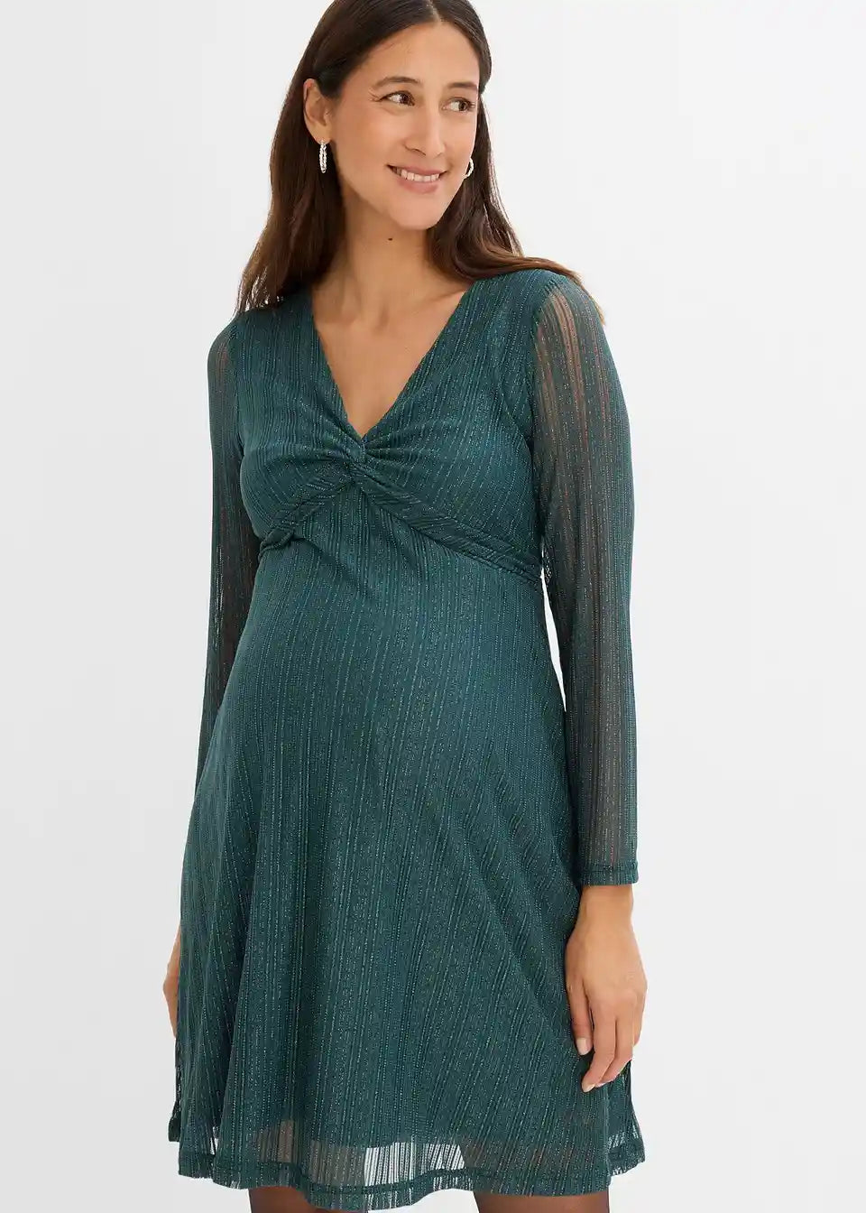 Festliches Umstandskleid mit V-Ausschnitt und Knotendetail. Durch den hohen Stretch Anteil bietet diese Kleid direkt mehr Komfort und liegt angenehmen am Bauch an. Mit diskreter Stillfunktion zum wegschieben.