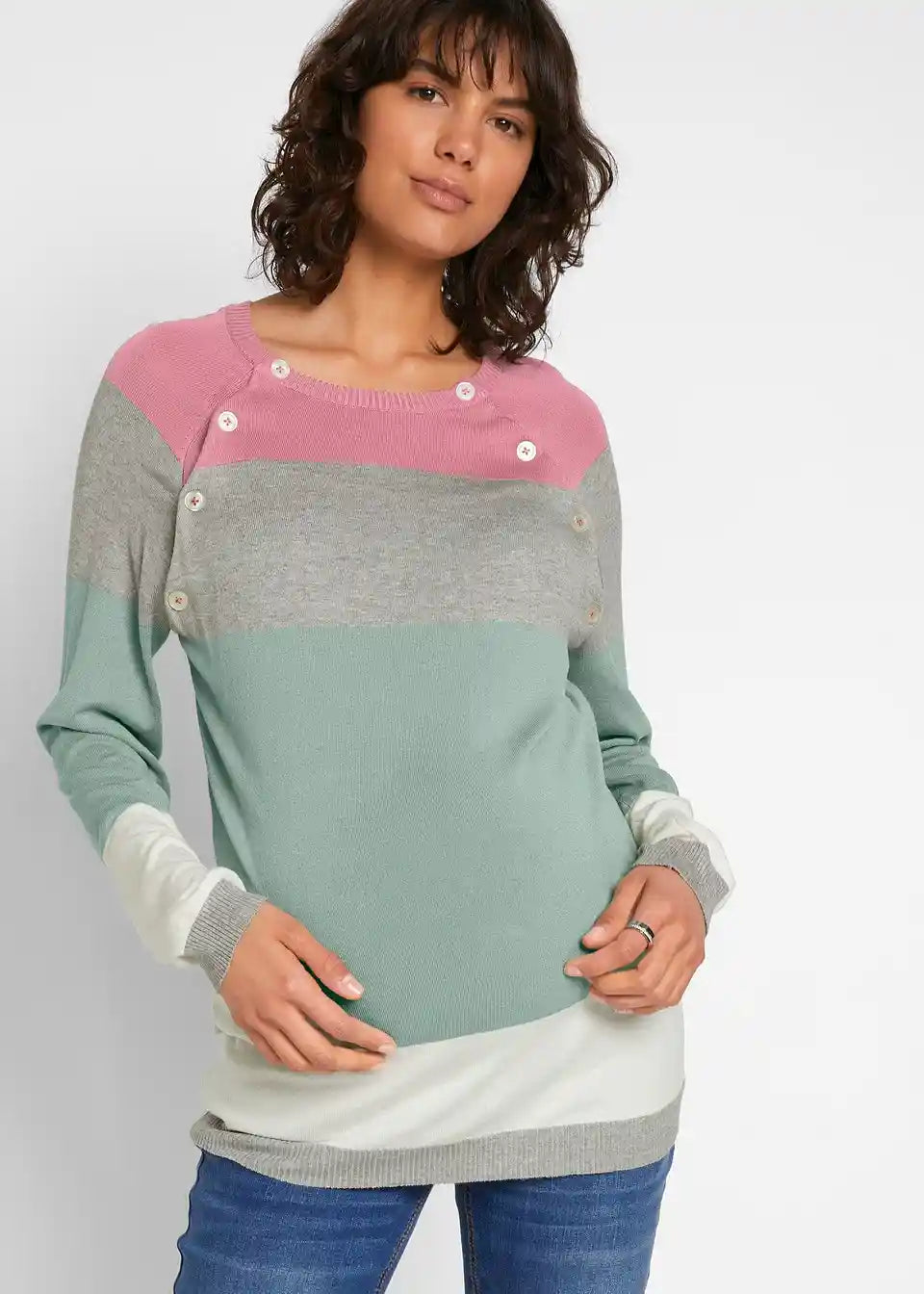 Gestreifter Umstandspullover mit Druckknöpfen und Stilleinsatz
