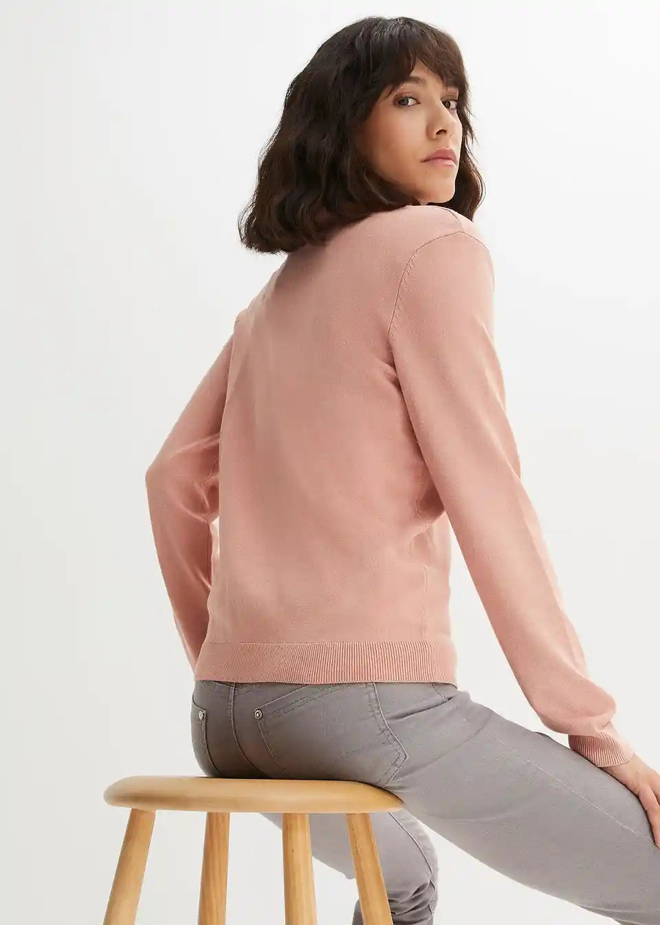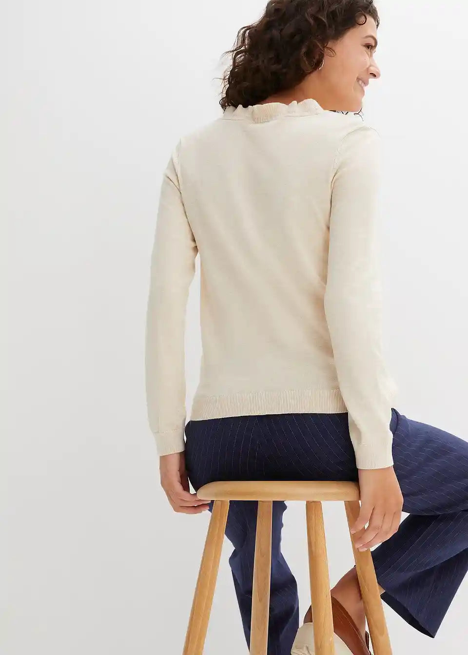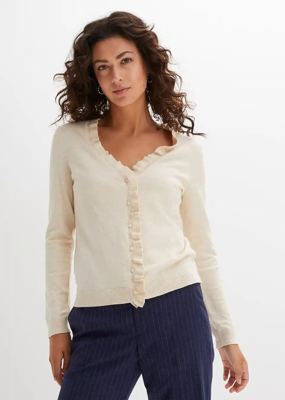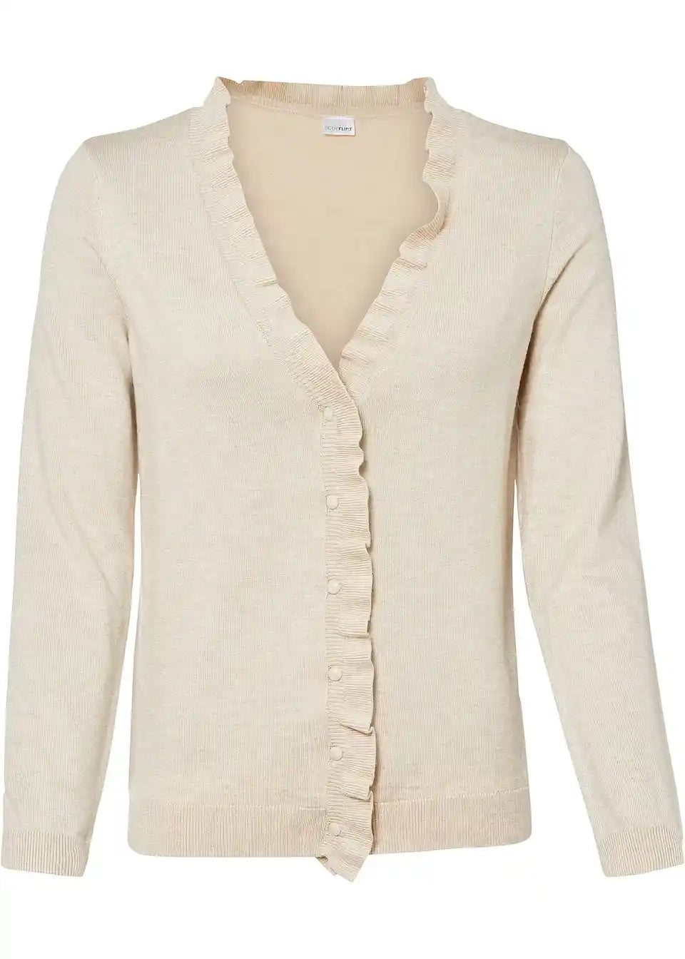 Kuschelige Strickjacke mit verspieltem Rüschenkragen.