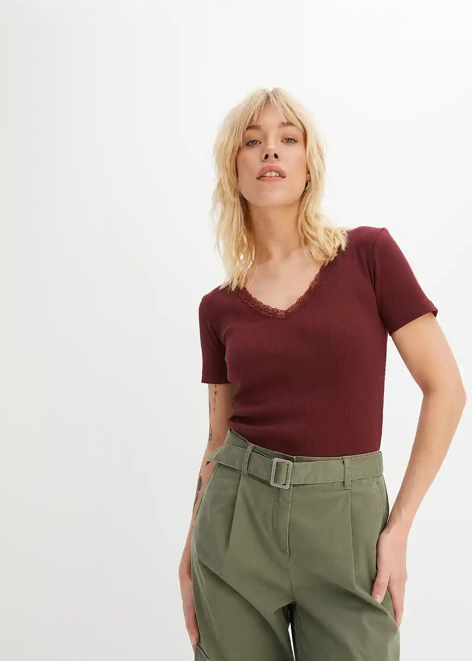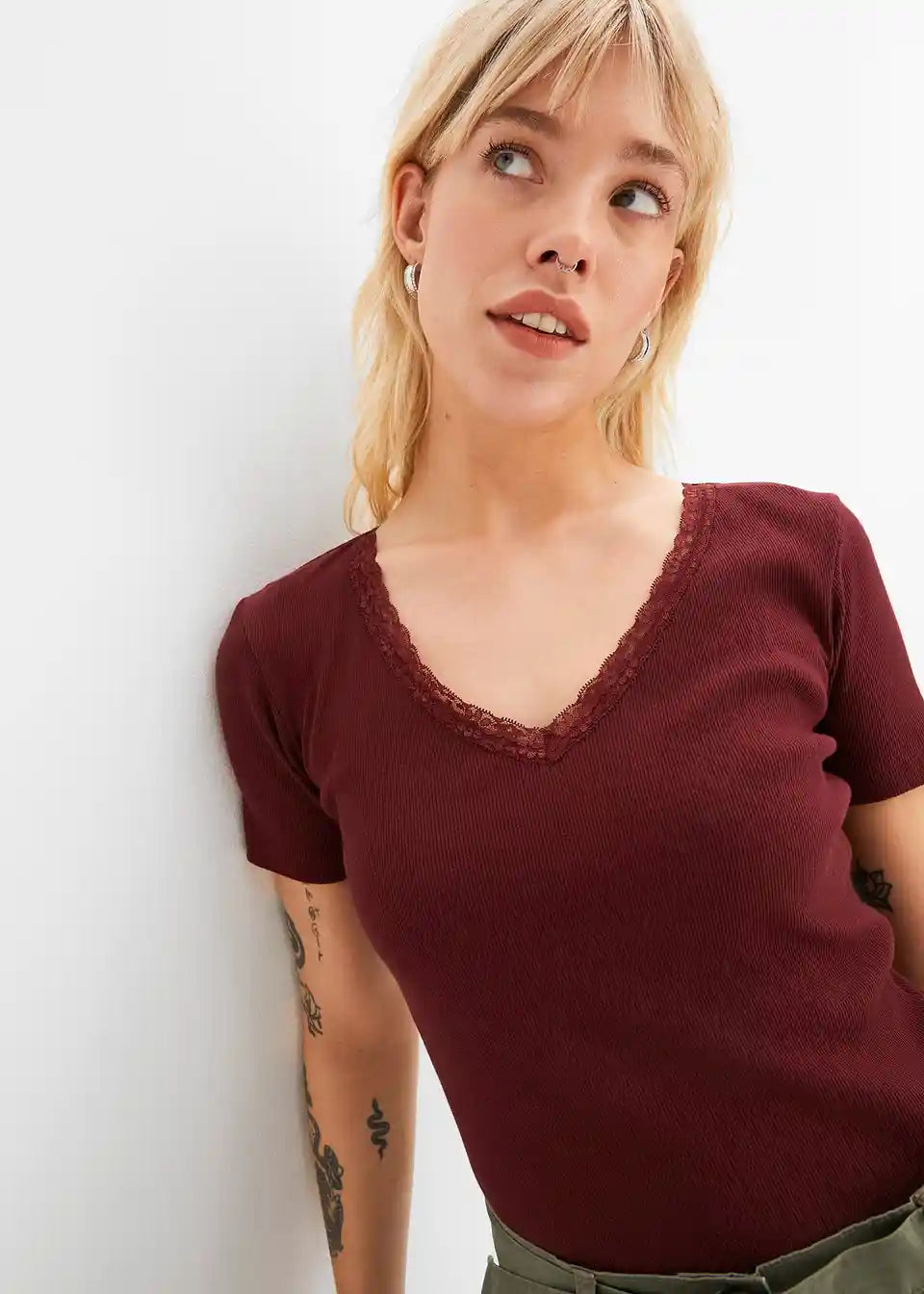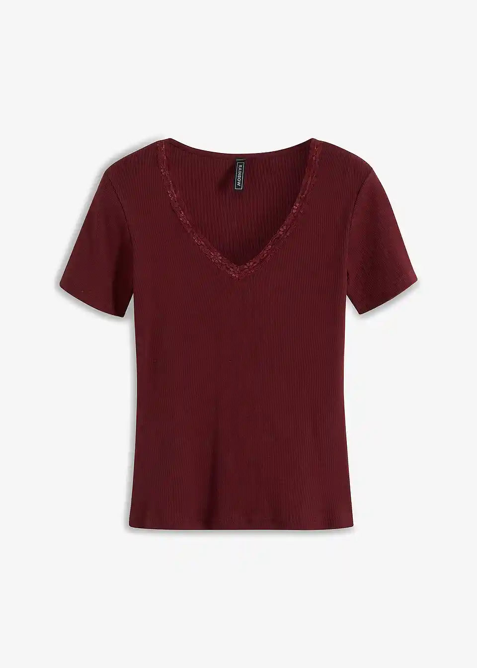 Attraktives Rippshirt mit tiefem Ausschnitt und Spitzenbesatz