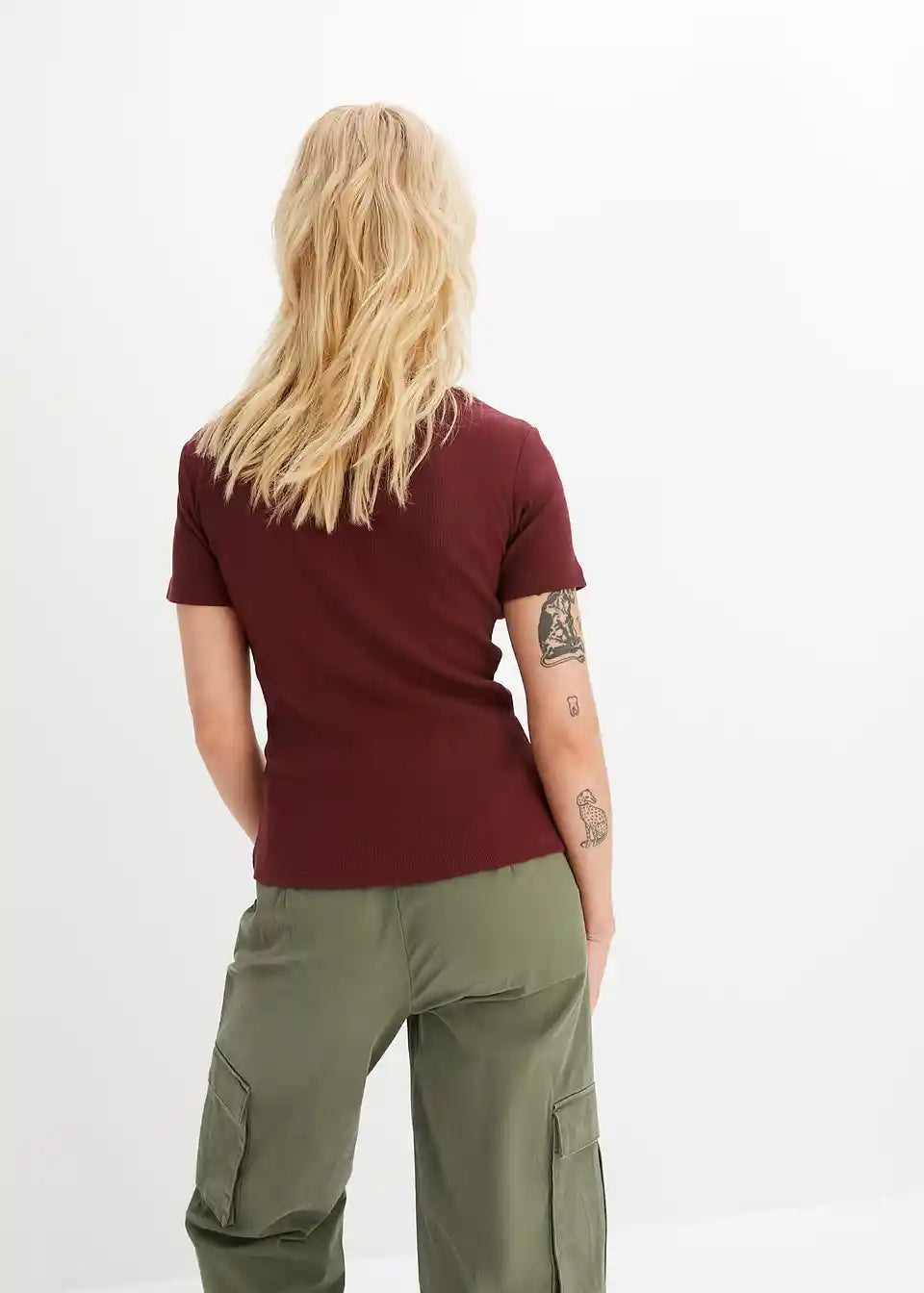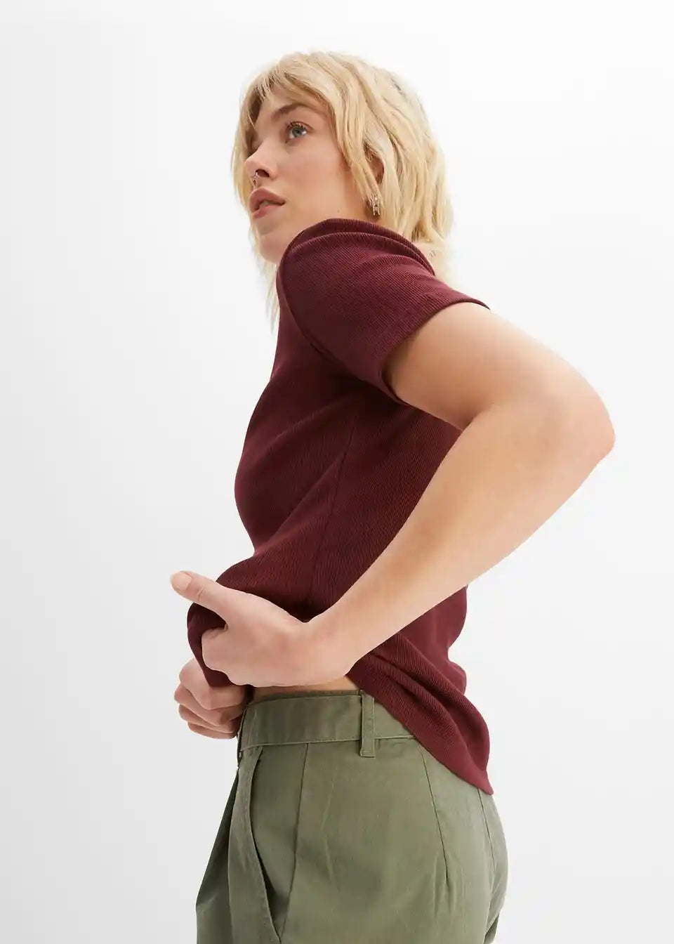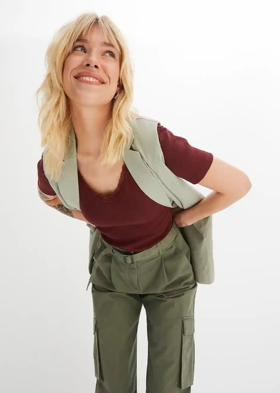 Attraktives Rippshirt mit tiefem Ausschnitt und Spitzenbesatz