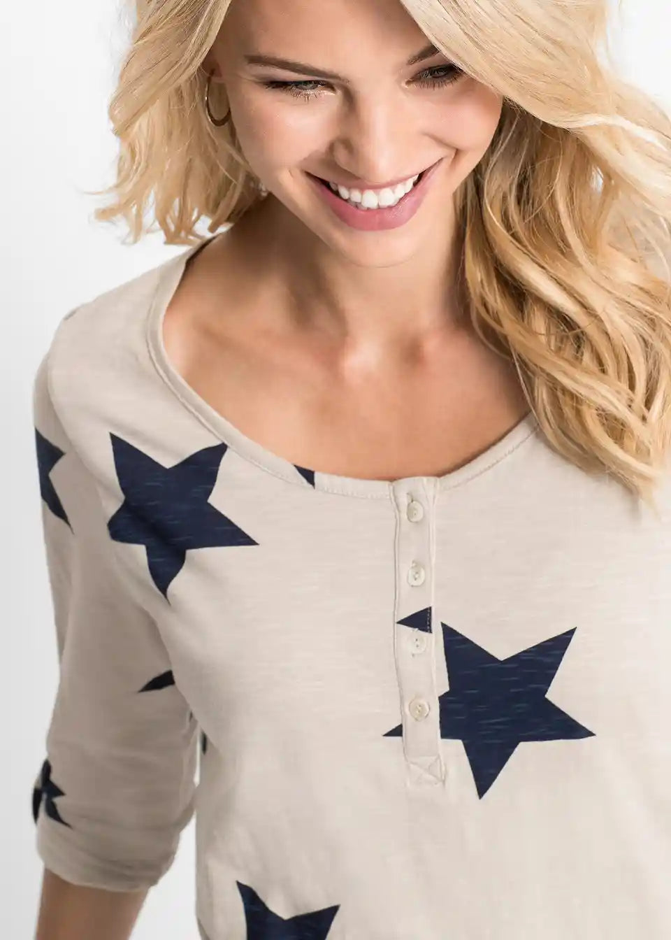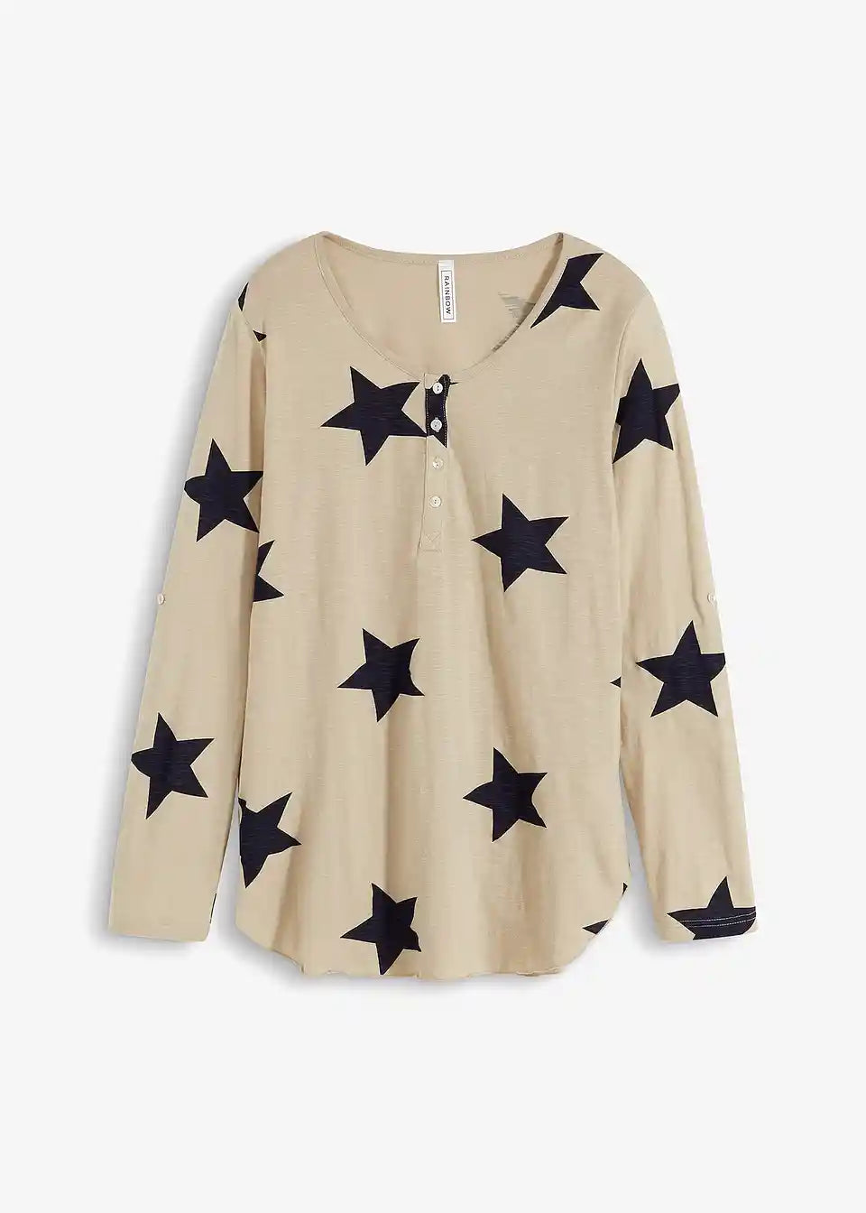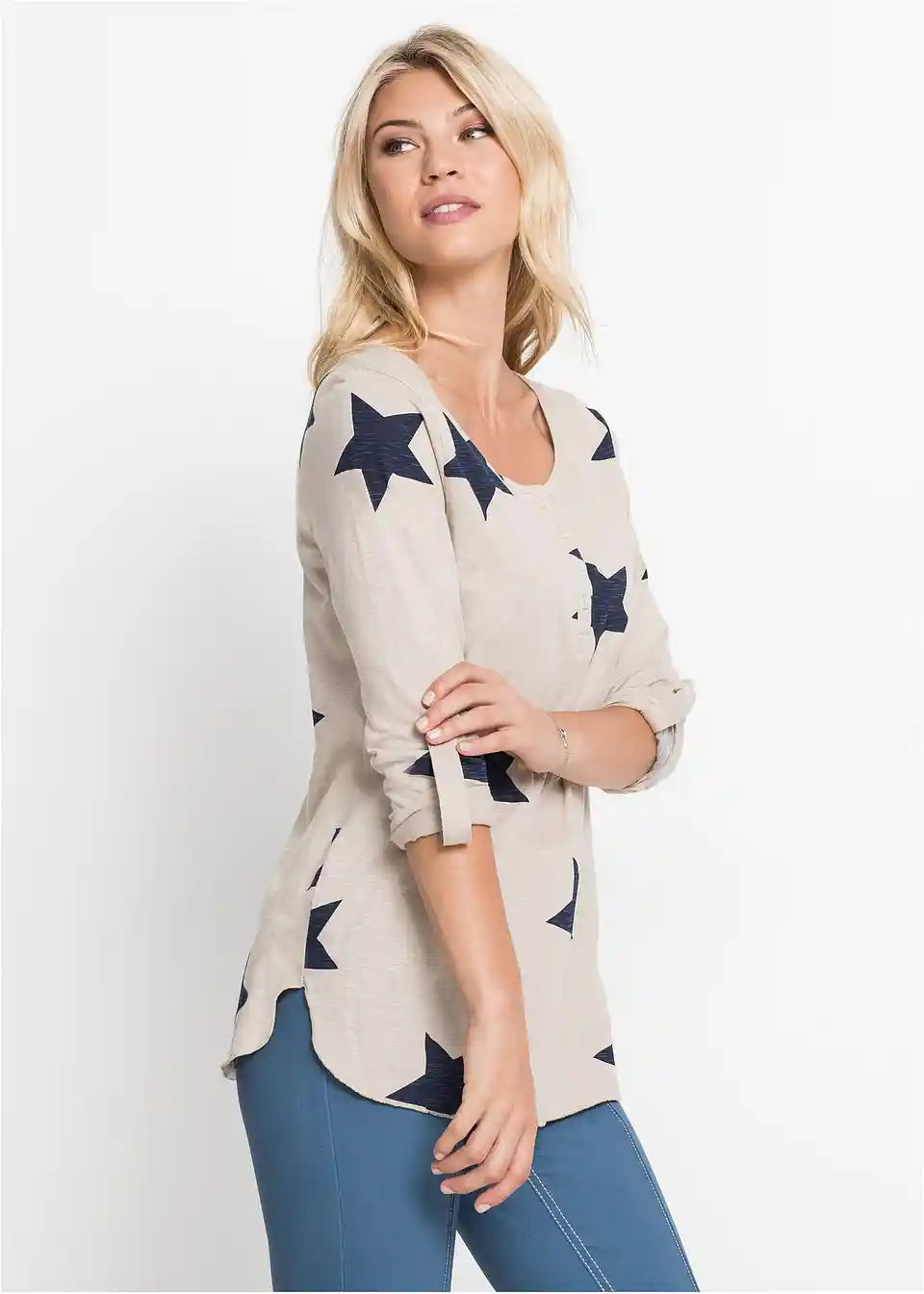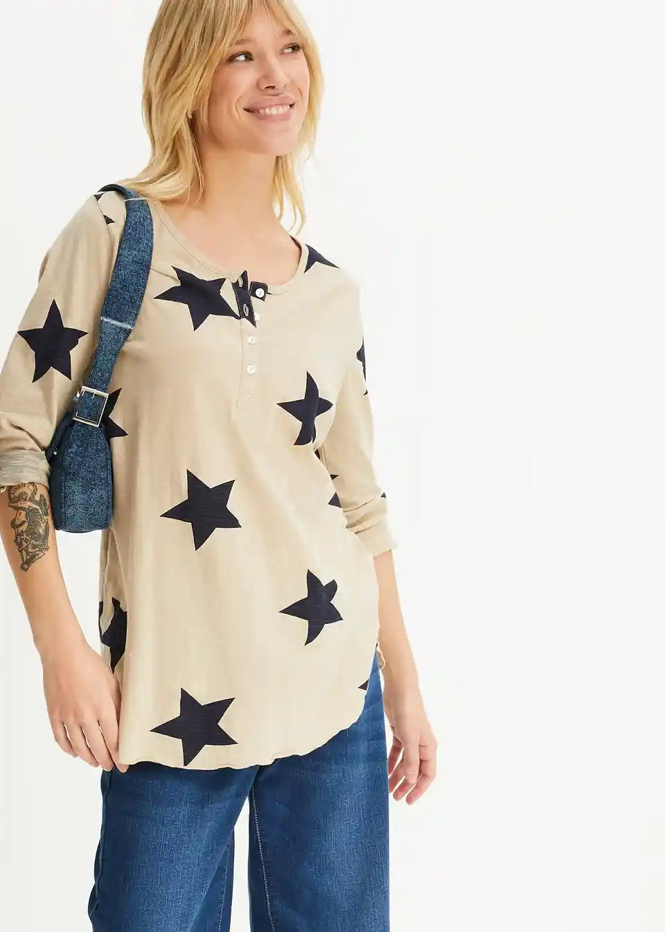 Dieses coole Shirt mit Alloverprint fügt sich super in lässige Styles ein. Die langen Ärmel des Shirts mit rundem Halsausschnitt und kleiner Knopfleiste lassen sich auf Wunsch hochkrempeln. Der Saum ist an den Seiten abgerundet und modisch geschlitzt.Zusammen mit einer weiten Jeans und Sneakers gelingt mit dem Print-Shirt ein trendstarkes Outfit.