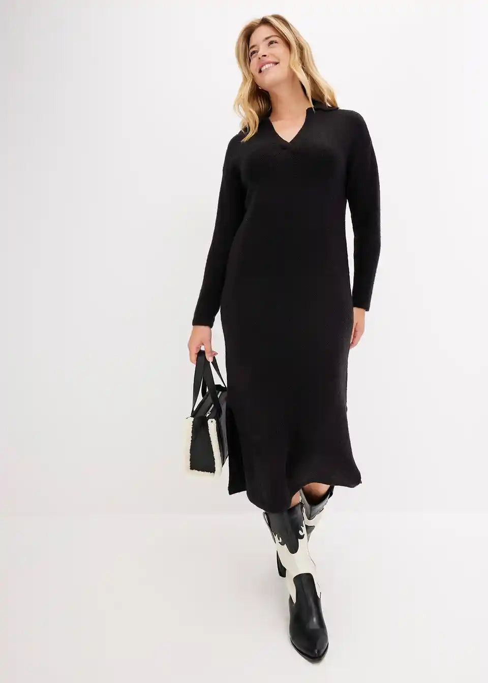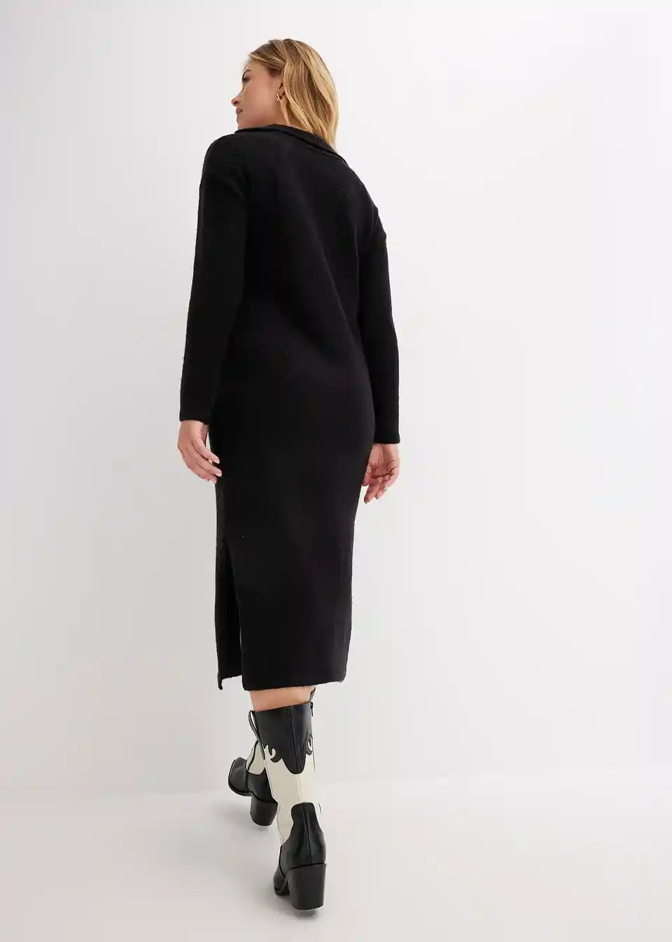 Langes Strickkleid mit Hemdkragen und Schlitz an der Seite
