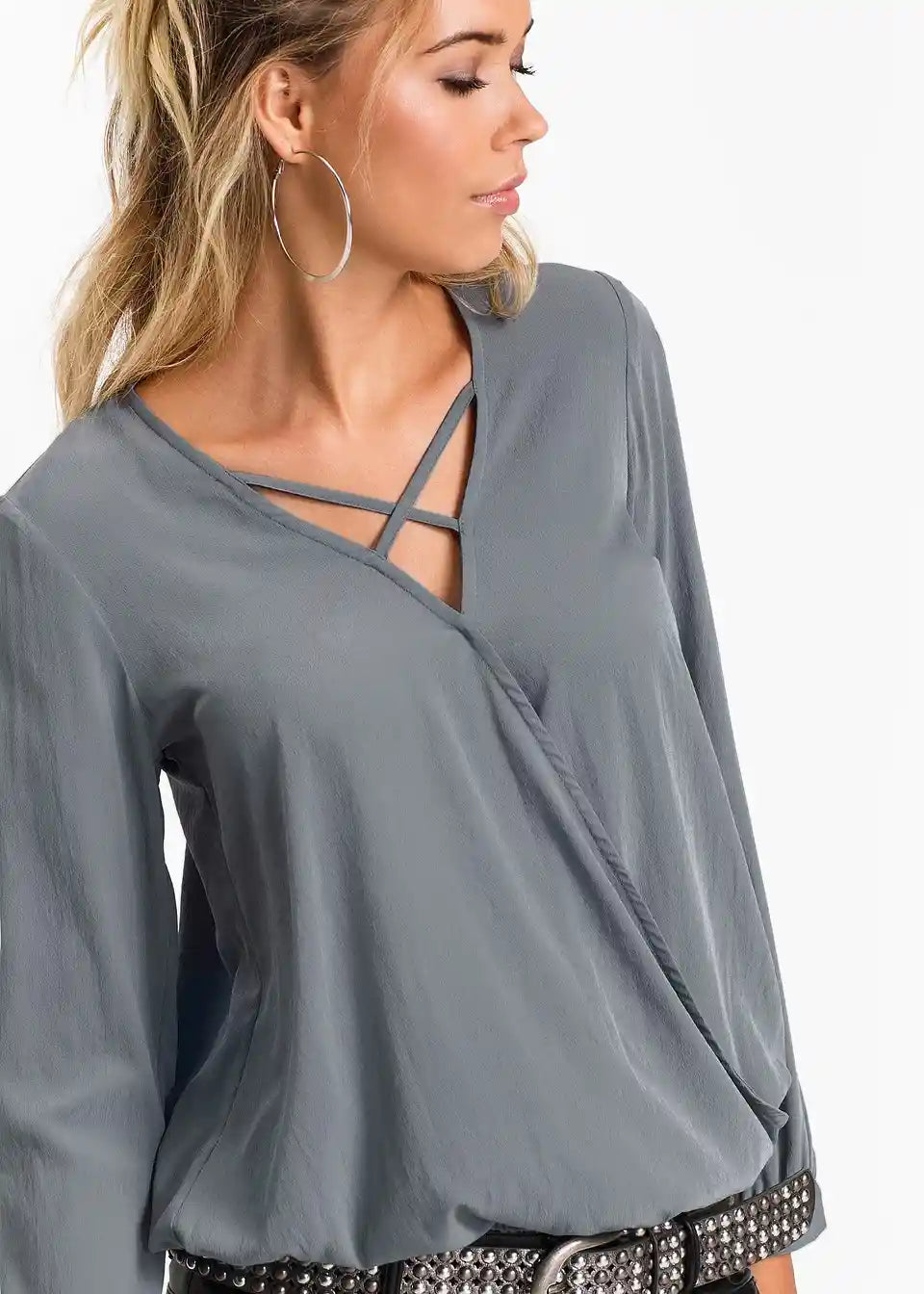 Der leichte, weich fließende Stoff und der lockere Schnitt machen diese Bluse mit Wickeloptik zu einem stylishen Figurschmeichler. Für eine besondere Optik sorgt der tiefe V-Ausschnitt mit der raffinierten Bändchenverzierung.Kleine Raffungen an den Ärmelbündchen unterstreichen das coole Design der Langarmbluse. Sie eignet sich perfekt für trendige Freizeitoutfits oder Partylooks.