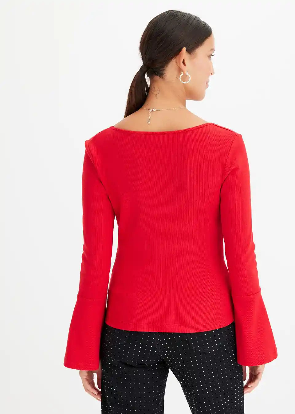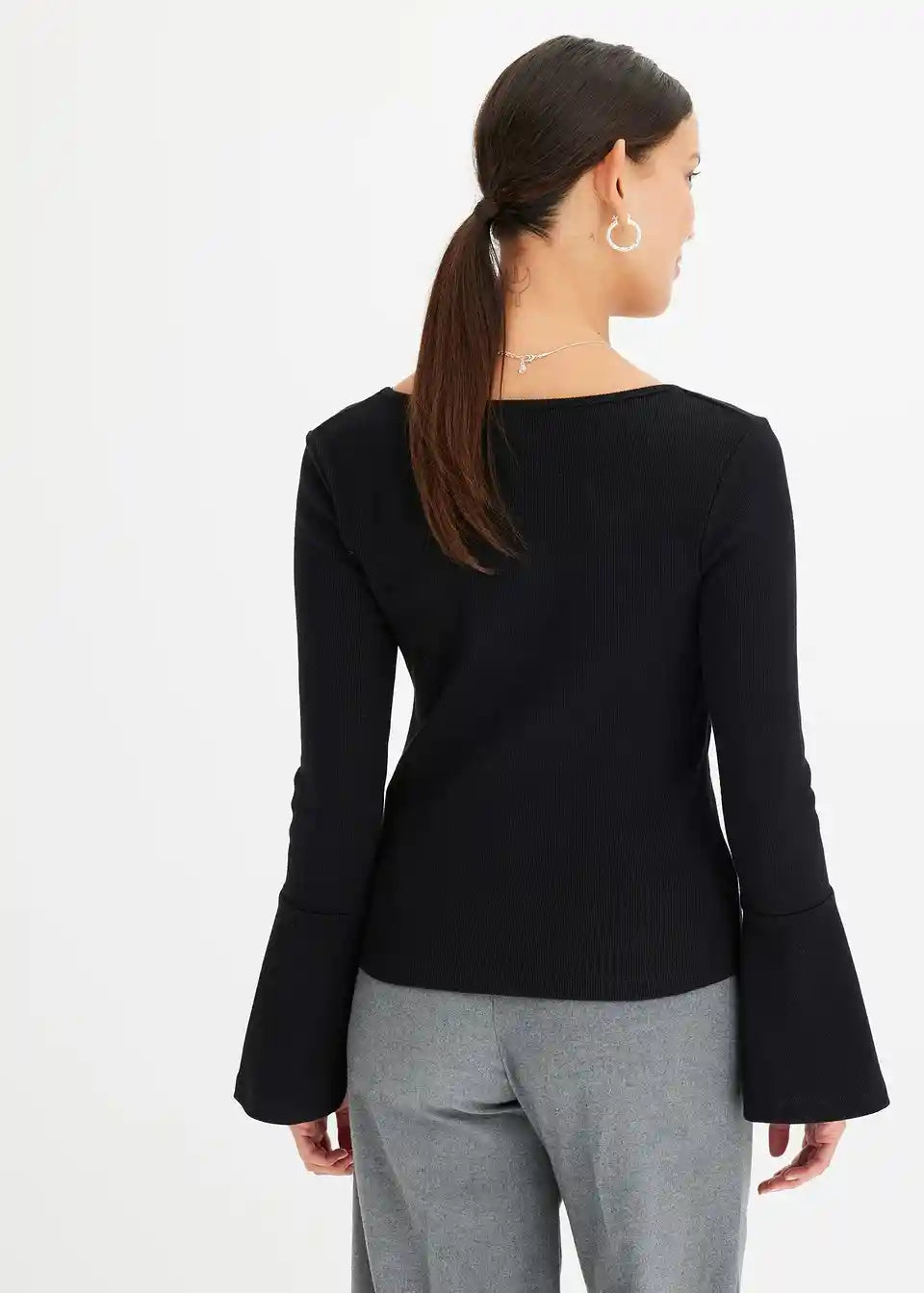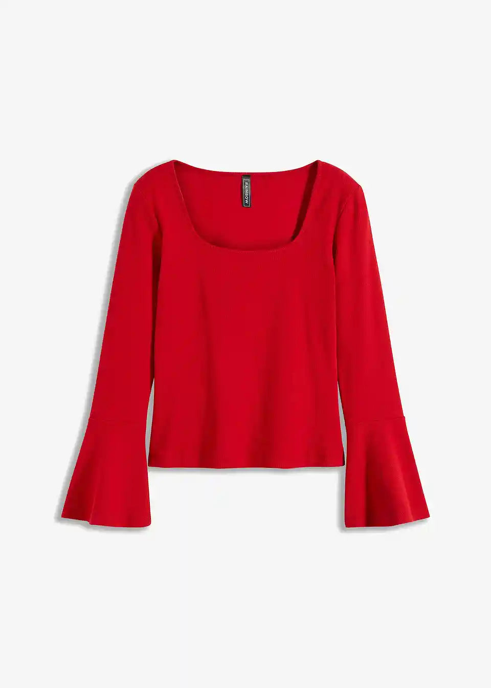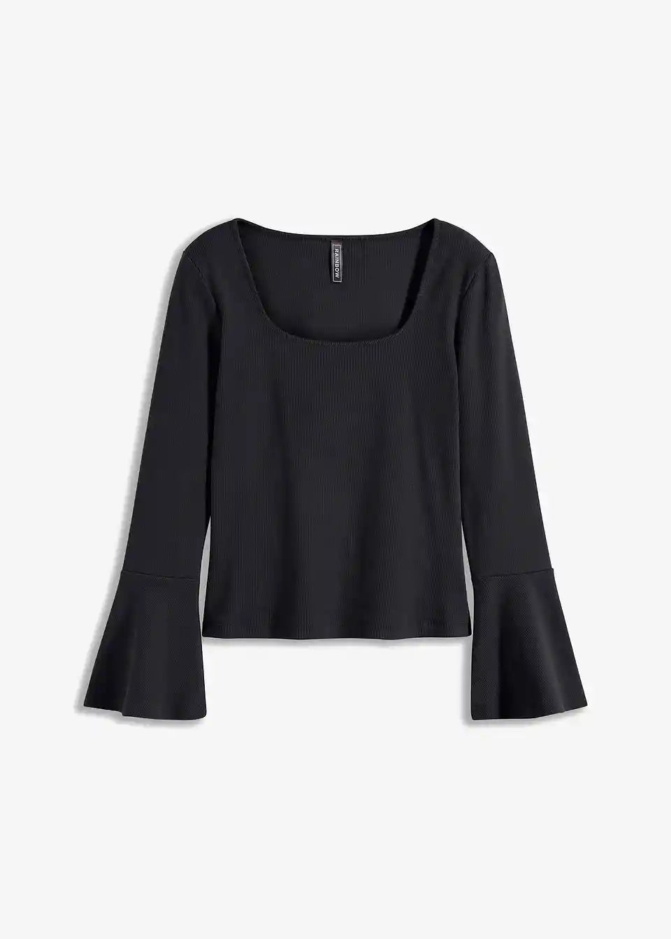 Rippshirt mit Caree Ausschnitt und Trompetenärmeln