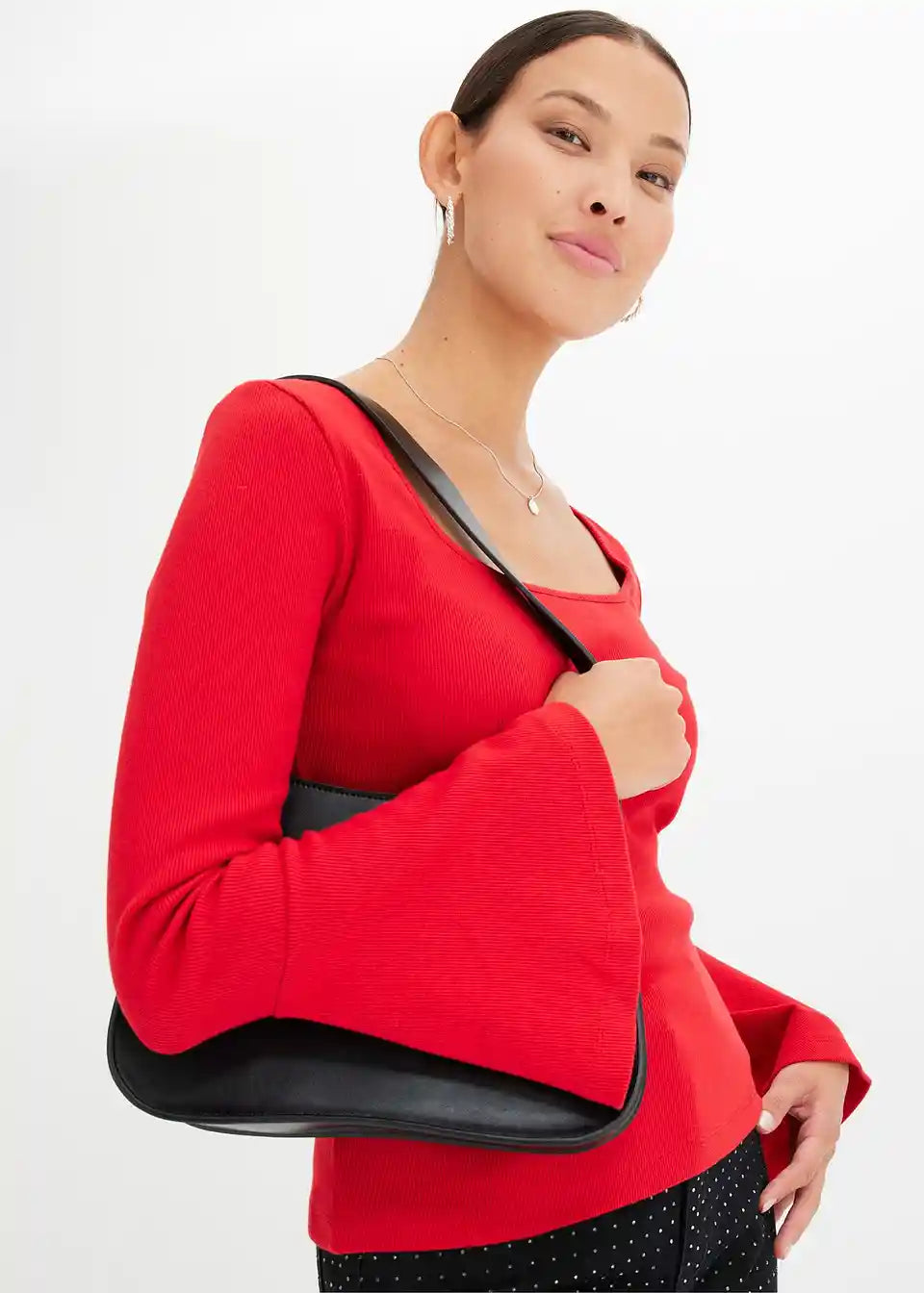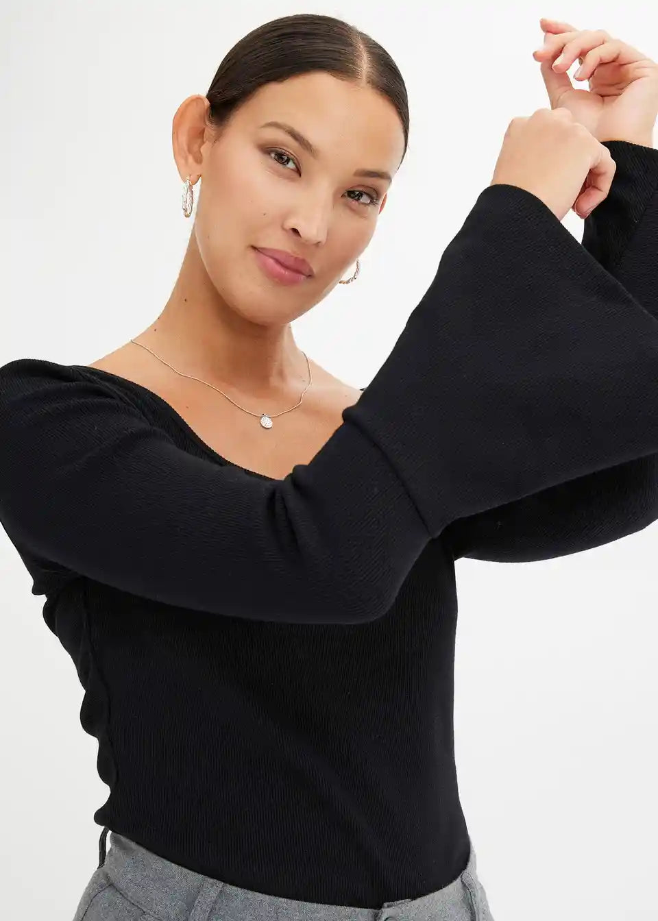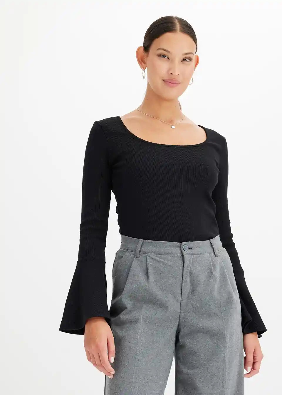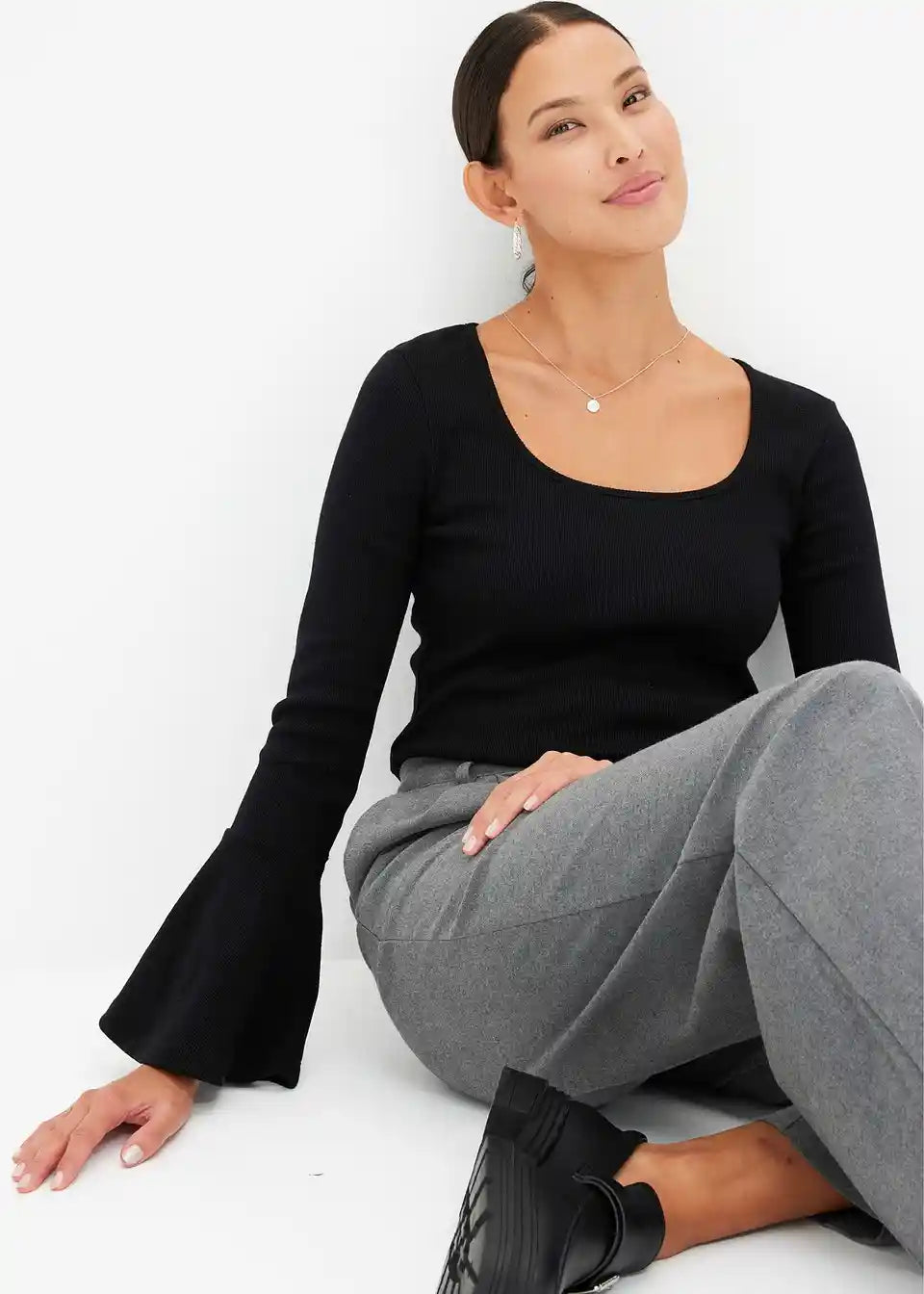 Rippshirt mit Caree Ausschnitt und Trompetenärmeln