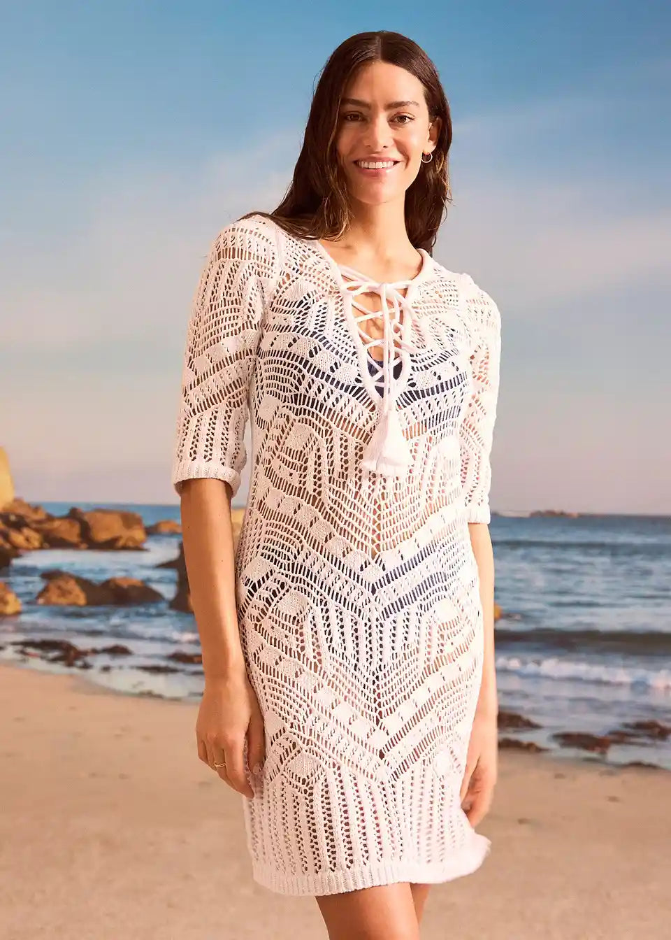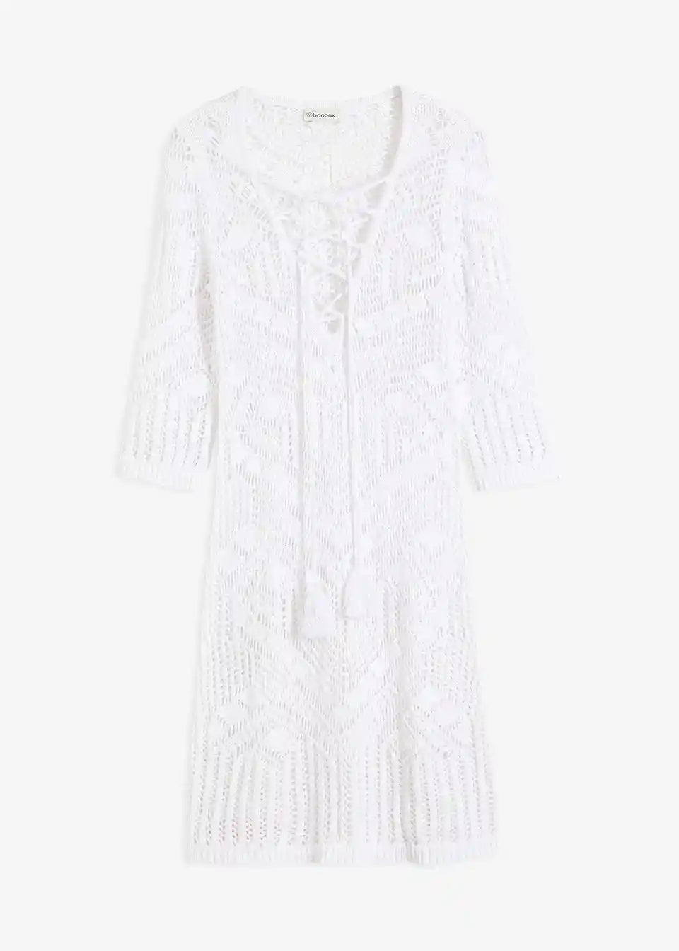 Luftiges Strickkleid aus Strick für den Strand. Mit Schnürung am Ausschnitt. Ärmel in 3/4-Länge.