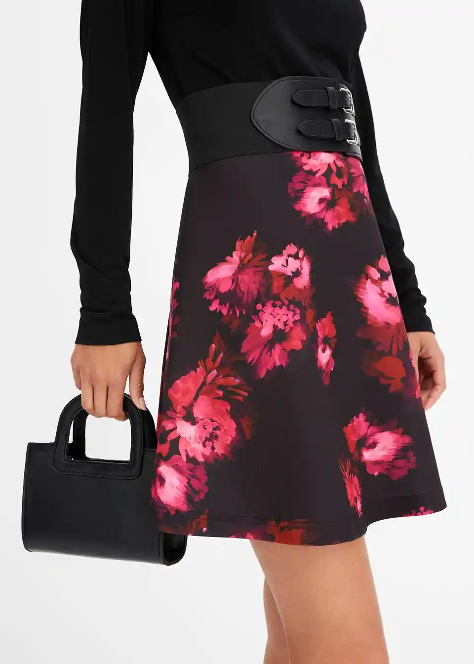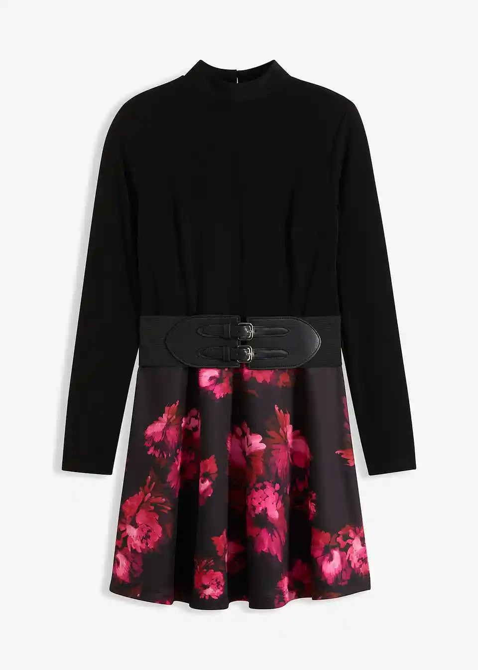 Modernes Kleid mit breitem Gürtel und Stehkragen.