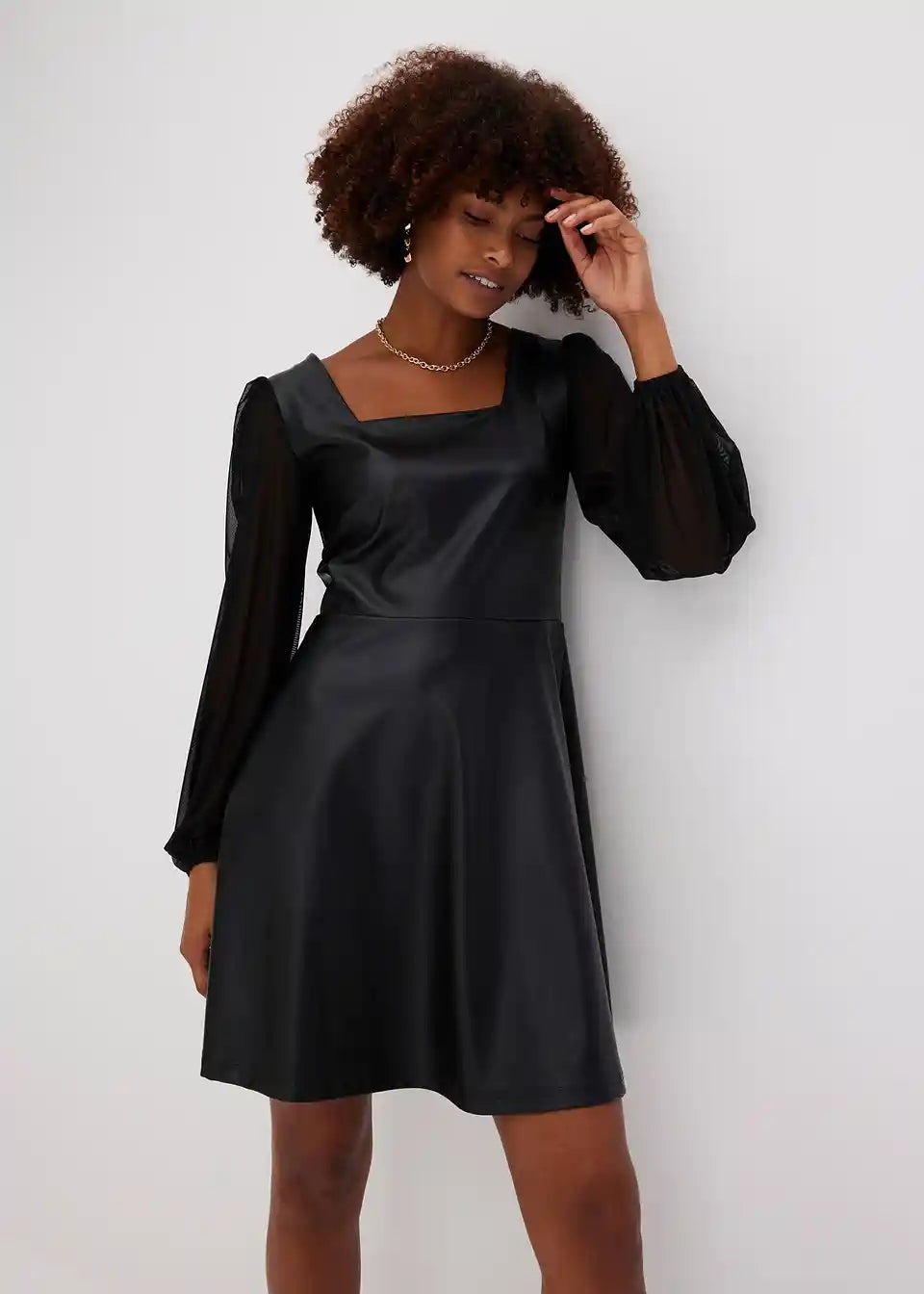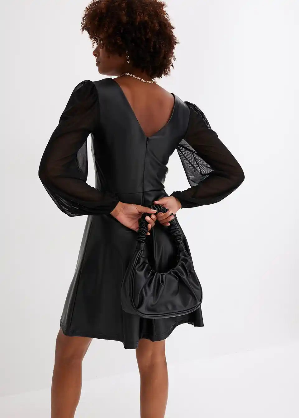 Modern und Feminin: Lederimitat-Kleid mit Ballon-Ärmeln in Mesh.