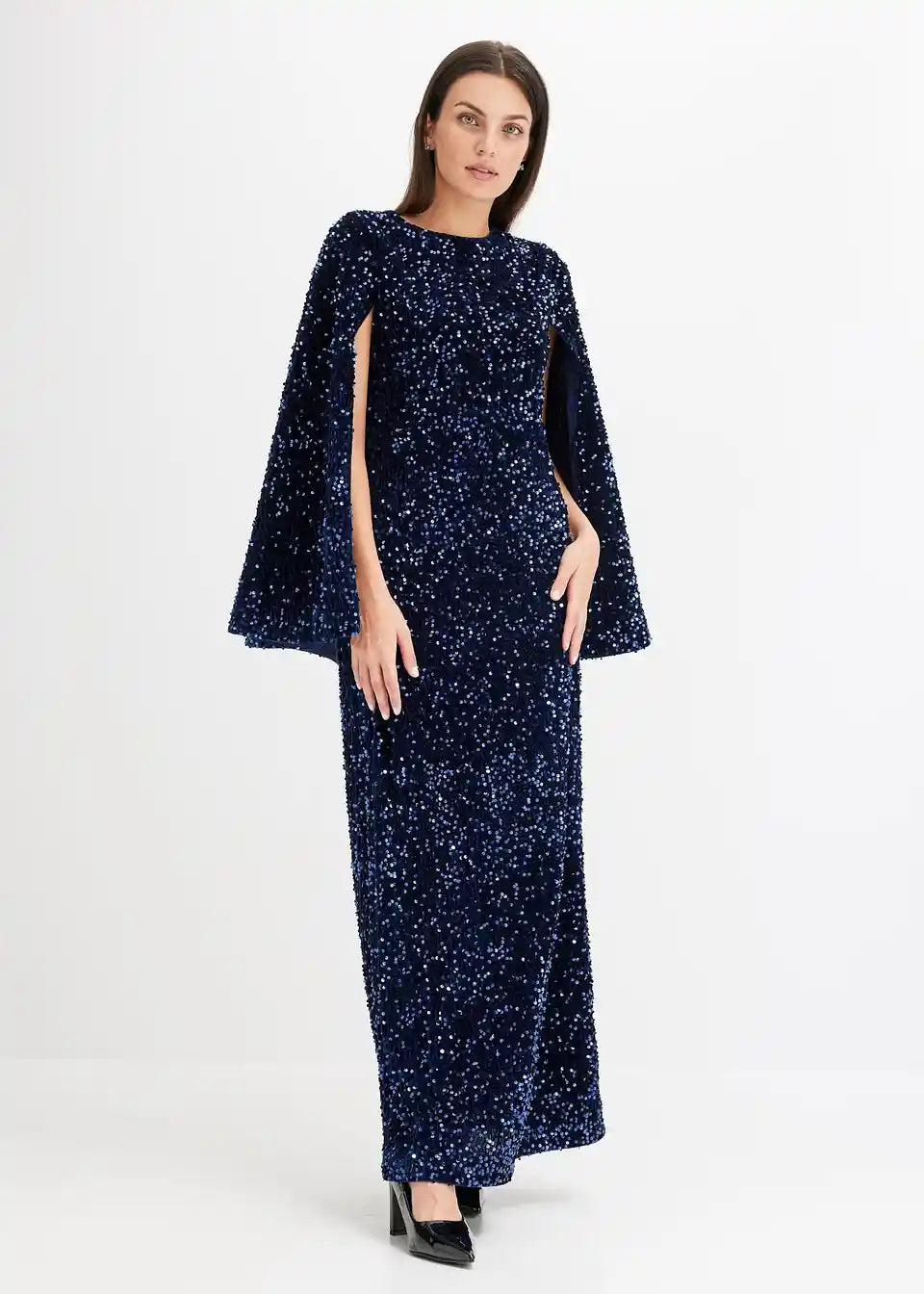 Modern und feminin: Maxikleid aus softem Samt mit Pailletten und langen Cape-Ärmeln