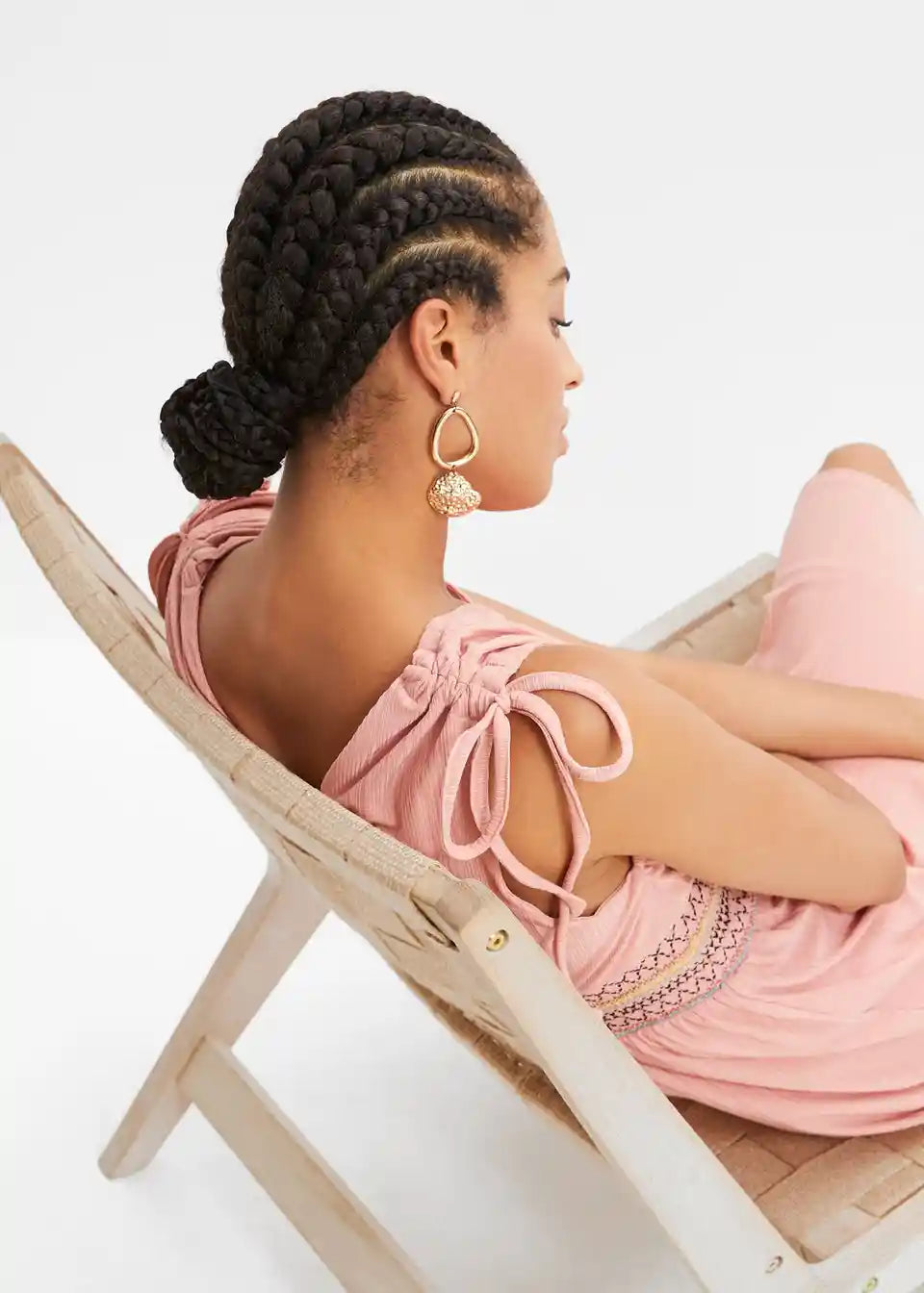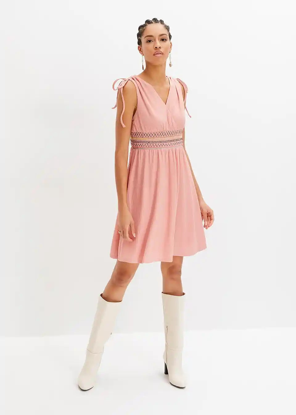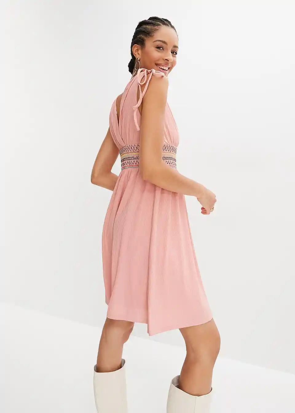 Dieses modische Kleid präsentiert sich im römischen Stil. Unterhalb der Brust akzentuiert ein Schmuckband die Körpermitte. Die raffiniert drapierten Stofflagen im oberen Teil bilden vorn und hinten einen V-Ausschnitt. Bindebänder raffen sie an den Schultern. Zugleich setzen die herabfallenden Bänder einen schönen Akzent. Den letzten Schliff erhält das Kleid mit Raffung von BODYFLIRT mit einem strukturierten Stoff und einem stilvollen Faltenspiel ober- und unterhalb des bestickten Einsatzes.