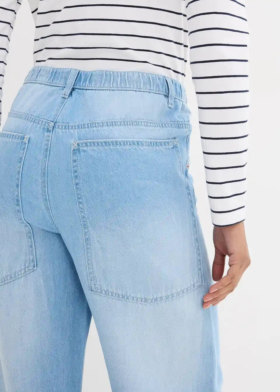 Weite 5-Pocket-Jeans mit elastischem Bequembund aus einem festen Baumwolldenim, der sich zunächst etwas steif anfühlt und durch häufiges Tragen weicher und lockerer wird. Mittlere Bundhöhe mit Zip Fly und Knopf. Innenbeinlänge in Gr. 42 ca. 78,5cm, maschinenwaschbar.