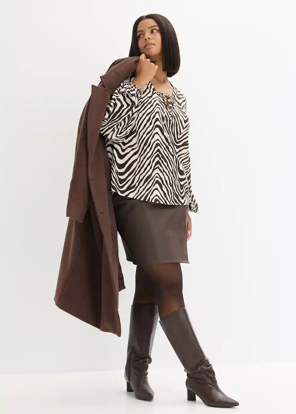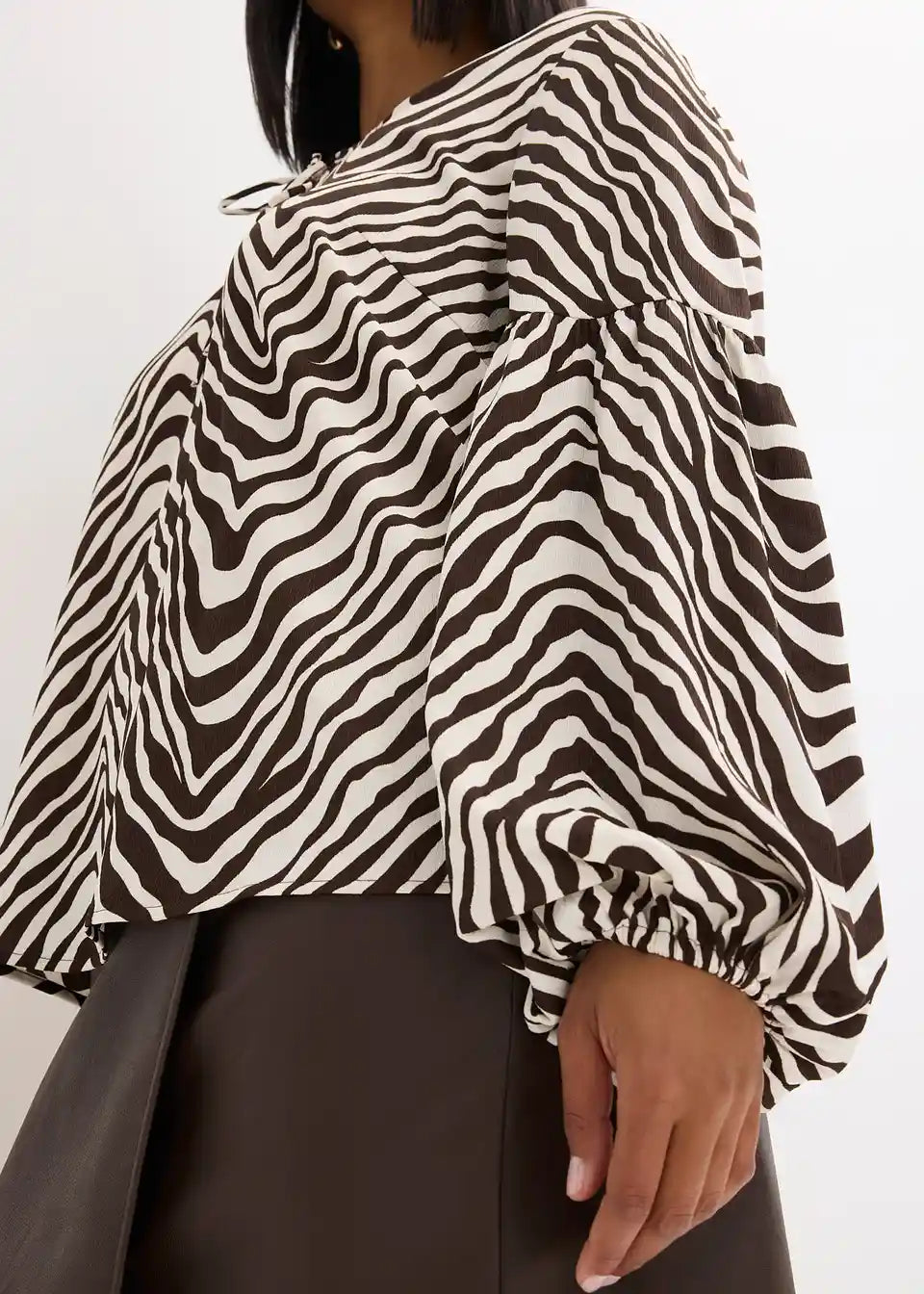 modisch bedruckte Tunikabluse mit voluminösen Ärmeln und Bindeband-Detail vorne am V-Ausschnitt.