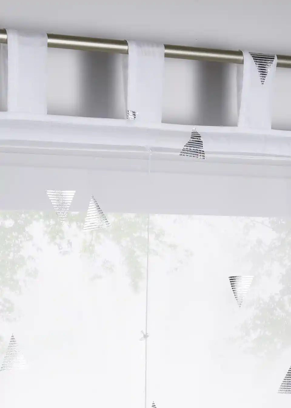 Dieses Raffrollo ist modern und schlicht zugleich. Ein toller Blickfang sind die aufgedruckten glänzenden Dreiecke in verschiedenen Richtungen. Die Dreiecke bestehen aus kleinen Streifen, die im Foliendruck aufgebracht werden.