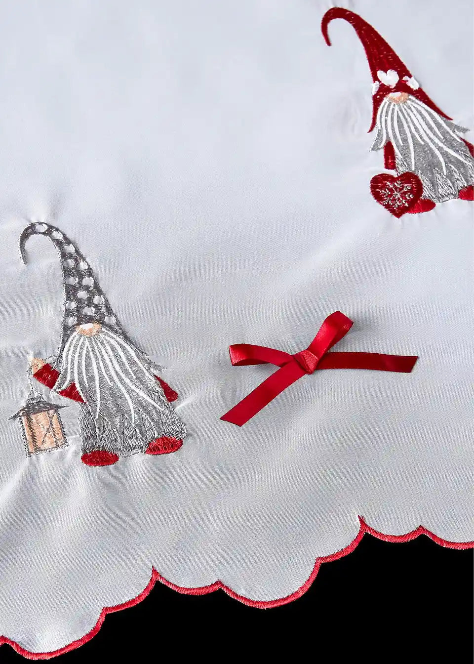 Weihnachtliche Scheibengardine mit süßen aufgenähten Schleifen und bestickten Wichteln auf luftig, leichter Voile-Qualität. Passend dazu ist die Scheibengardine am oberen und unteren Abschluss (welche gebogt sind) mit einer roten Stickerei versehen. Passend für Stangen mit bis zu 3cm Durchmesser.