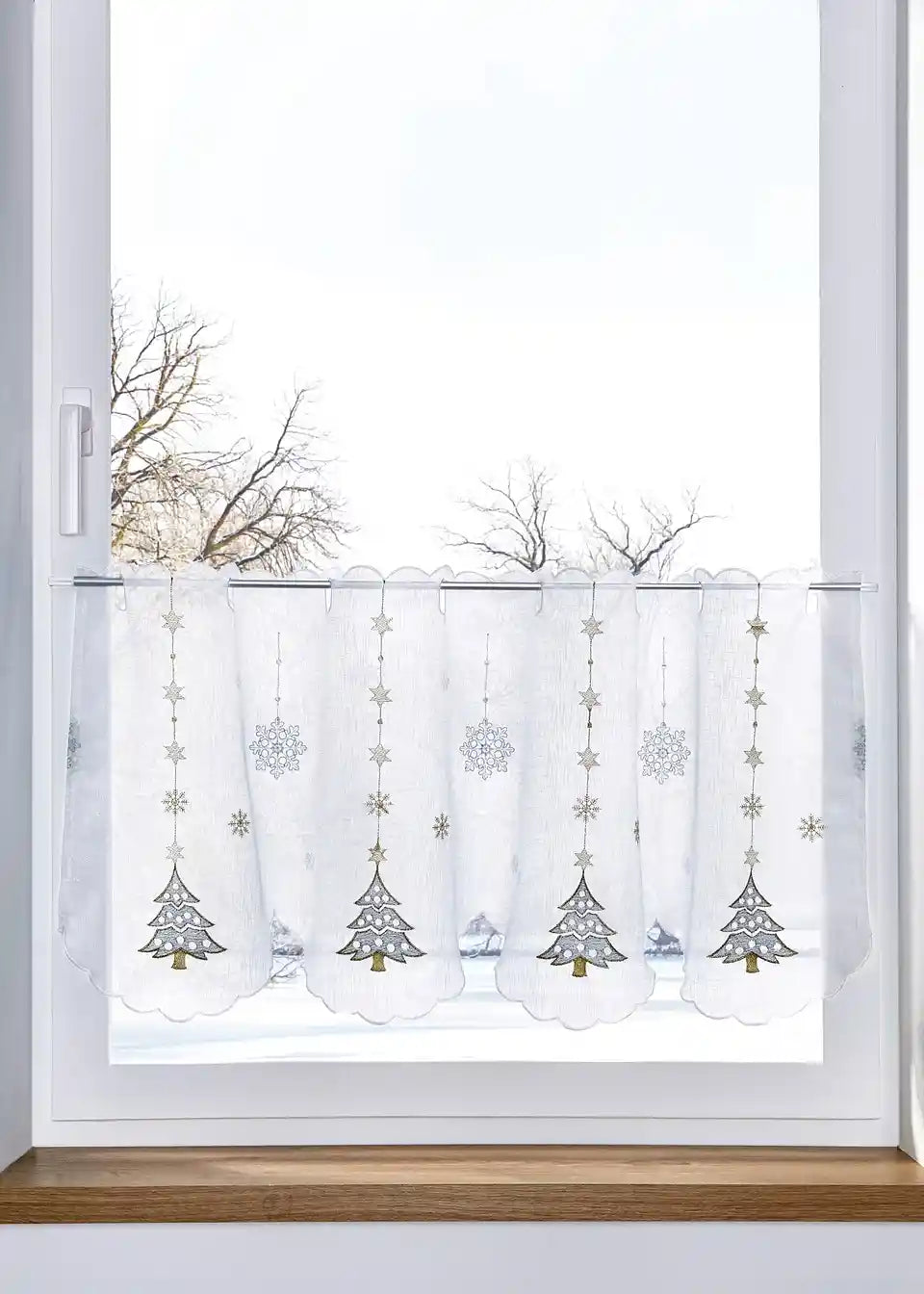 Wunderschöne Scheibengardine verziert mit weihnachtlicher Stickerei und gebogtem Saum inkl. Lochleiste für Stangen bis max.3cm Durchmesser.