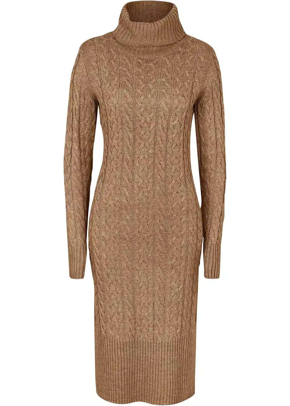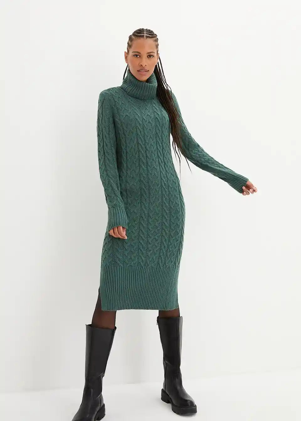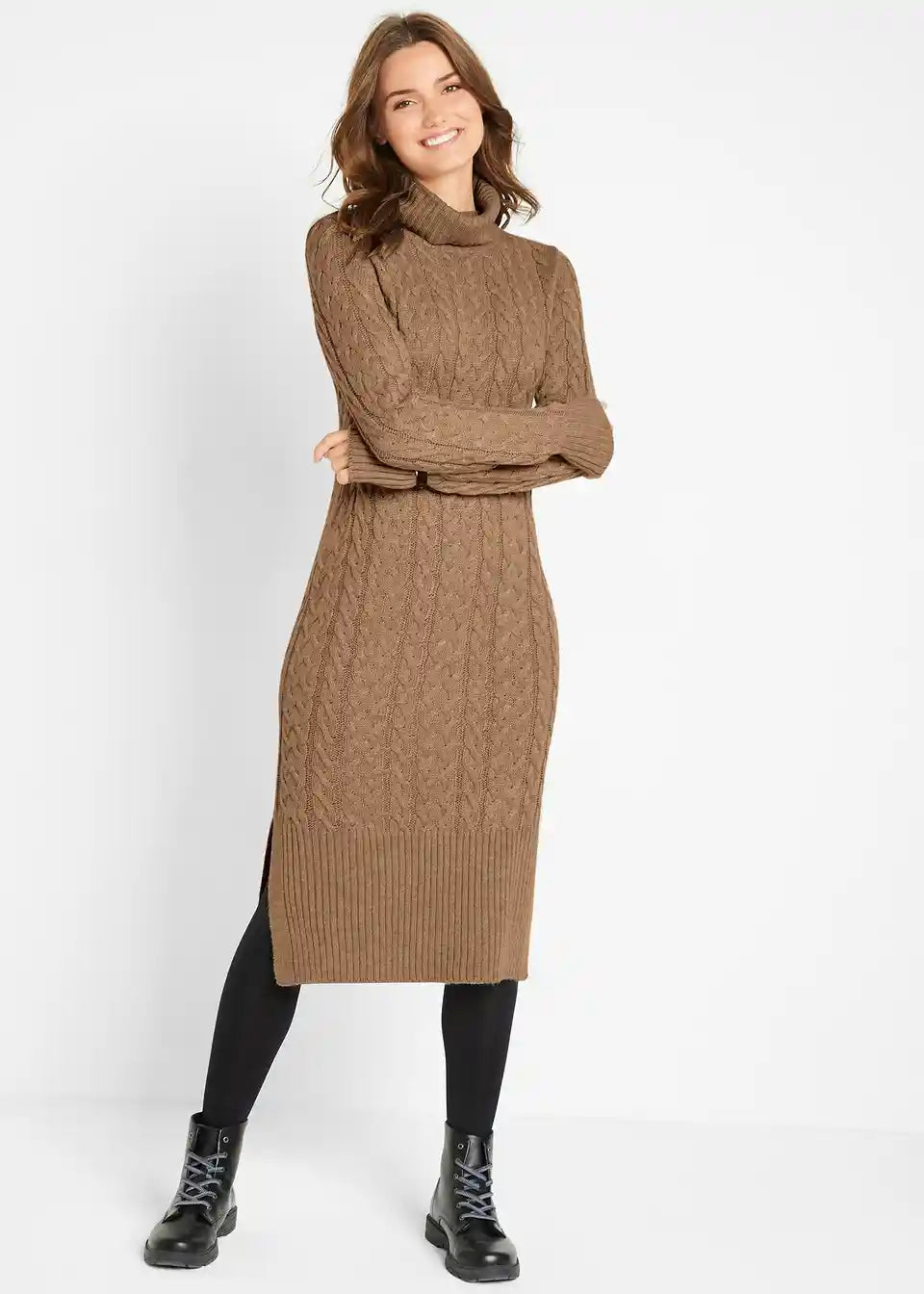 Kuscheliges Rollkragen-Kleid aus Strick mit Zopfmuster, seitlicher Schlitz am Saum
