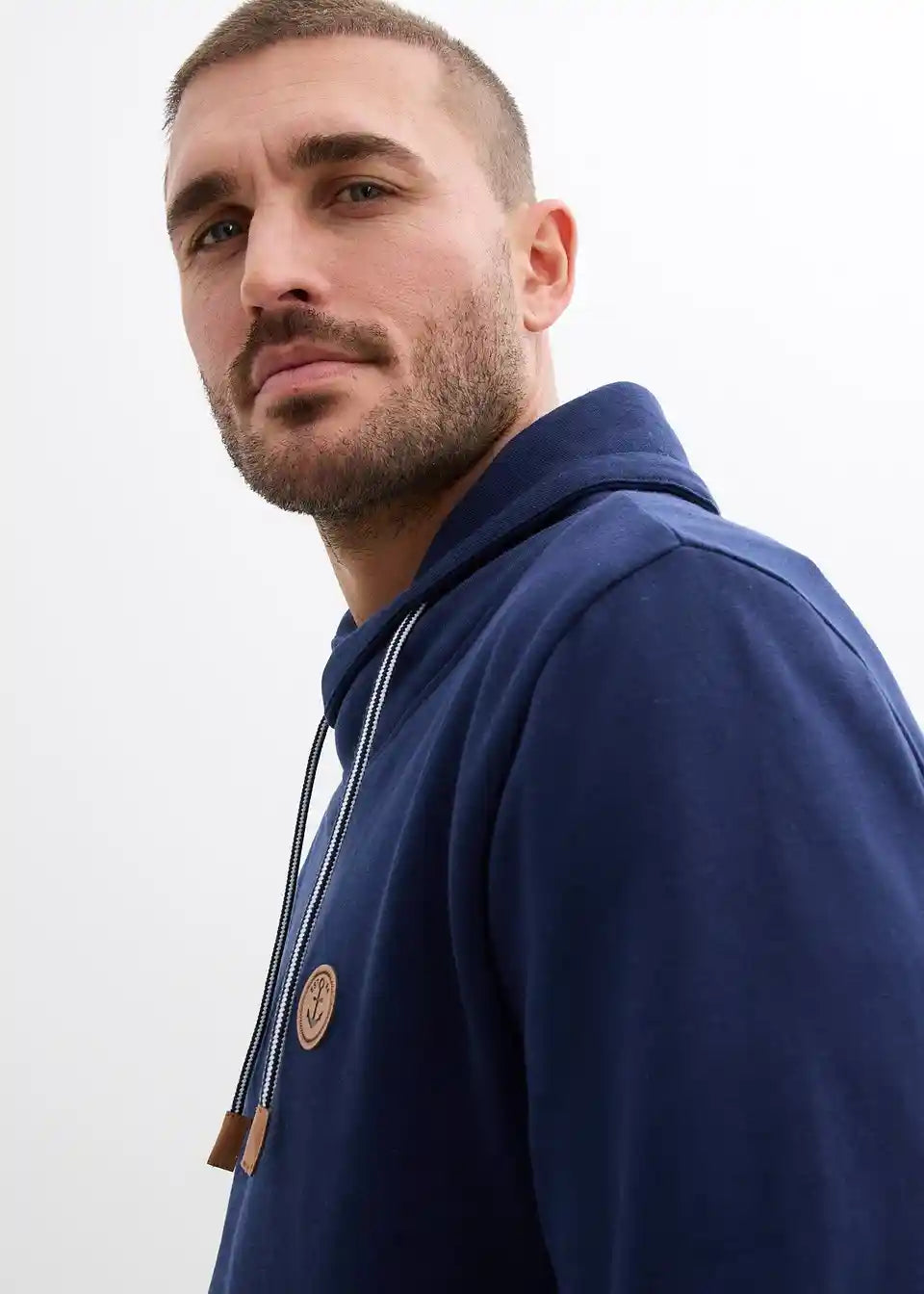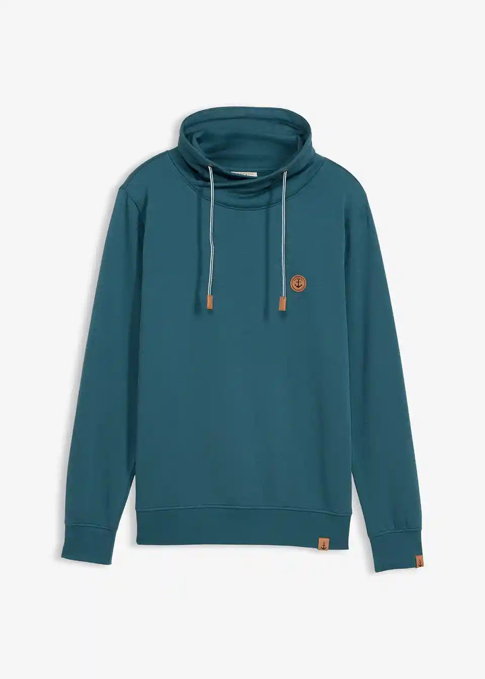 Moderner Sweatpullover mit angesagtem Schalkragen und kontrastfarbener Kordel