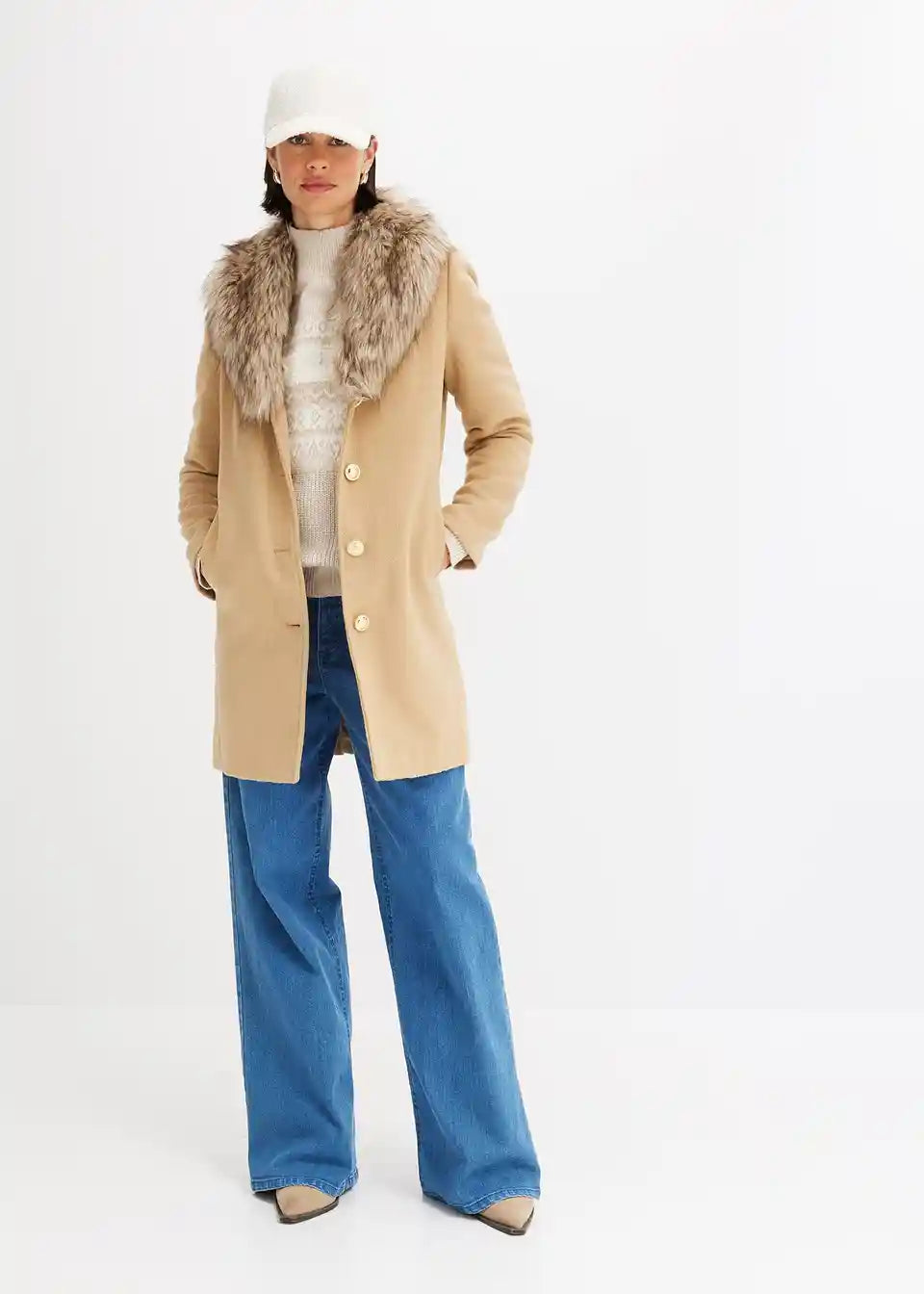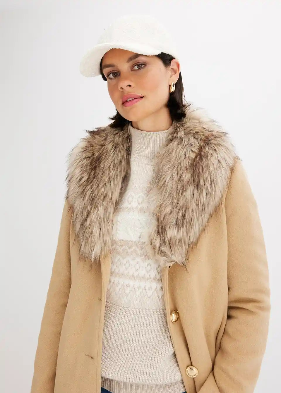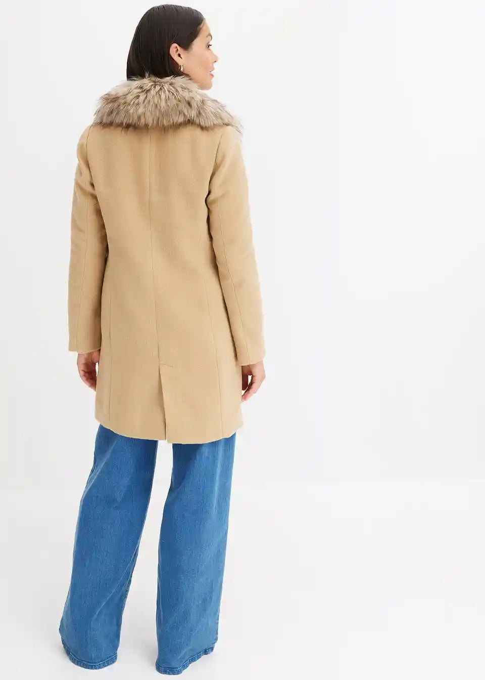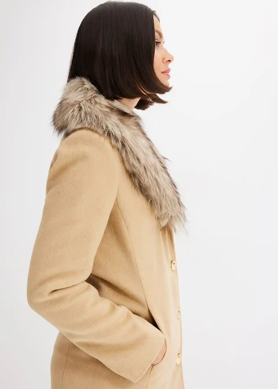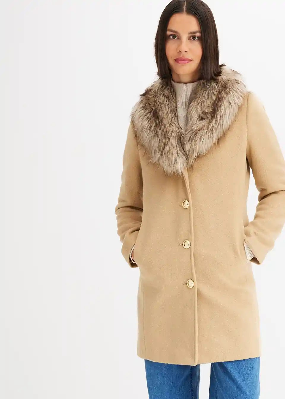 femininer Mantel mit abnehmbaren Fellimitat-Kragen und dekorativen Knöpfen vorne