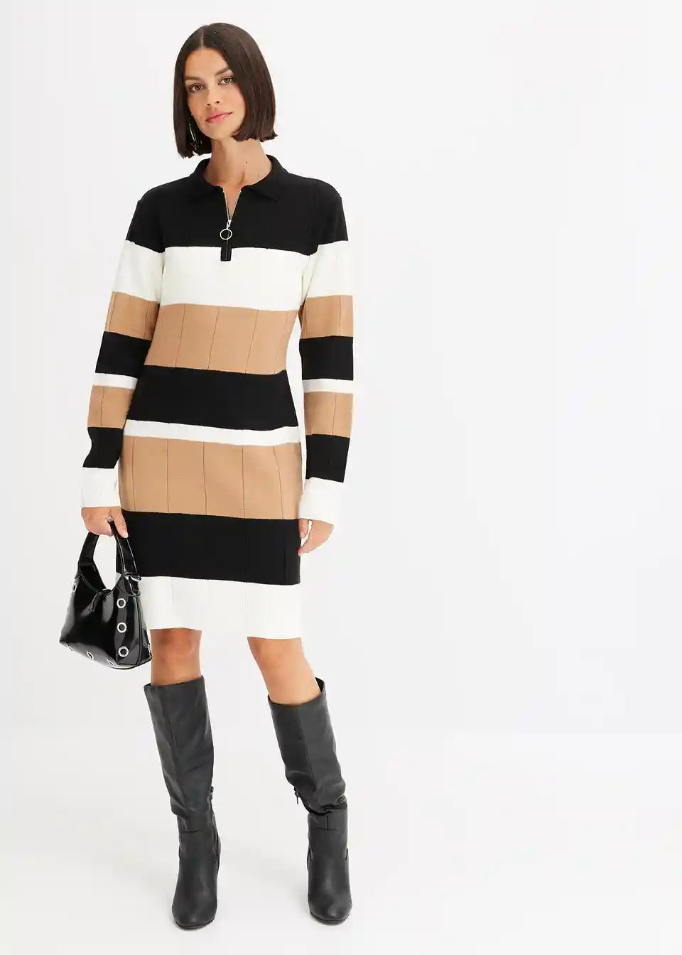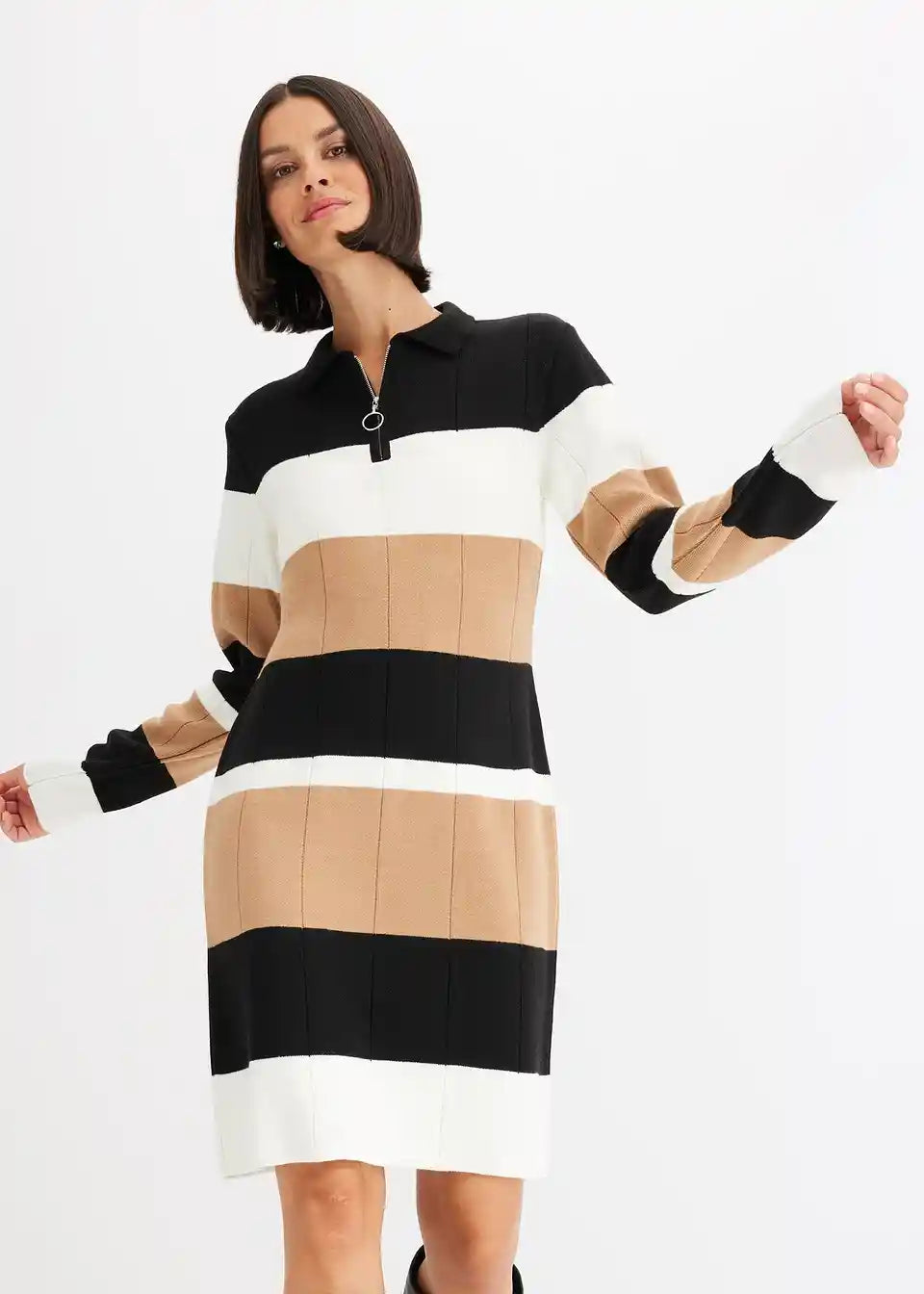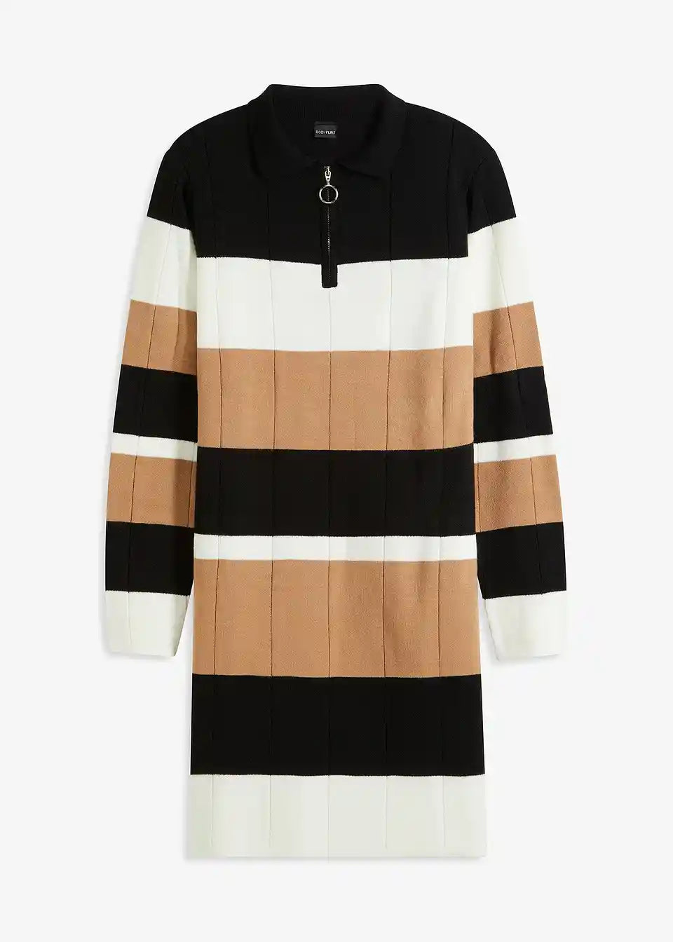feminines Strickkleid mit Streifen-Design und Reißverschluss vorne