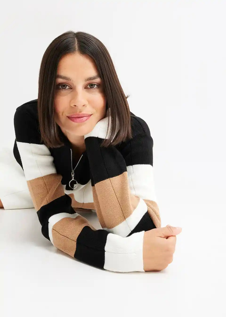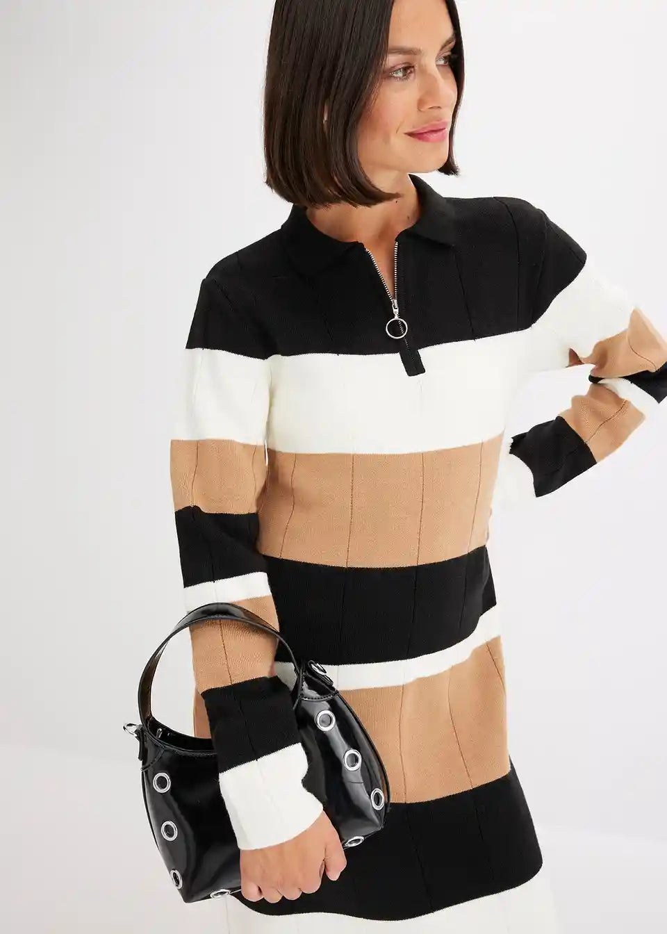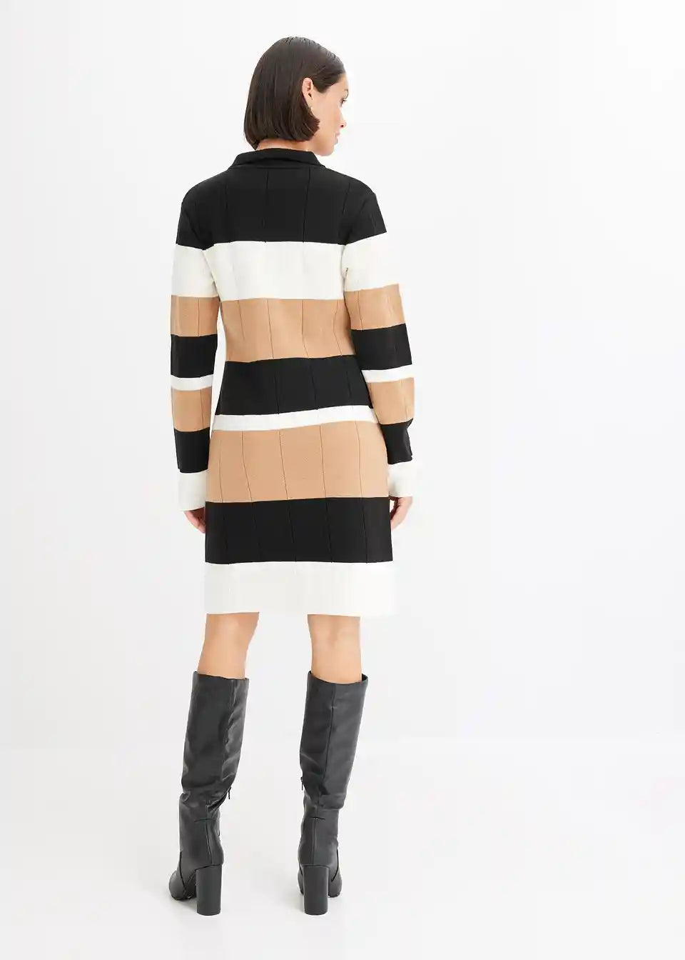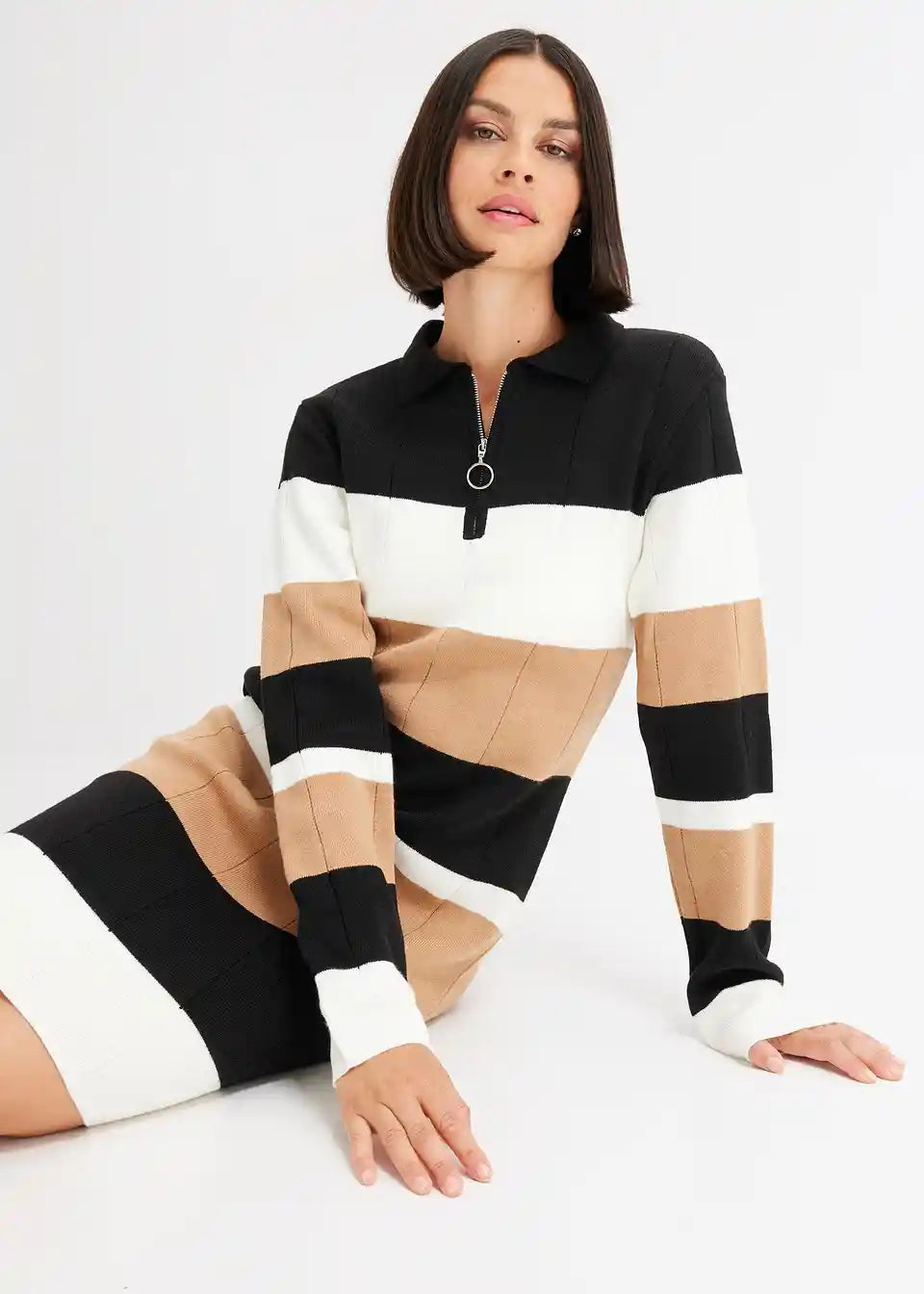 feminines Strickkleid mit Streifen-Design und Reißverschluss vorne