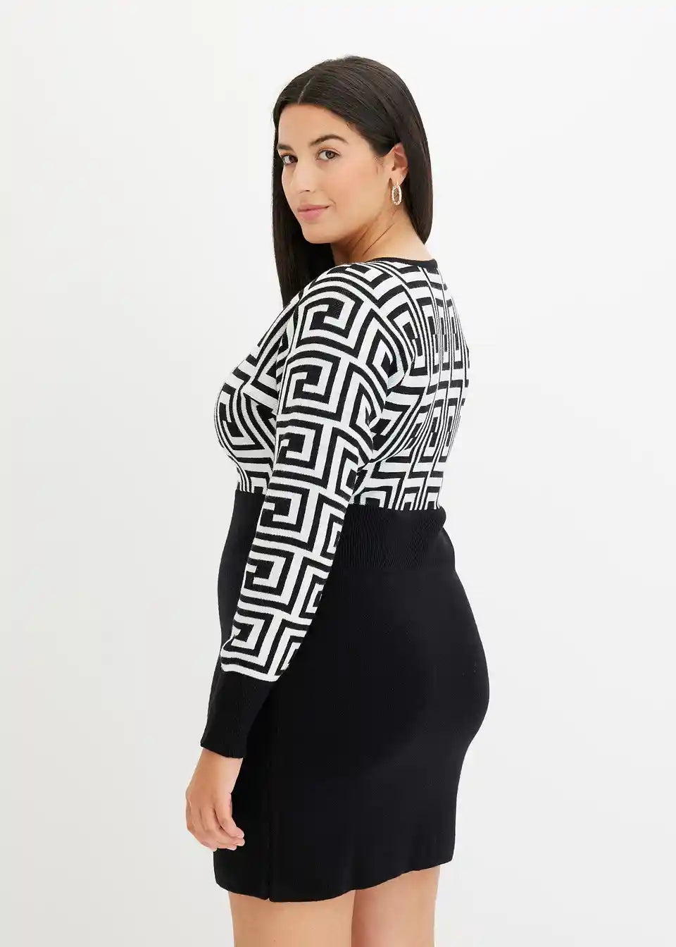 feminines Strickkleid mit graphischem Muster am Oberteil