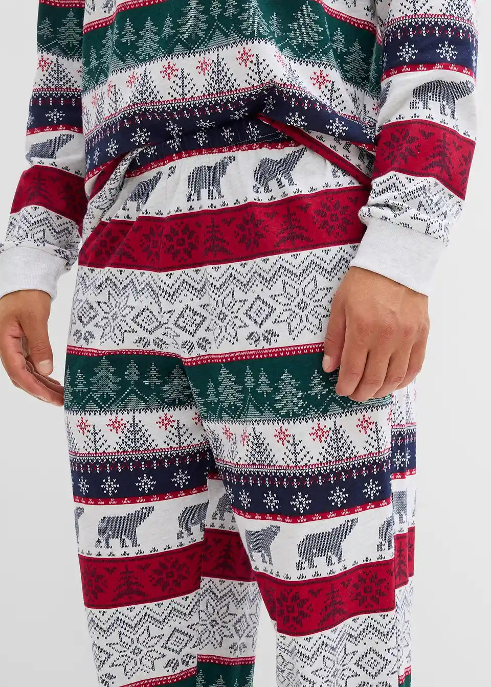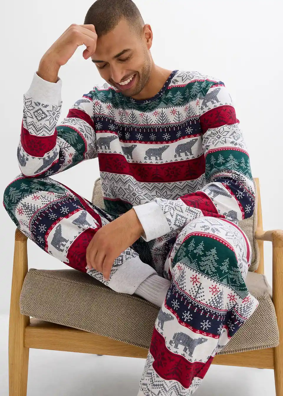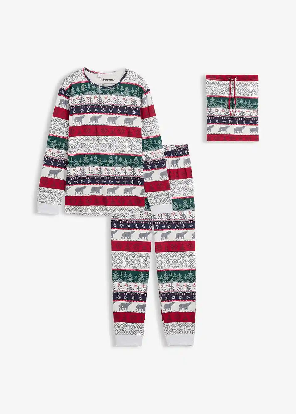 Gemütlicher Pyjama mit Norweger Druck mit einem Langarmshirt mit hohem Halsausschnitt und einer lockergeschnittenen Hose mit Eingriffstaschen