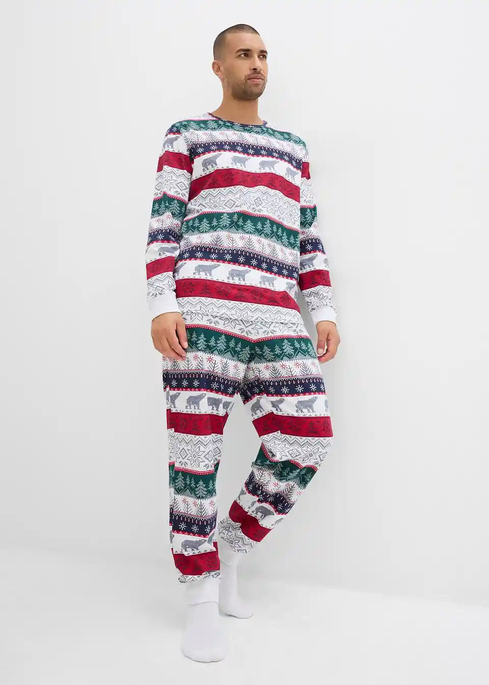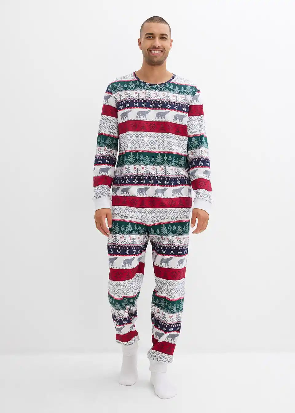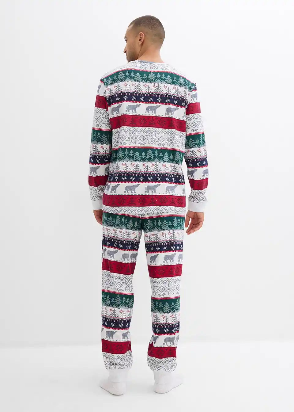 Gemütlicher Pyjama mit Norweger Druck mit einem Langarmshirt mit hohem Halsausschnitt und einer lockergeschnittenen Hose mit Eingriffstaschen
