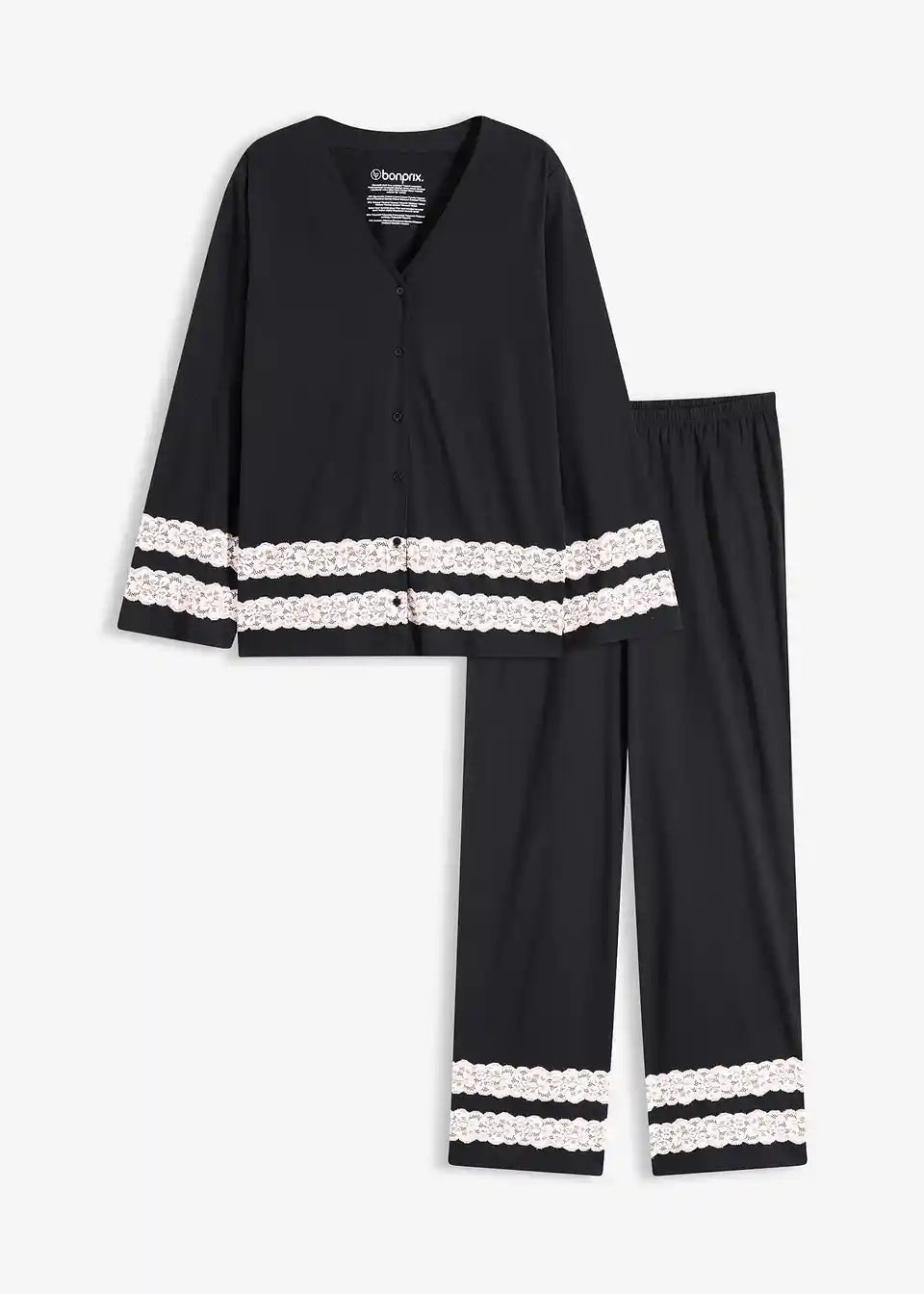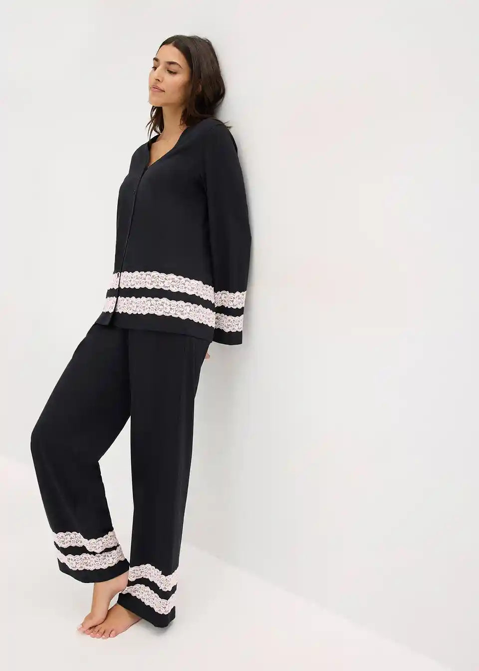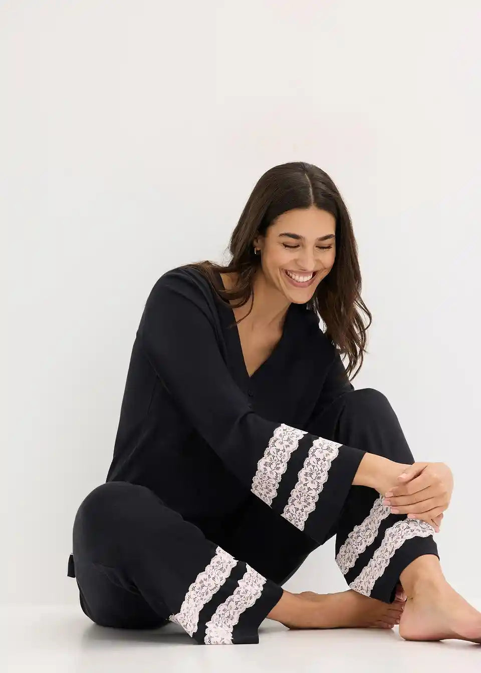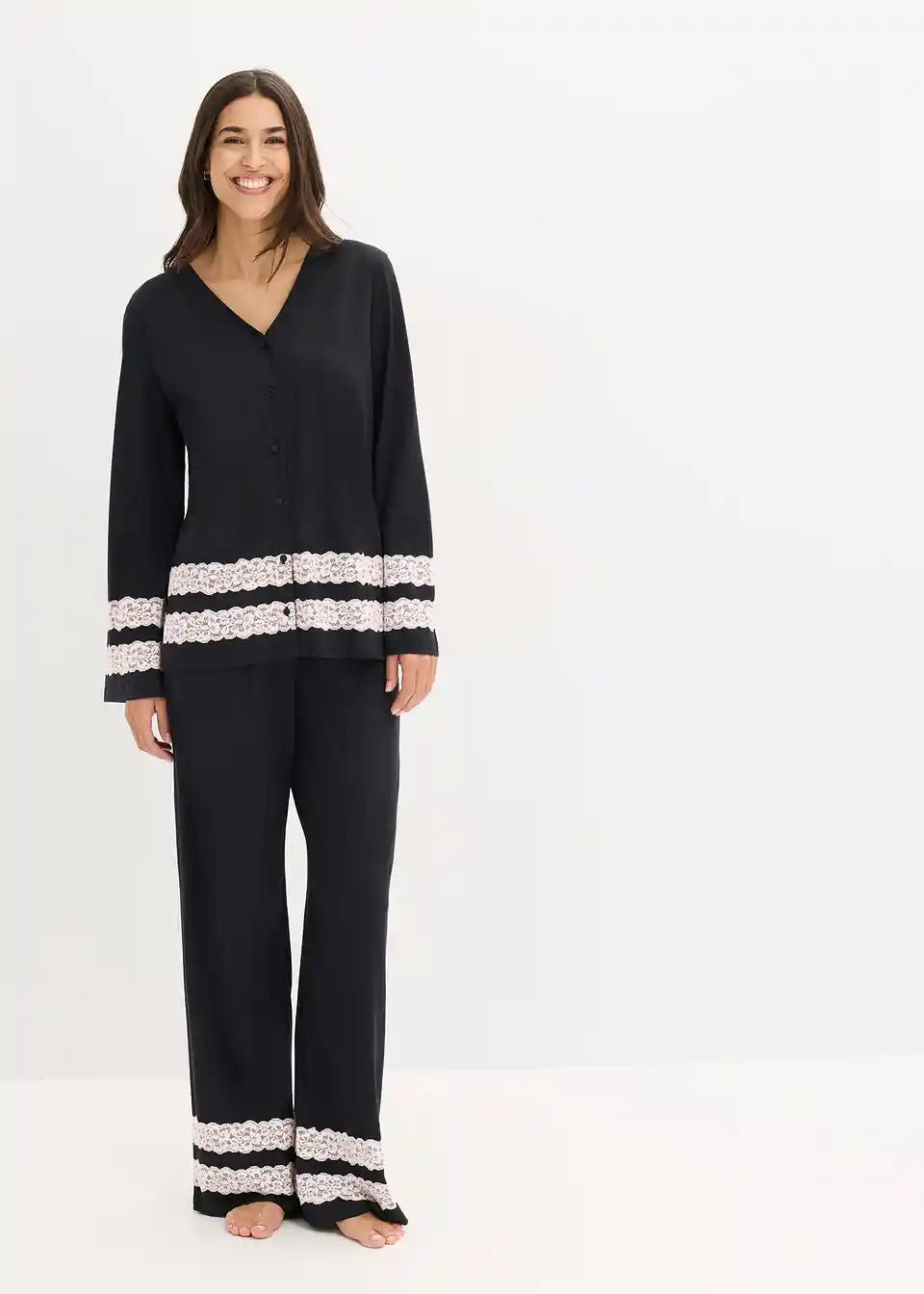 Gemütlicher Pyjama mit femininen Spitzenbesatz, V-Ausschnitt und Knopfleiste sowie einer weiten Hose