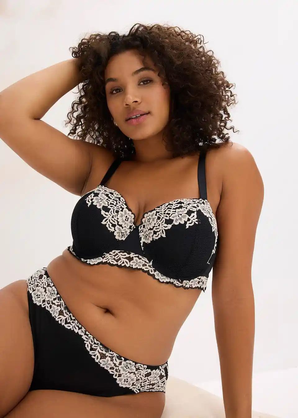Material:Obermaterial: schwarz: 84% Polyamid, 16% Elasthan, wollweiß: 84% Polyamid, 16% Elasthan, Spitze: schwarz: 53% Polyamid, 35% Polyamid (recycelt), 12% Elasthan, wollweiß: 45% Polyester, 33% Polyamid (recycelt), 11% Elasthan, 11% Polyamid