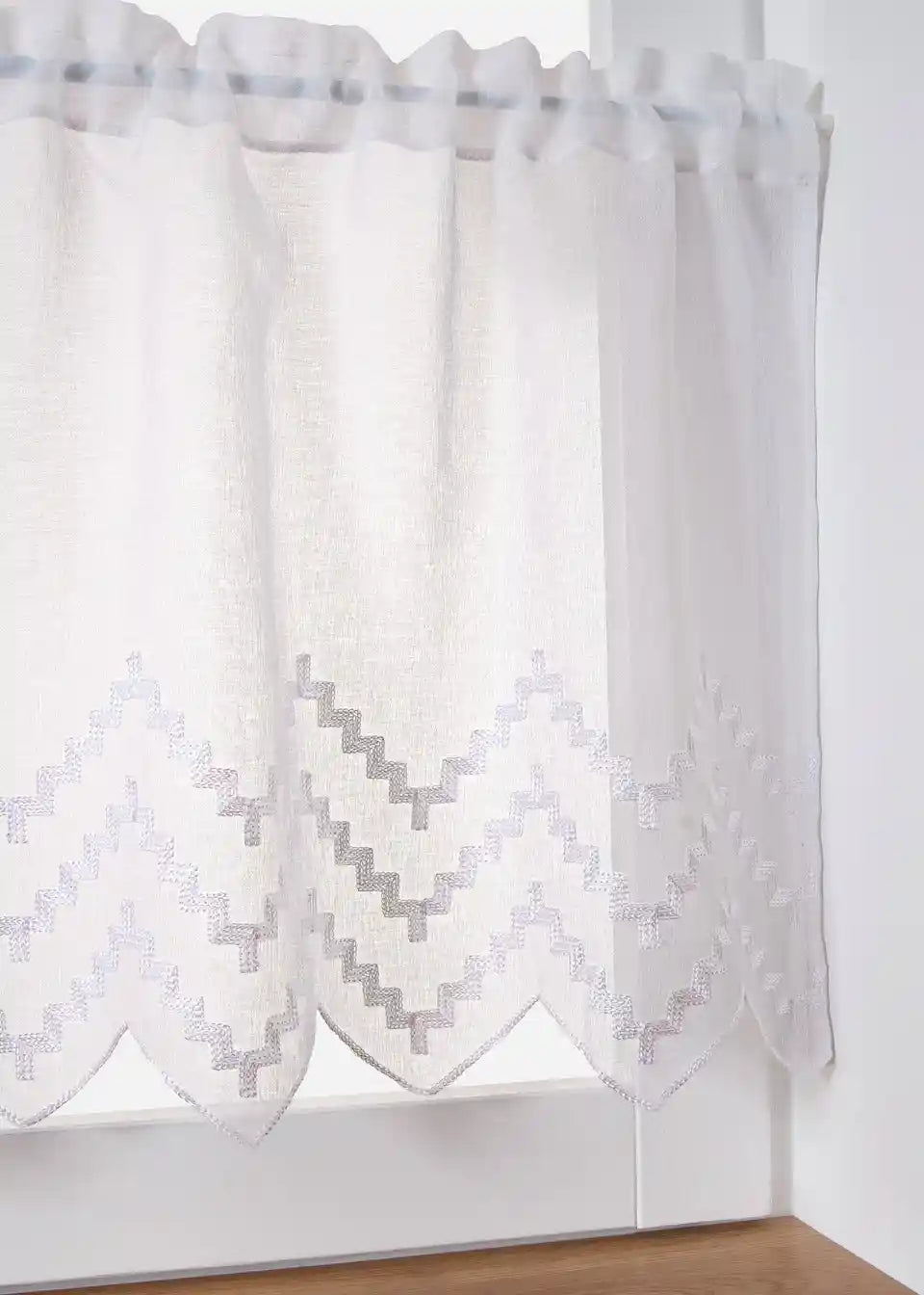 Moderne Scheibengardine mit recyceltem Polyester und hochwertiger Stickerei. Eine einfache Anbringung ist mithilfe des Tunnelzugs möglich und die Stickerei sorgt für einen dekorativen Hingucker.