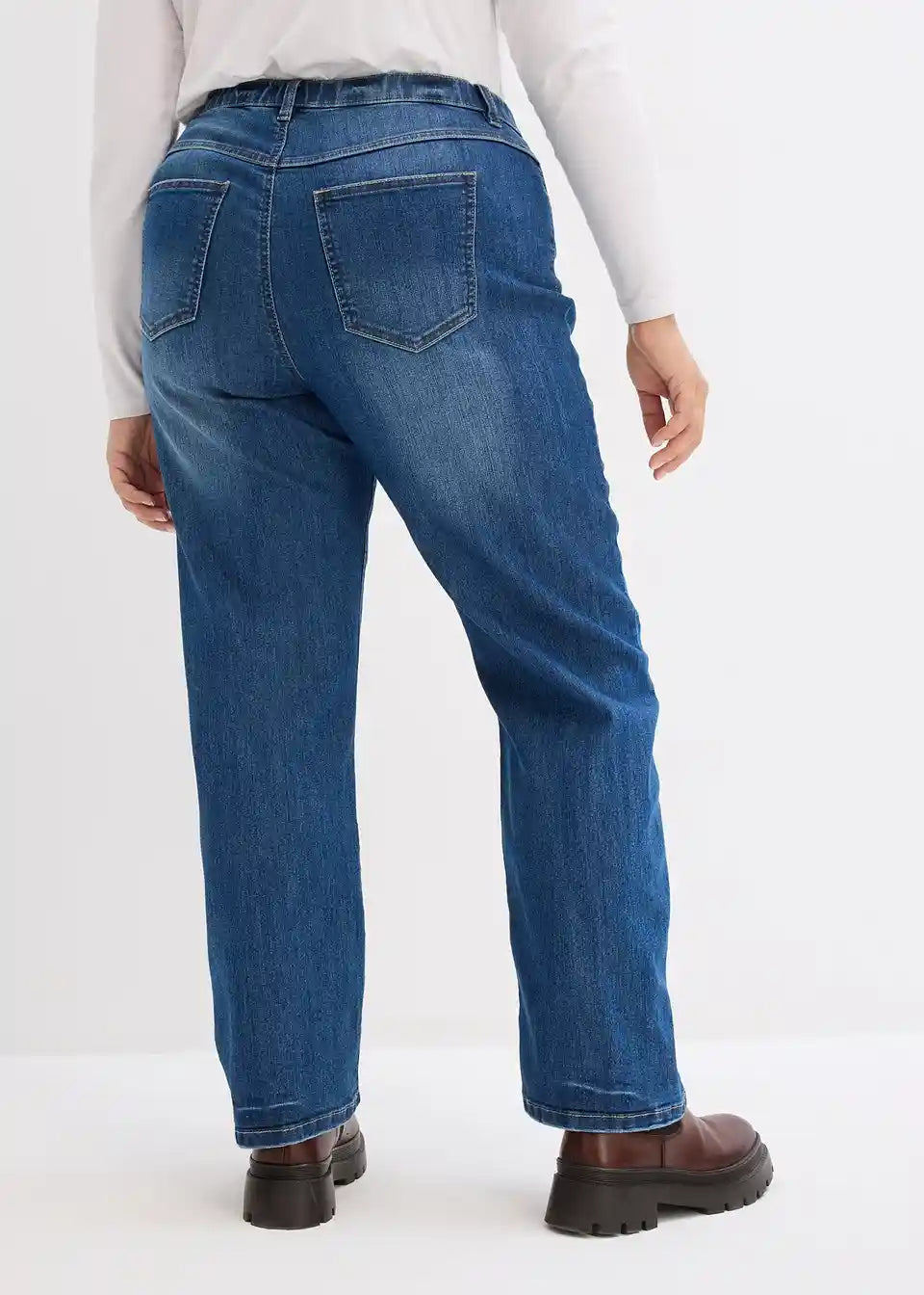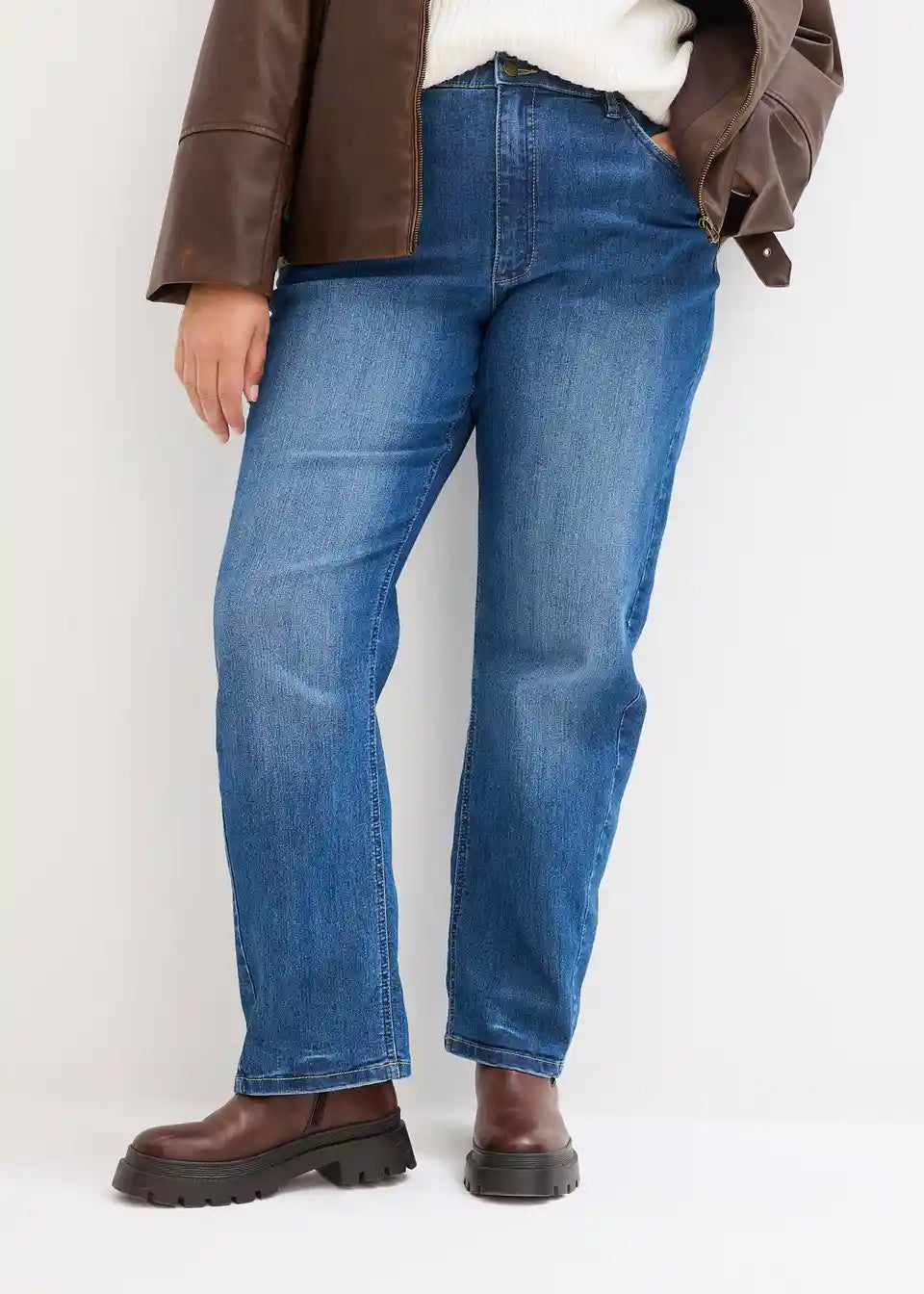 Gerade geschnittener Jeans bietet der Figur einen Schlankeffekt durch vorverlegte Seitennähte
