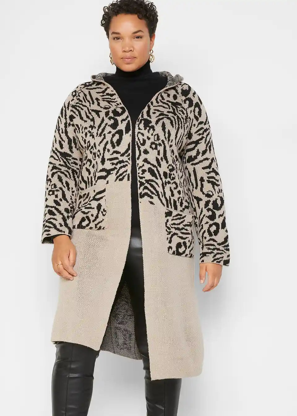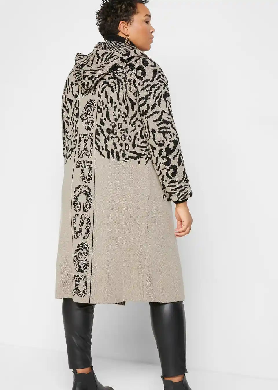 moderner Strickmantel mit Kapuze mit Animal Print Elementen