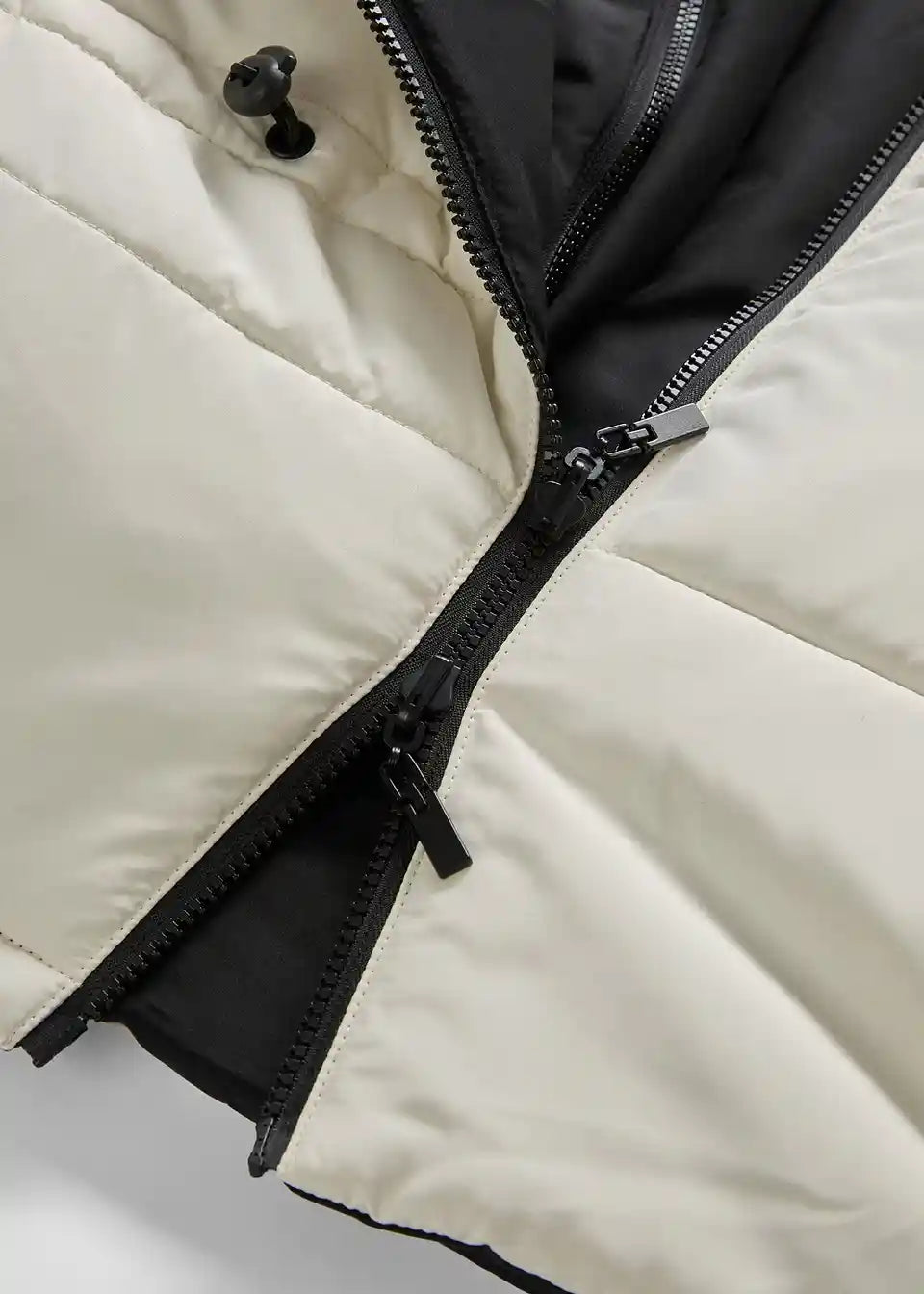 Warme wattierte Weste mit zwei Einsätzen: einen Erweiterungseinsatz für den Bauch während der Schwangerschaft und einen Trageeinsatz für das Baby. Sie verfügt über eine Kapuze für die Mutter und das Baby, die mit kleinen Kordelstoppern ausgestattet sind um sie individuell anzupassen.
