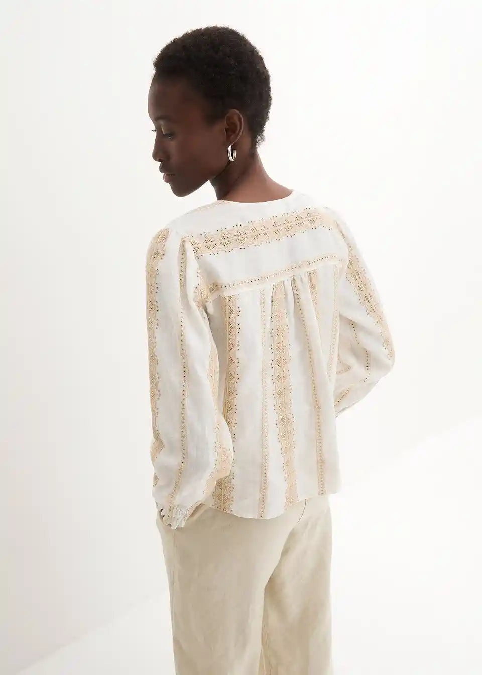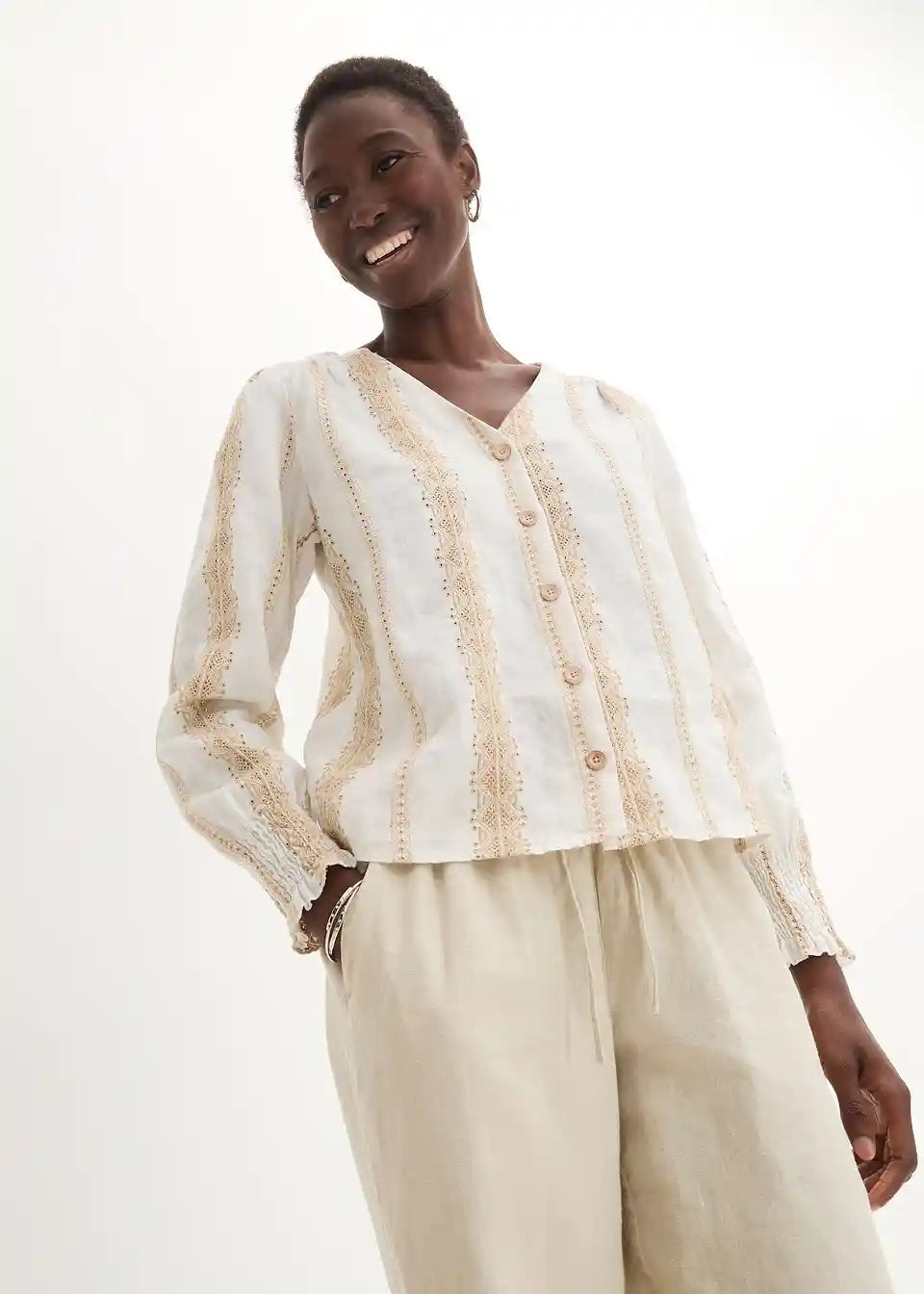 aparte Leinenbluse mit dekorativer Stickerei und Knöpfen in Holzoptik