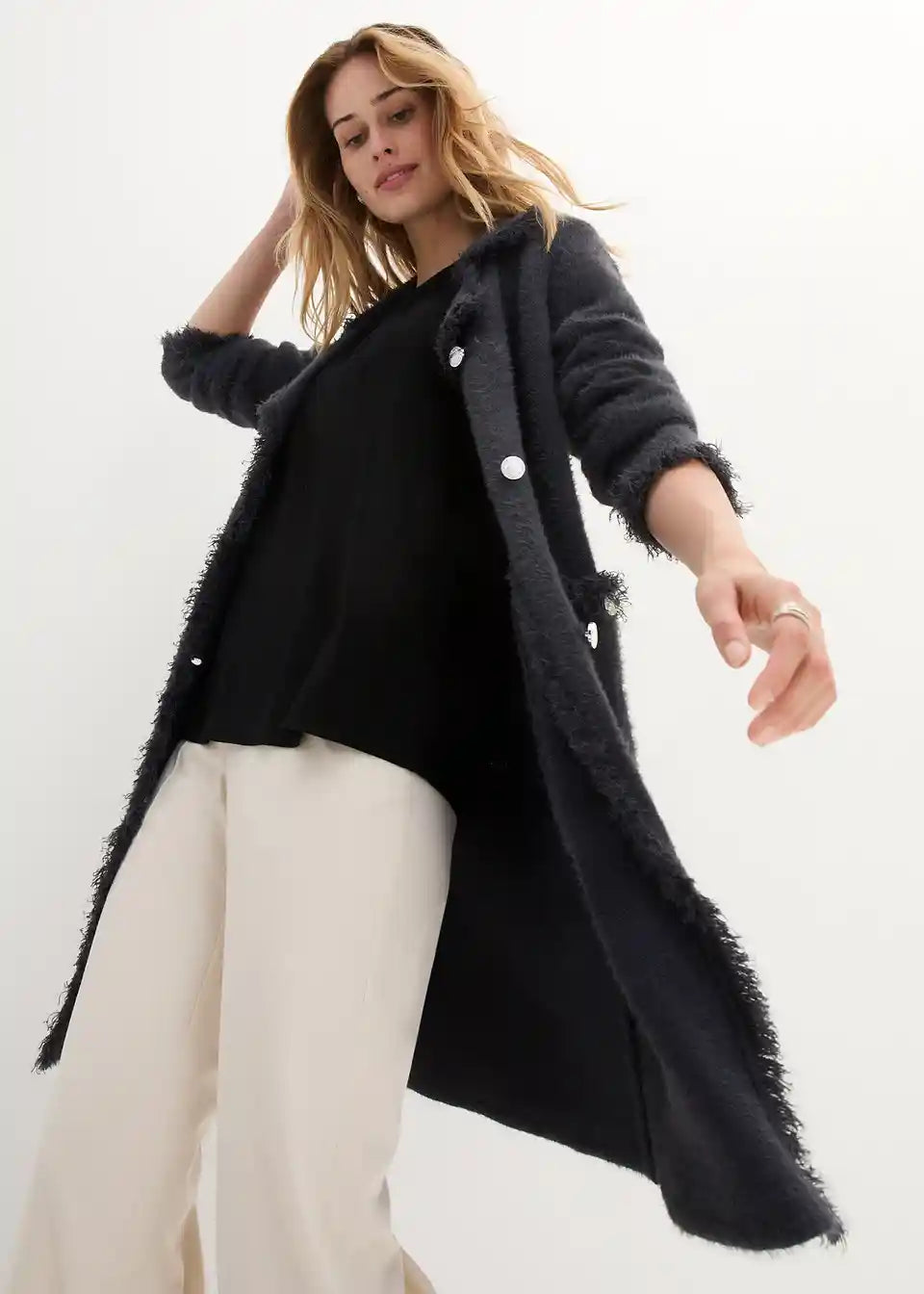 Der gepflegte Strickmantel ist mit fransigen Kanten und dekorativen Knöpfen versehen.