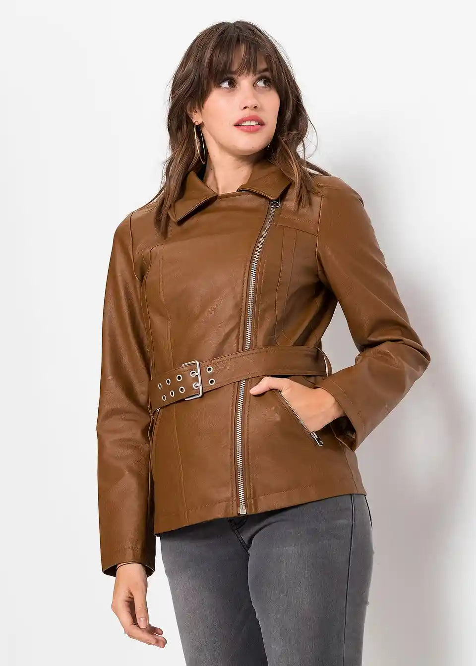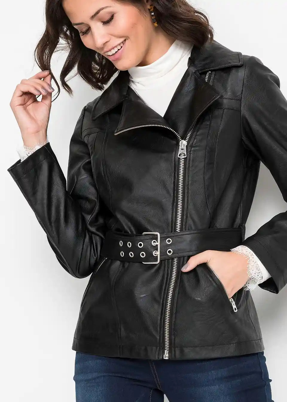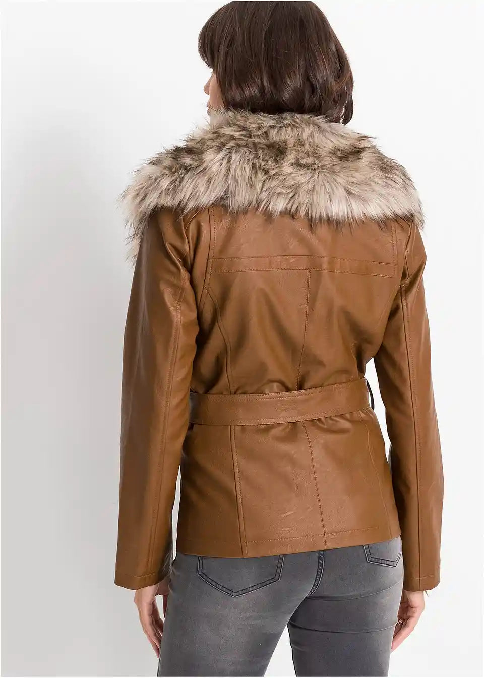Lederimitat-Jacke mit abnehmbarem Fellimitatkragen und einen Gürtel im Bereich der Taille. Länge in Gr. 38 ca. 64 cm.