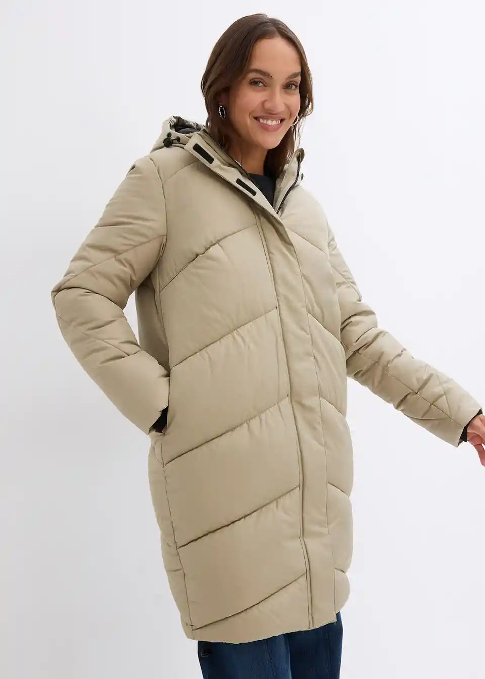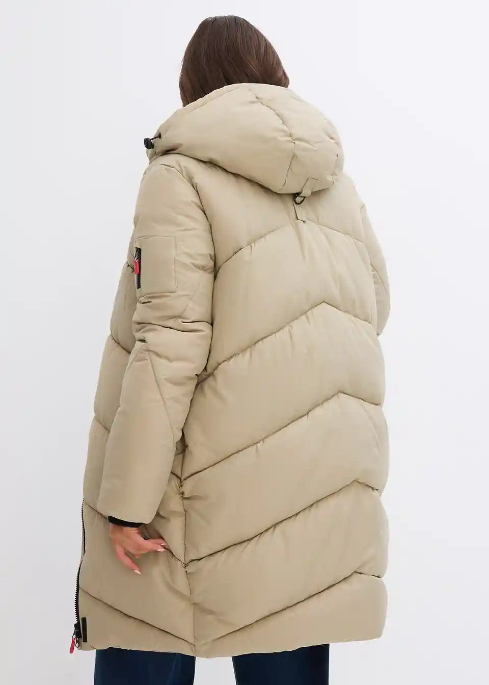 Modischer Steppmantel mit einer Reißverschlusstasche am Ärmel und einer Kapuze