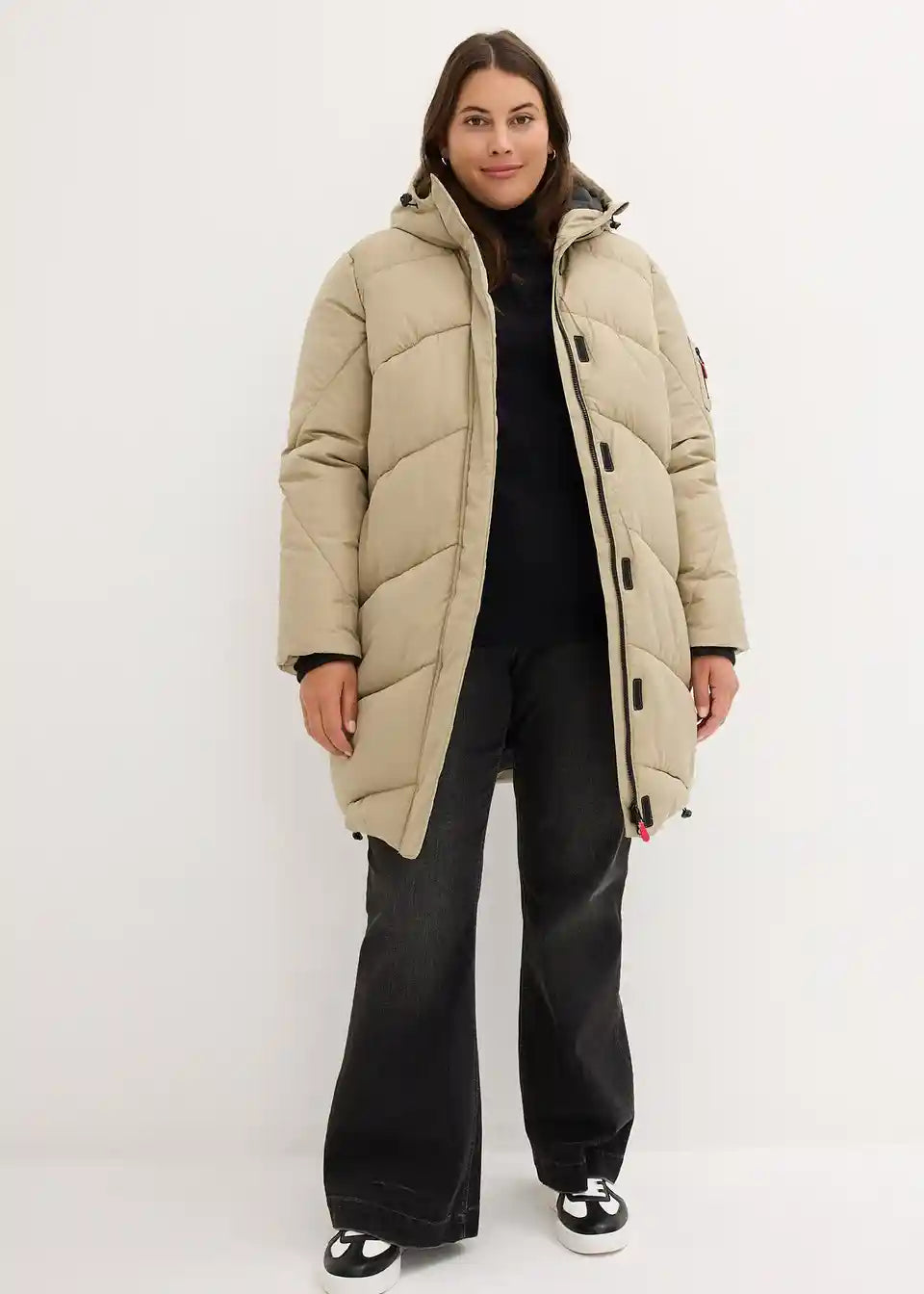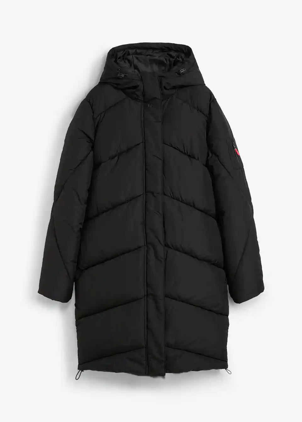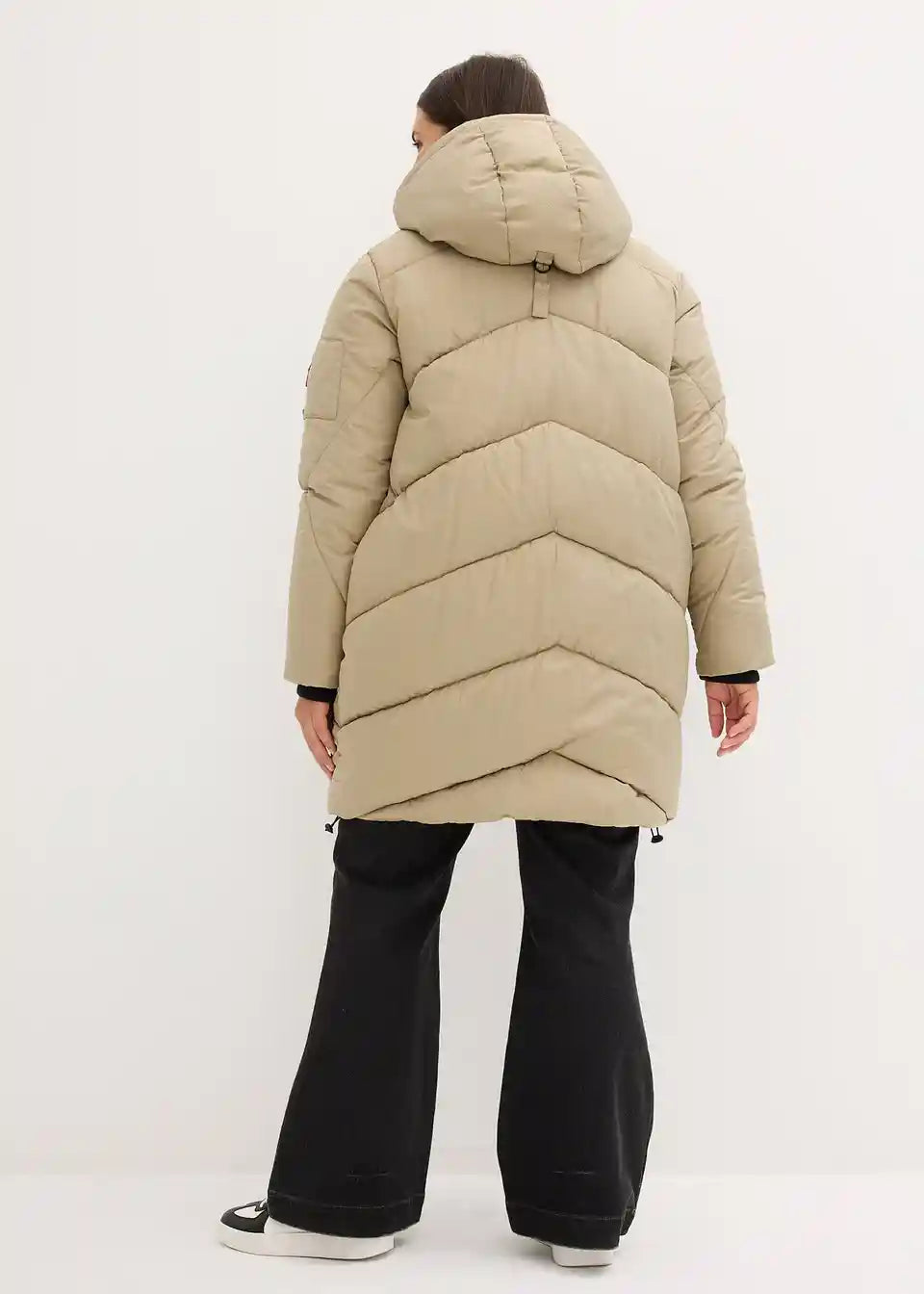Modischer Steppmantel mit einer Reißverschlusstasche am Ärmel und einer Kapuze