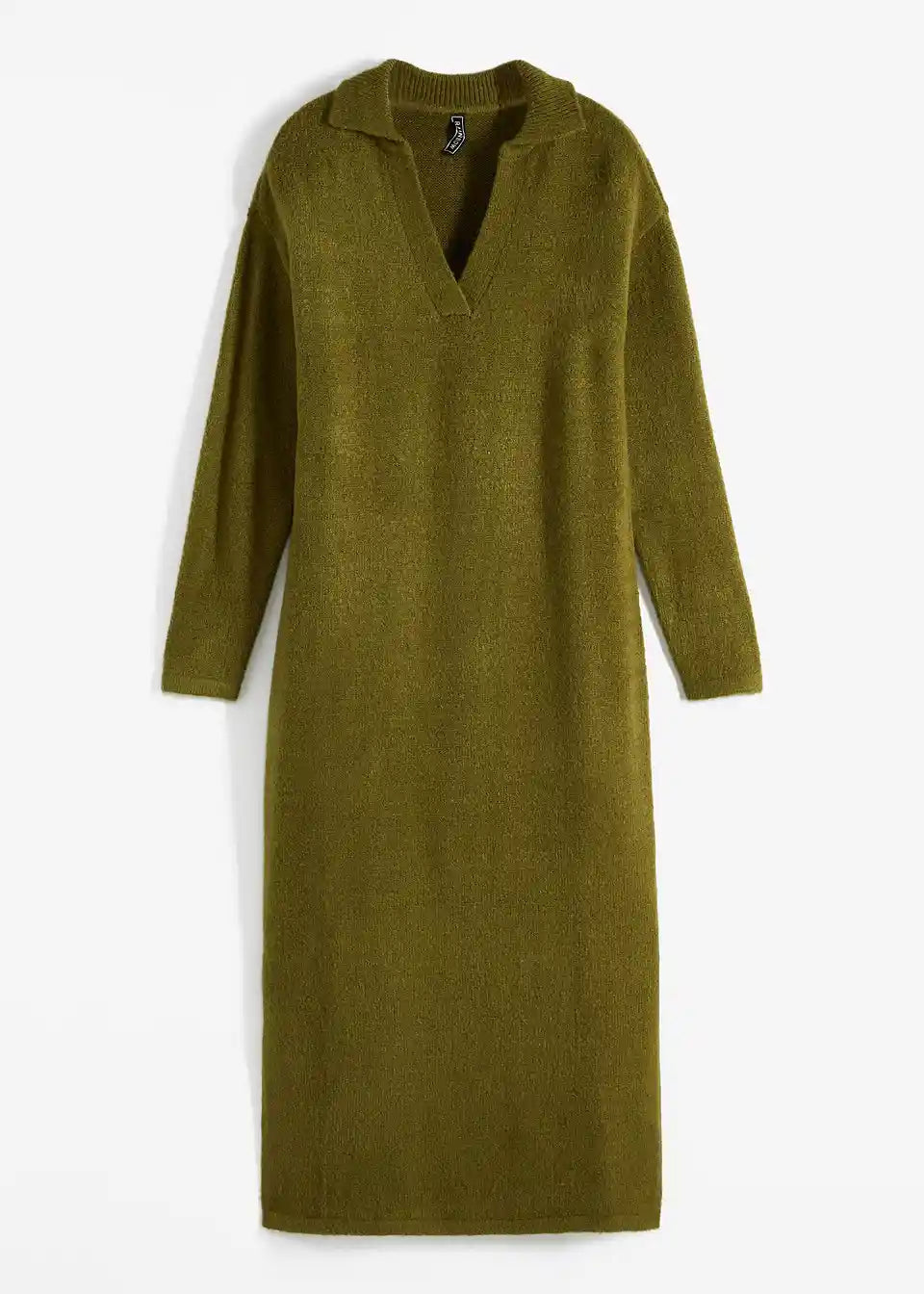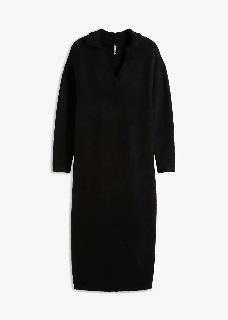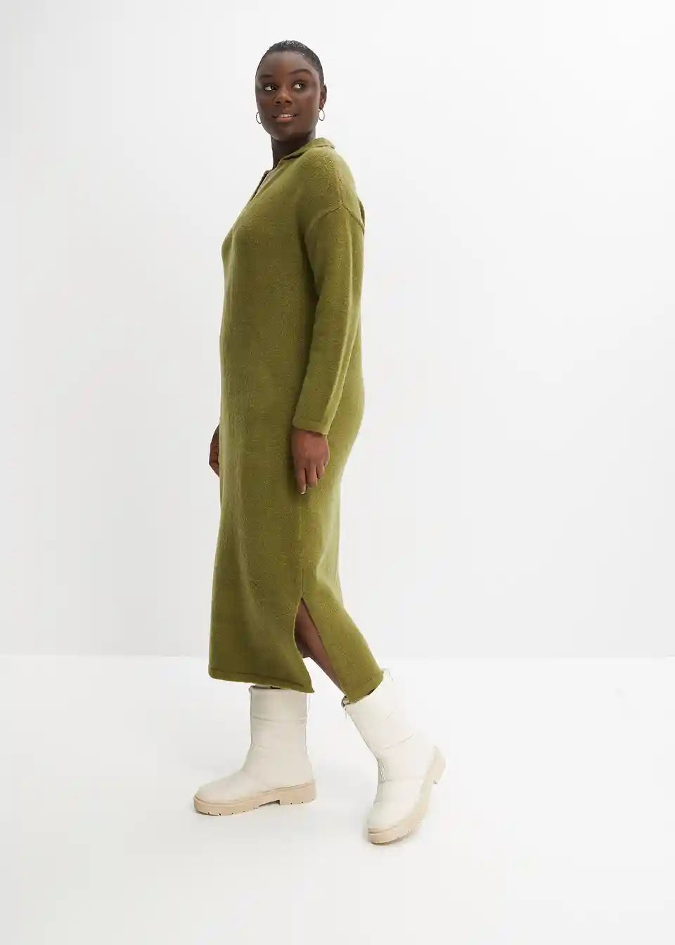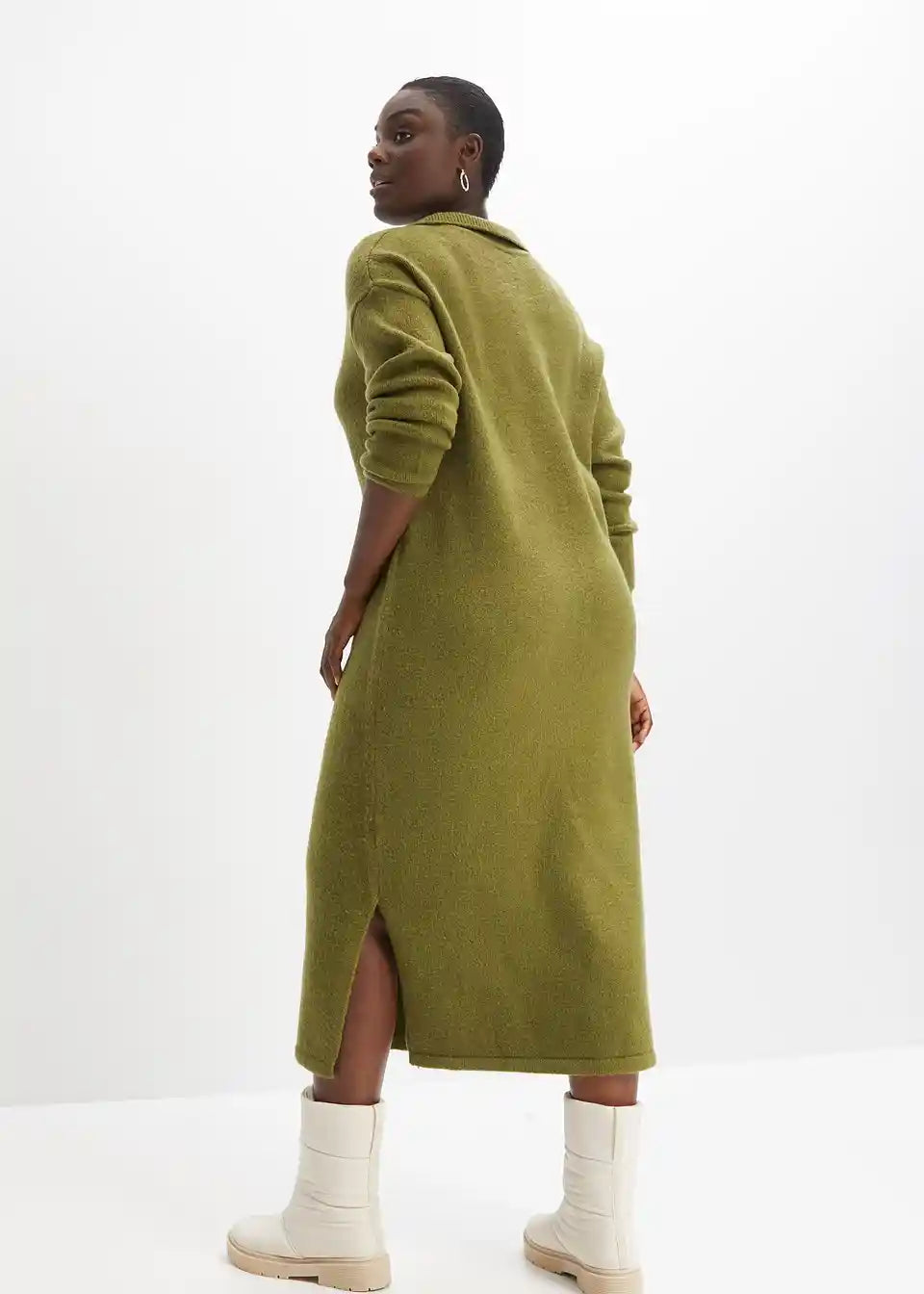 Langes Strickkleid mit Hemdkragen und Schlitz an der Seite
