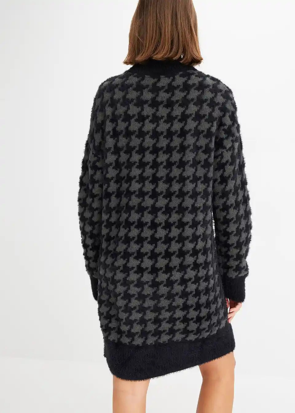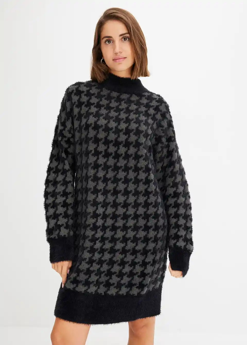 Angenehmes Strickkleid mit trendiger Hahnentritt-Optik und hohem Rundhalsausschnitt