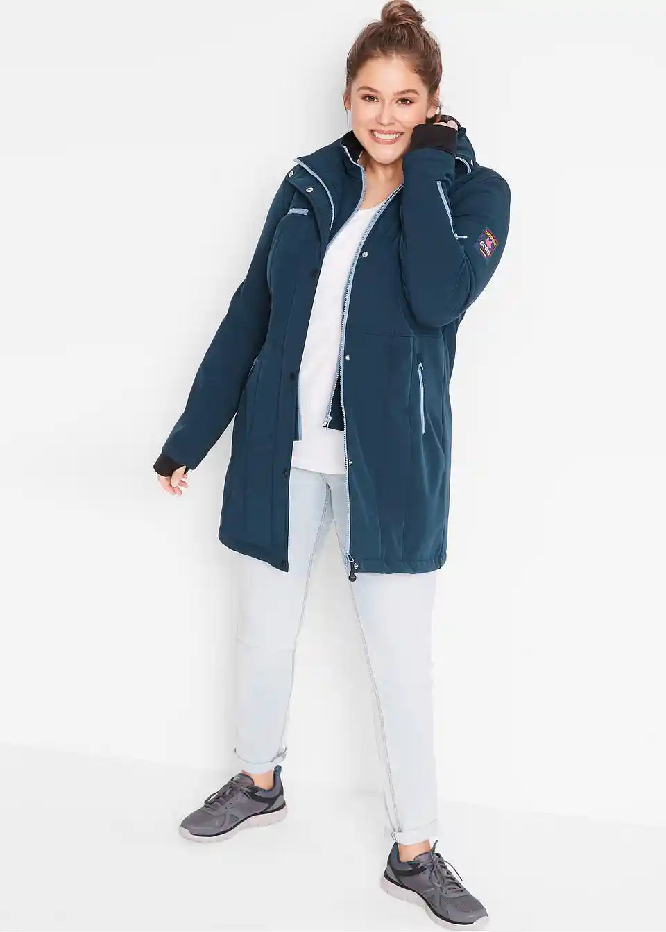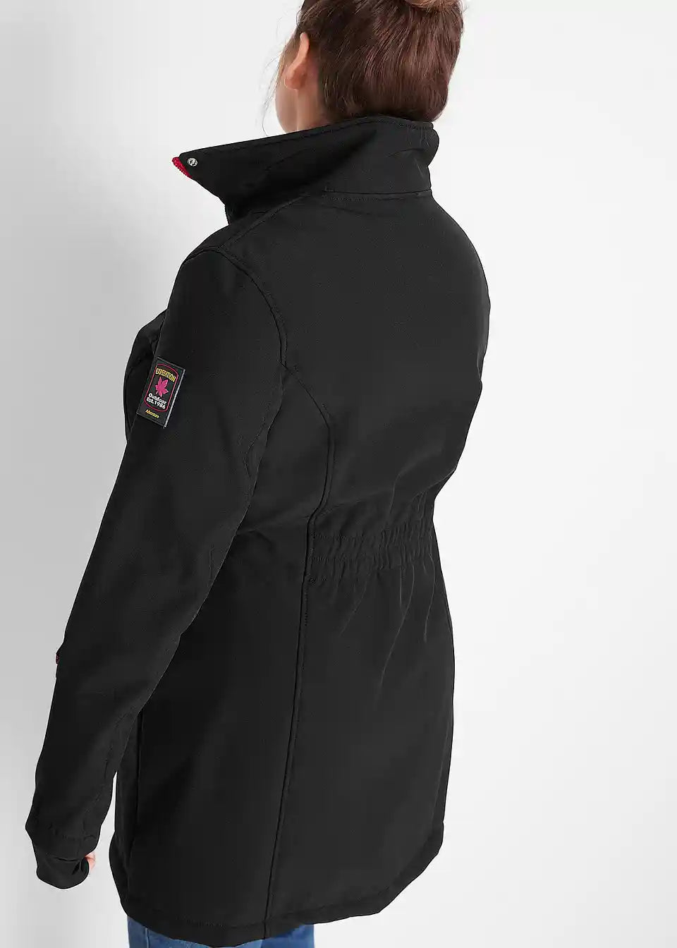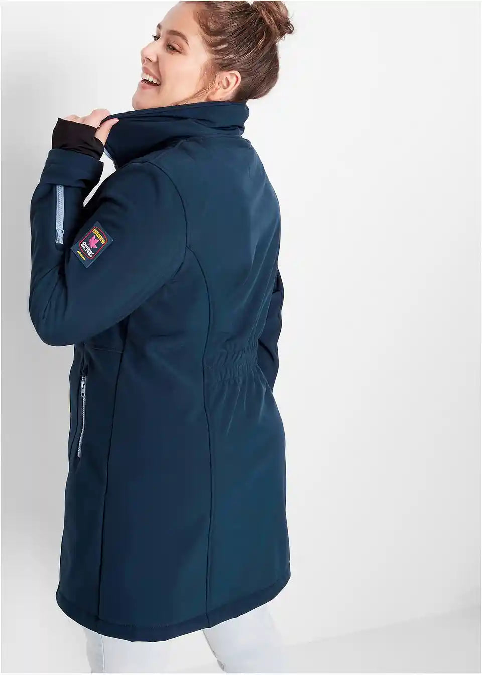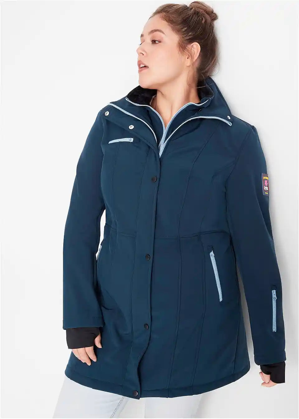 Diese atmungsaktive Stretch-Softshell-Langjacke von bpc schützt vor Wind und Nässe.Die Jacke zeigt sich in 2-in-1-Optik: Die untere Schicht ist wie eine Kurzjacke mit Reißverschluss gearbeitet. Sie hat einen Stehkragen mit Kunstfell auf der Innenseite. Darüber legt sich eine Windschutzleiste mit 2-Wege-Reißverschluss und Druckknöpfen sowie einem Elastikeinsatz im hinteren Taillenbereich. Vorne sind zwei Eingrifftaschen sowie eine Brusttasche mit Reißverschluss eingearbeitet. Am Ärmel sind ein weiterer Reißverschluss und ein Logopatch angesetzt. Innen hat die wasserabweisende Softshell-Jacke eine Tasche mit Kabelfunktion. Der Softshell-Kurzmantel ist von innen intensiv gerauht.
