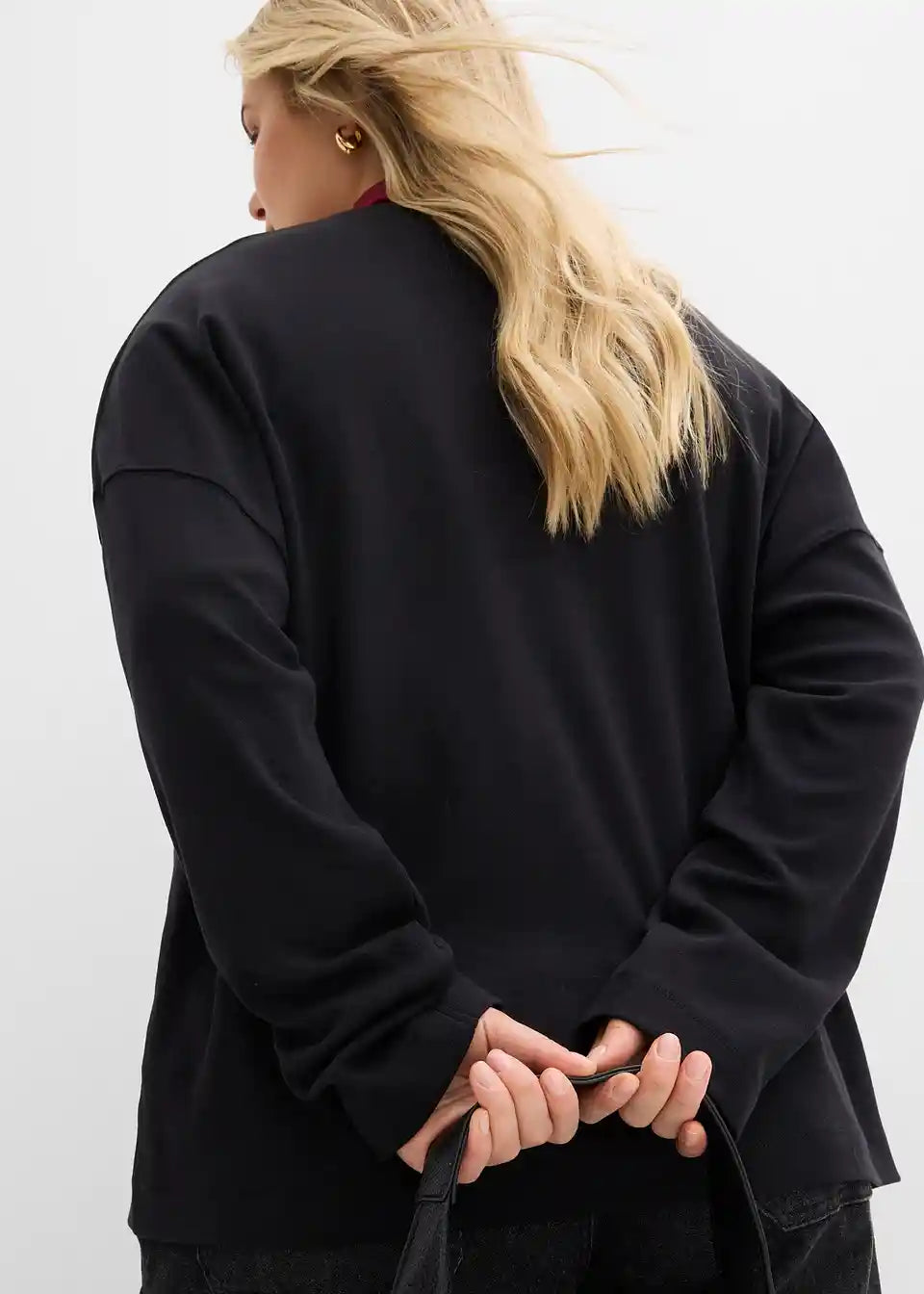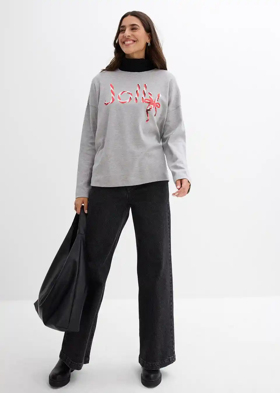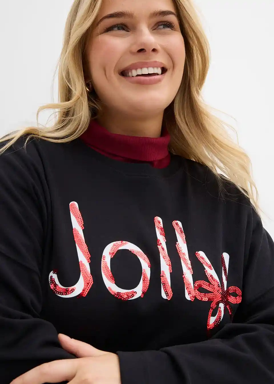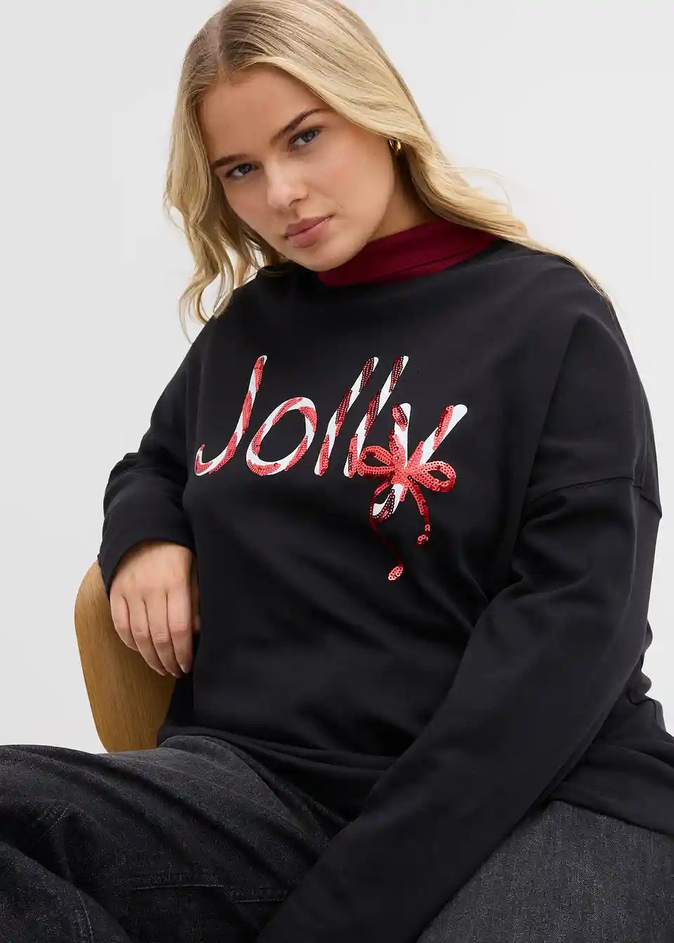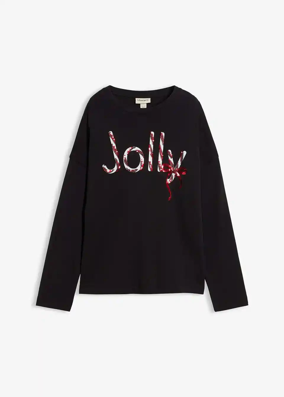 Weihnachtliches Baumwoll-Longsleeve mit Rundhals-Ausschnitt und Pailletten Schriftzug