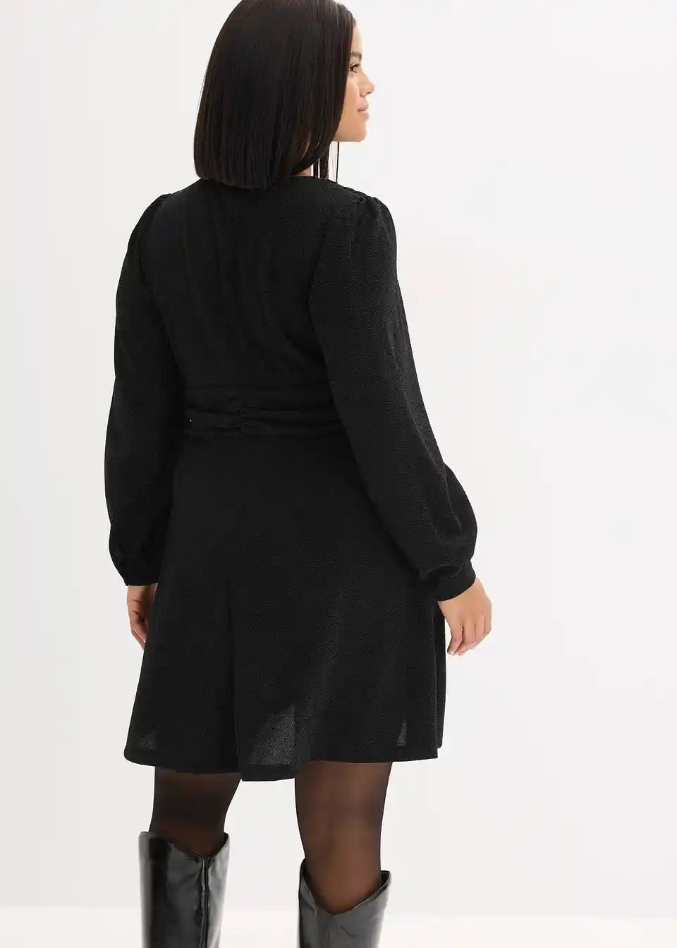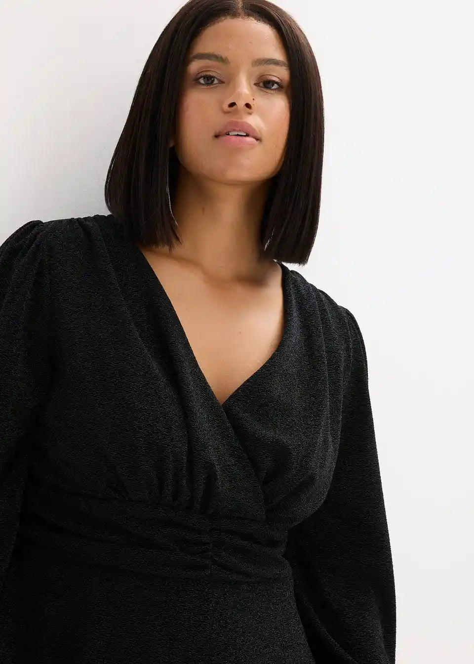 Modern und feminin: Ausgestelltes Minikleid aus glitzerndem Material in Wickel-Optik mit Ballon-Ärmel und Taillen-Einsatz